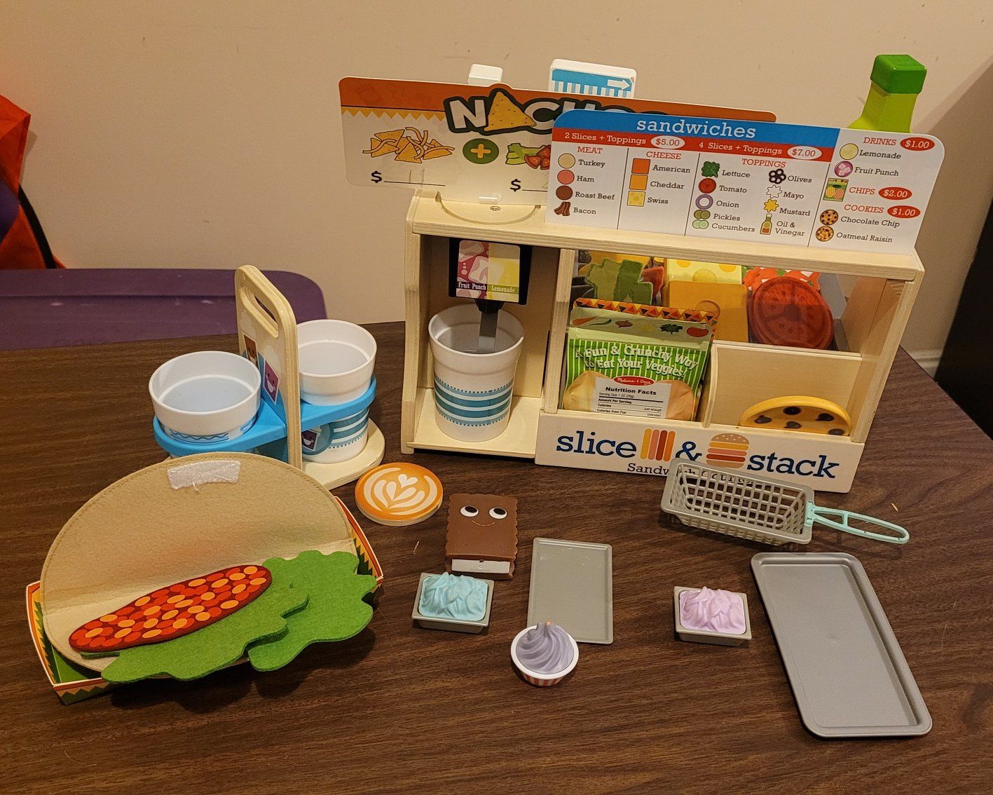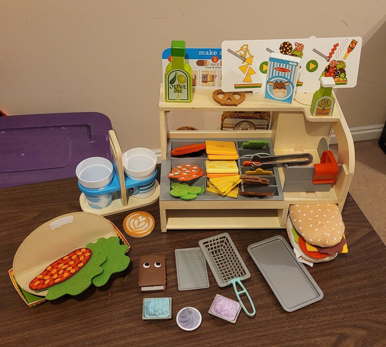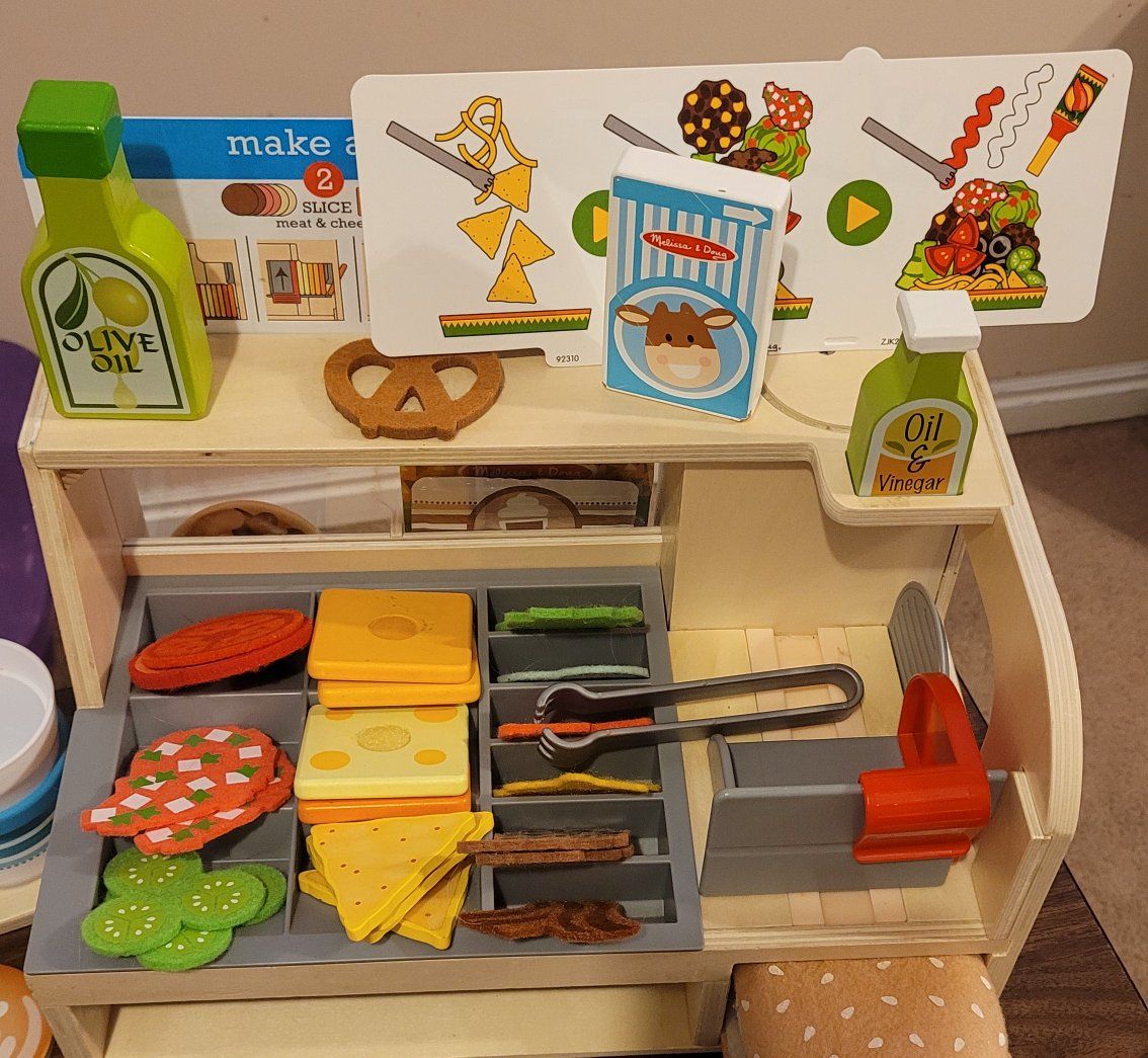 VenmoIncludes the items shown. Your child will have fun slicing, stacking, & serving sandwich creations, using a variety of toy food pieces, a working slicer & play kitchen accessories, for realistic cooking, customizing meals just like a real sandwich shop. Built-in toy storage makes for quick & easy cleanup inside the sturdy wooden counter.