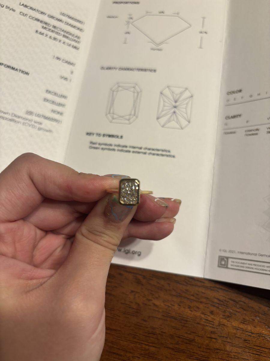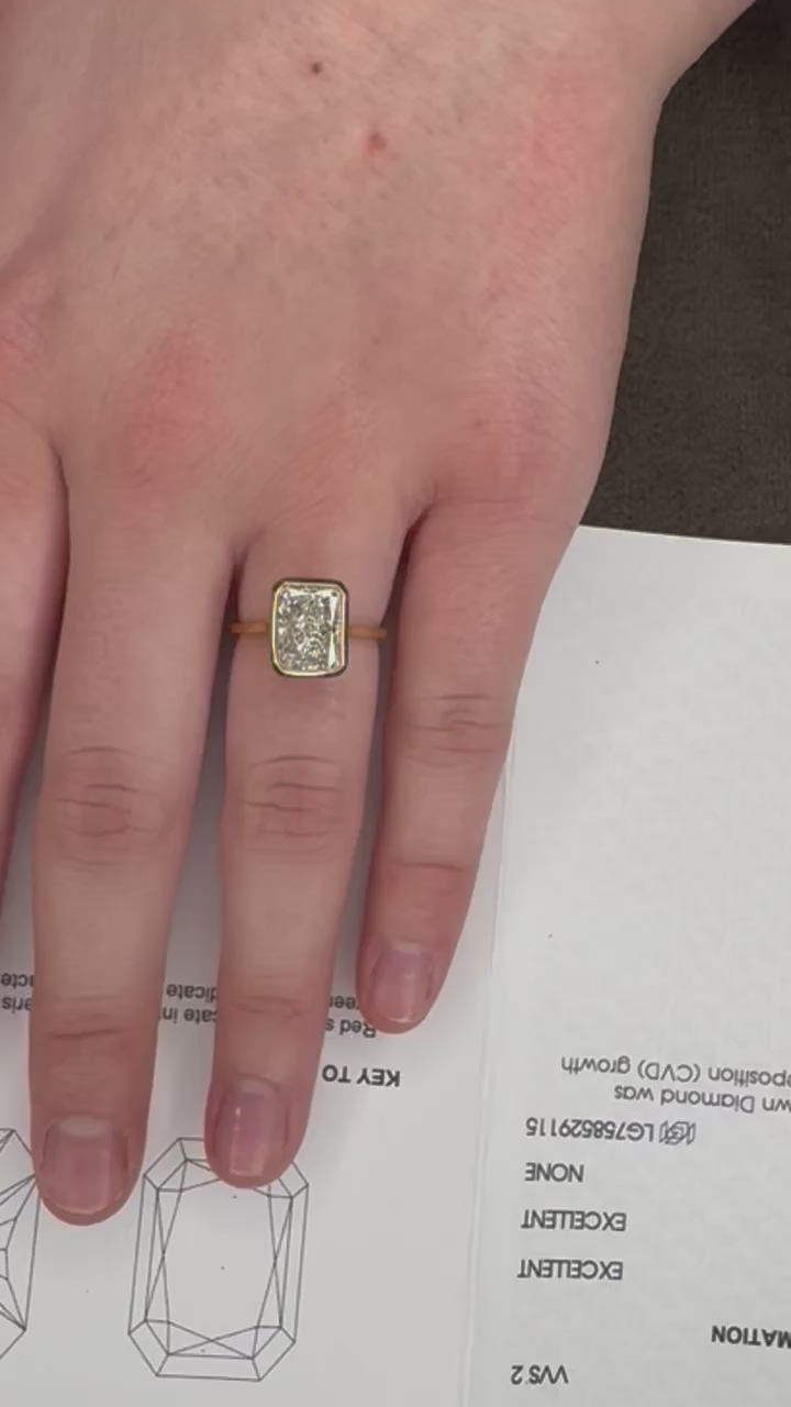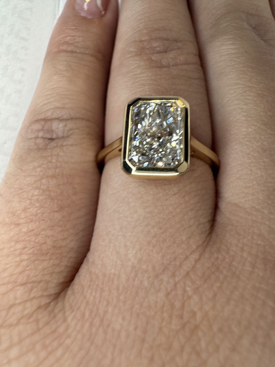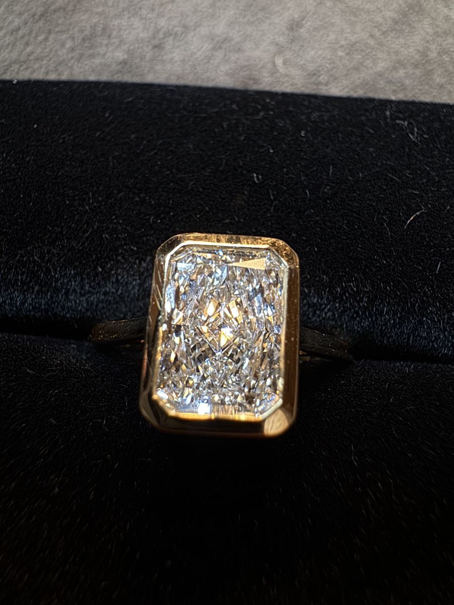 Size 6 - Stunning 18K gold with a bezel set cornered rectagular modified brilliant 1.99 ct nearly flawless lab grown diamond. Color grade E with a clarity grade vvs1. IGI report included.