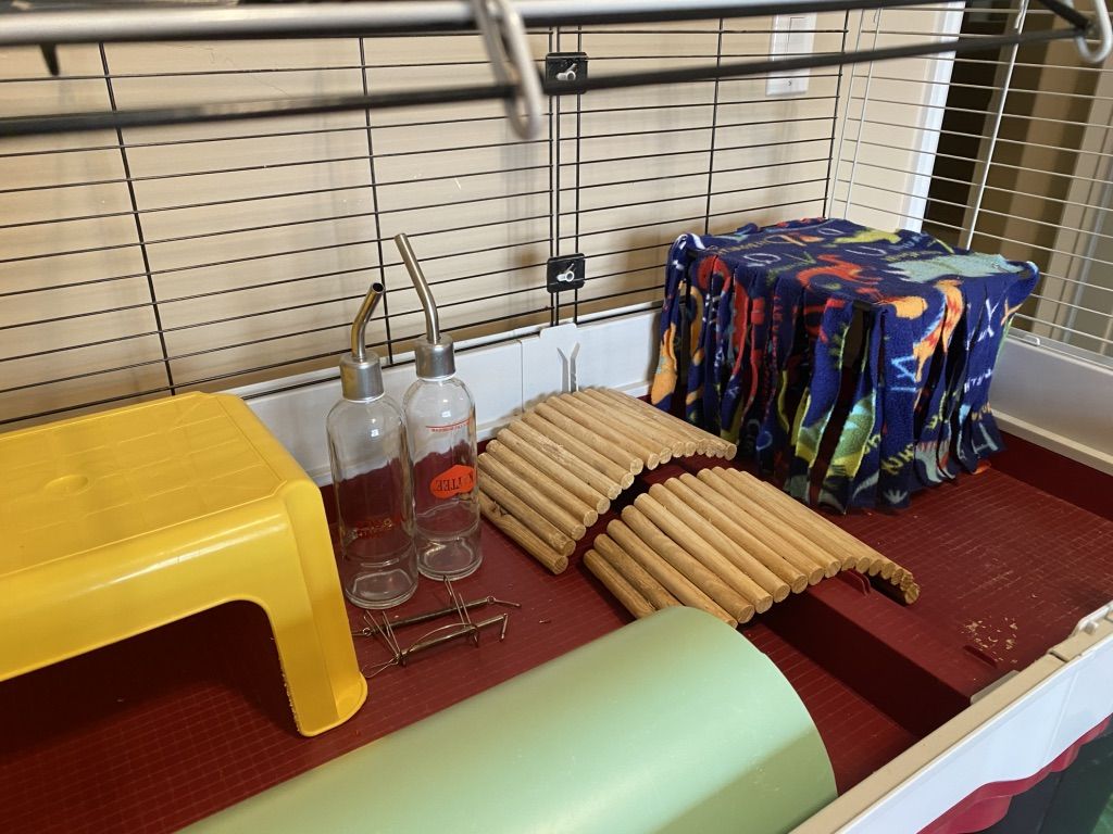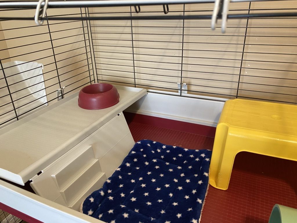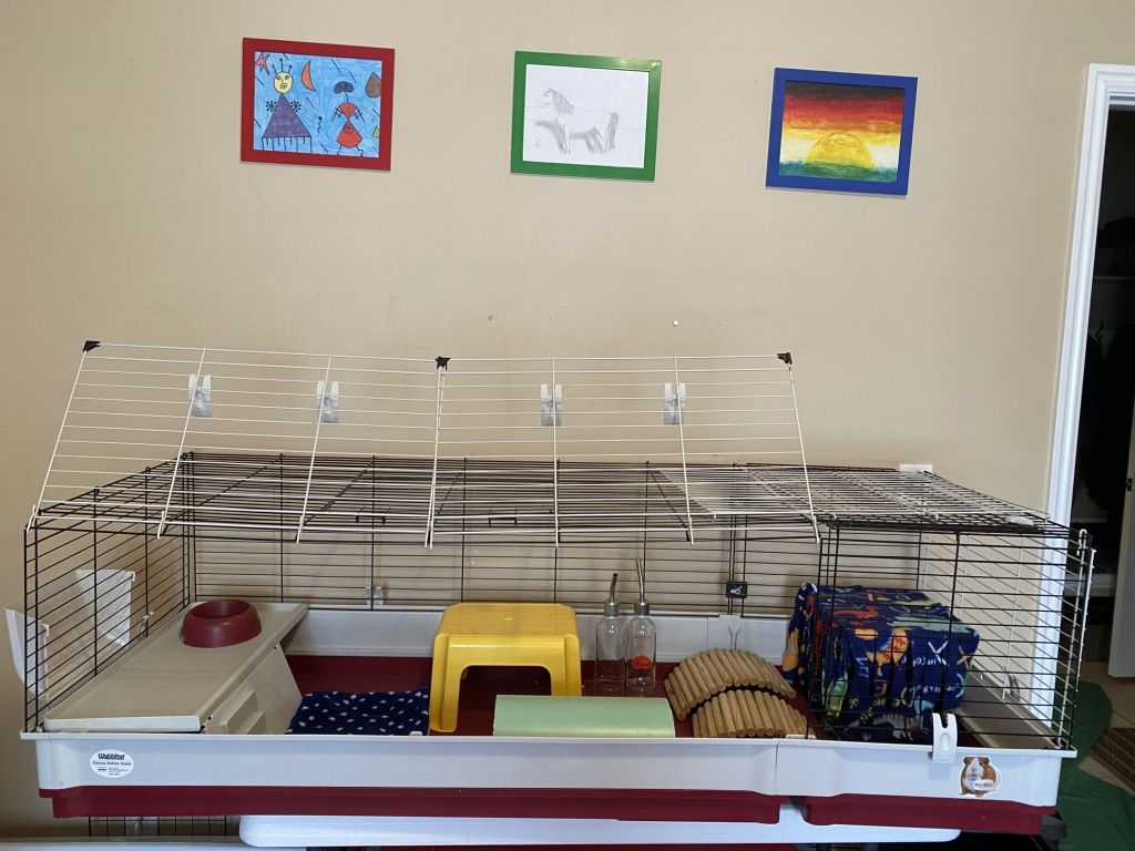 VenmoEverything you need (except bedding/liners, food & chew toys) for a pair of Guinea pigs or a small rabbit. (Rabbits should actually have much more roaming room, but this will work as a “home base.”) Secure & roomy Midwest Wabbitat XL cage with removable extension measures 5’ long (3.5’ without extensión), 2’ wide & 1.5’ tall. (This is the minimum recommended size for a pair of pigs.) Large doors that run the length of the cage make it easy to access pets & clean. Includes removable platform that doubles as a hide (we removed this for our Guinea pigs because they don’t jump), food bowl, & slightly janky hay rack (again, we didn’t use this because pigs like their hay in a pile). I’m throwing in several extras — 2 glass water bottles, 2 wooden bridges, an indestructible & easy-to-clean PVC tube (better than anything you’ll find at a pet store & big enough for a large adult Guinea pig), a low plastic stool (used as a free-standing hide after we took out the platform), two soft beds, & a homemade “fleece forest” hide (which pigs love!) The cage & extension alone cost over $150 new, so this is a steal! Everything is used, but still in great shape. See my other listings for more available guinea pig items.