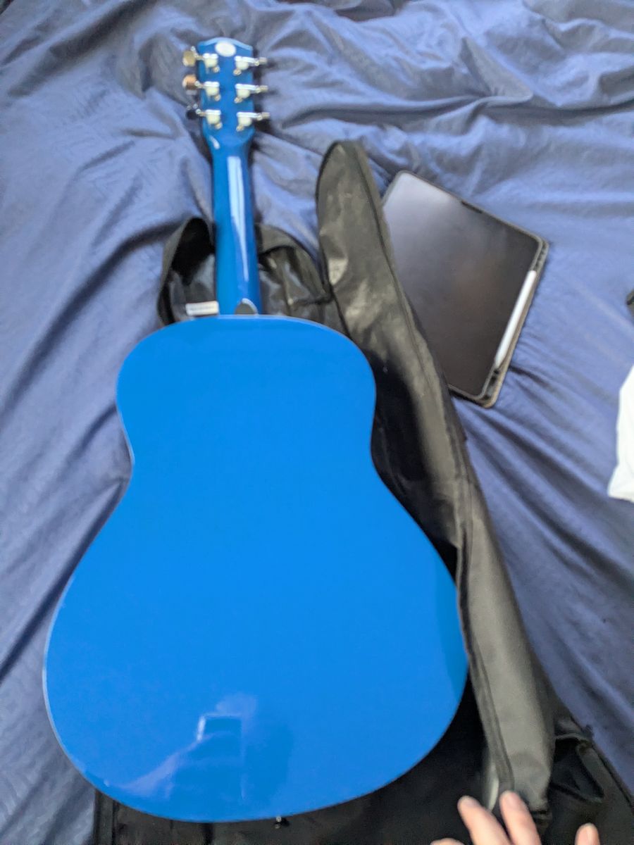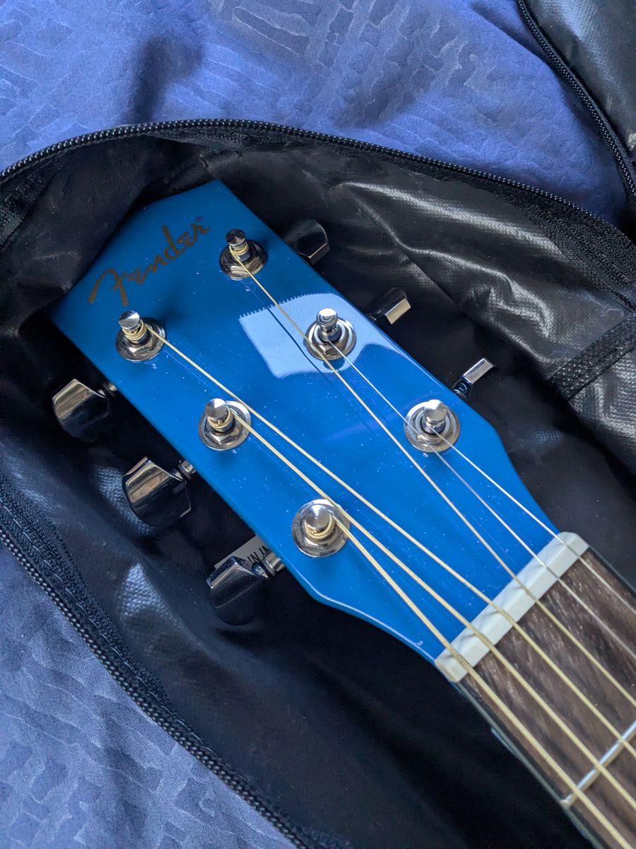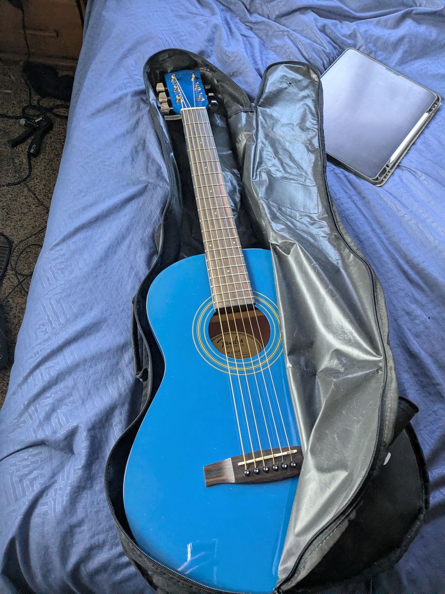PayPalThis is a Blue Fender Acoustic steel string guitar. It has a ding on the neck that is cosmetic. It stays in tune. It has a bright, kind of brassy tone. I adjusted the truss rod slightly so the action is a little nicer. It is a beginner guitar, or a good camping guitar. Comes with a cheap padded case. These are $140 new.