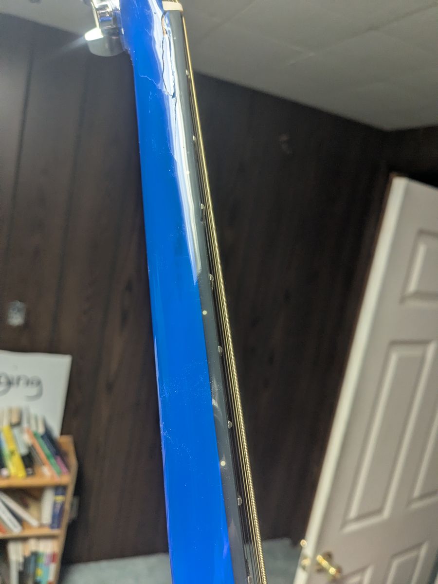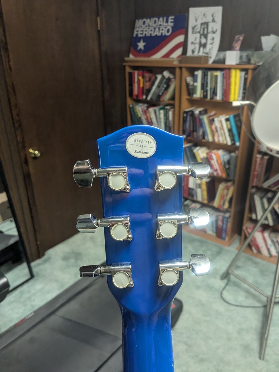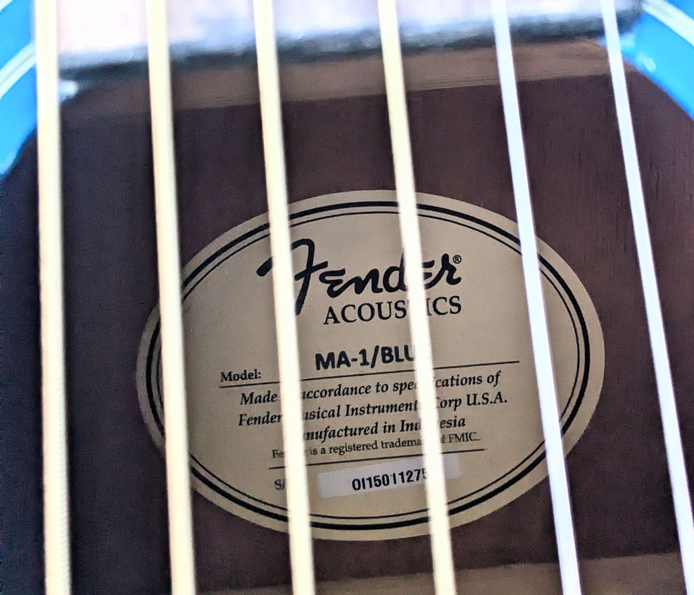 PayPalThis is a Blue Fender Acoustic steel string guitar. It has a ding on the neck that is cosmetic. It stays in tune. It has a bright, kind of brassy tone. I adjusted the truss rod slightly so the action is a little nicer. It is a beginner guitar, or a good camping guitar. Comes with a cheap padded case. These are $140 new.