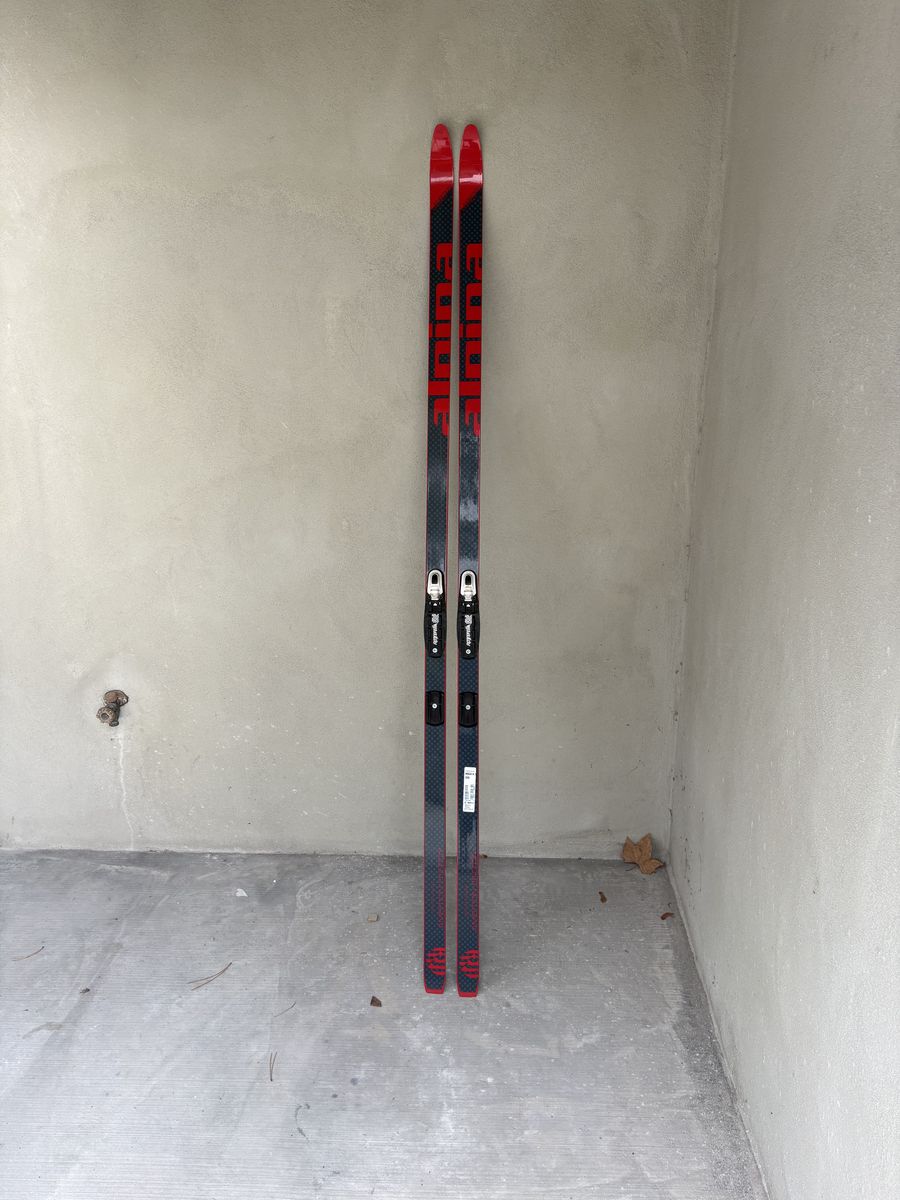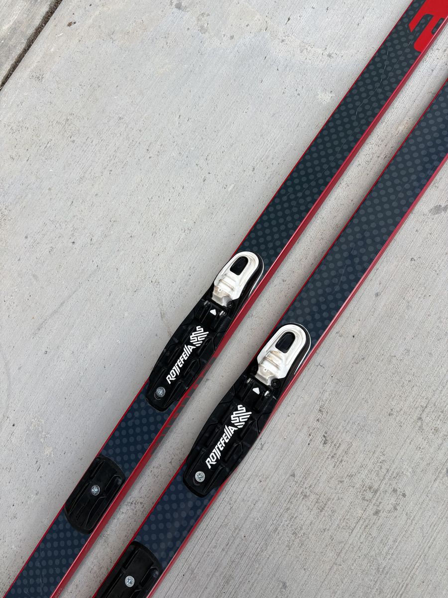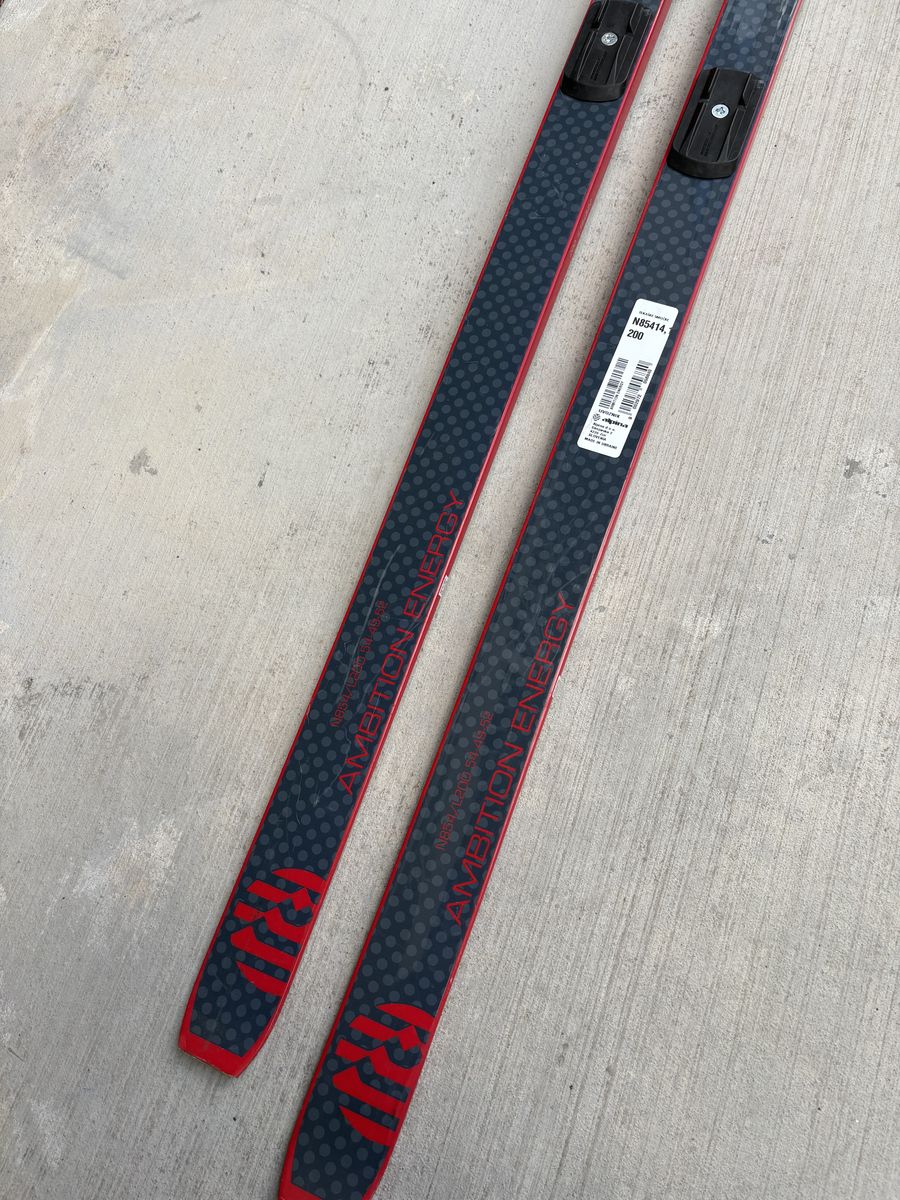 Skis are $199 brand new, boots are $130 brand new, still in box. Skis have a fish-scale grip pattern