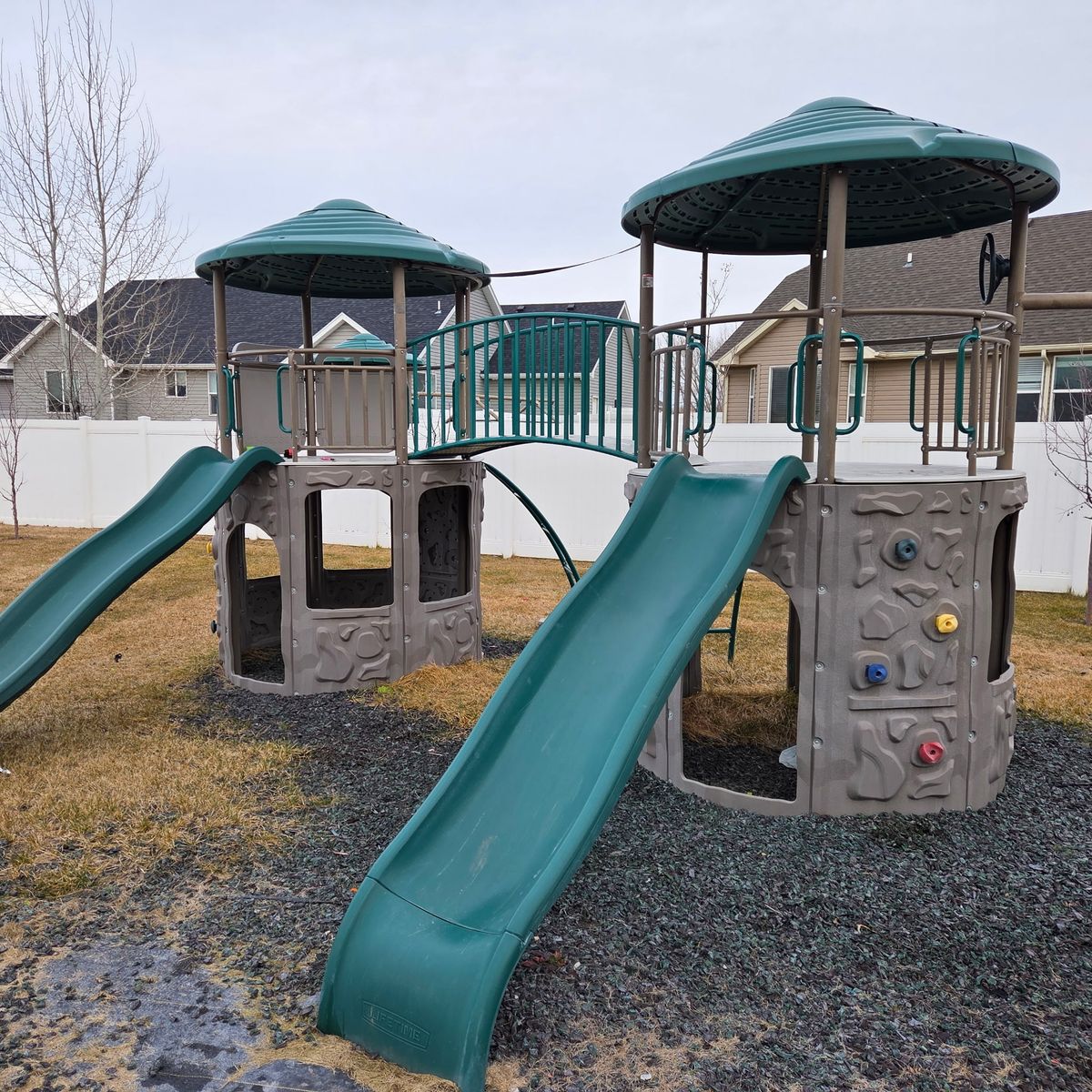 This is one of the large, heavy-duty models with: • Spacious clubhouse/play deck • Multiple swings • Large slide • Monkey bars • Rock wall / climbing features • Powder-coated steel frame (no rot, no splinters) • UV-protected plastic panels