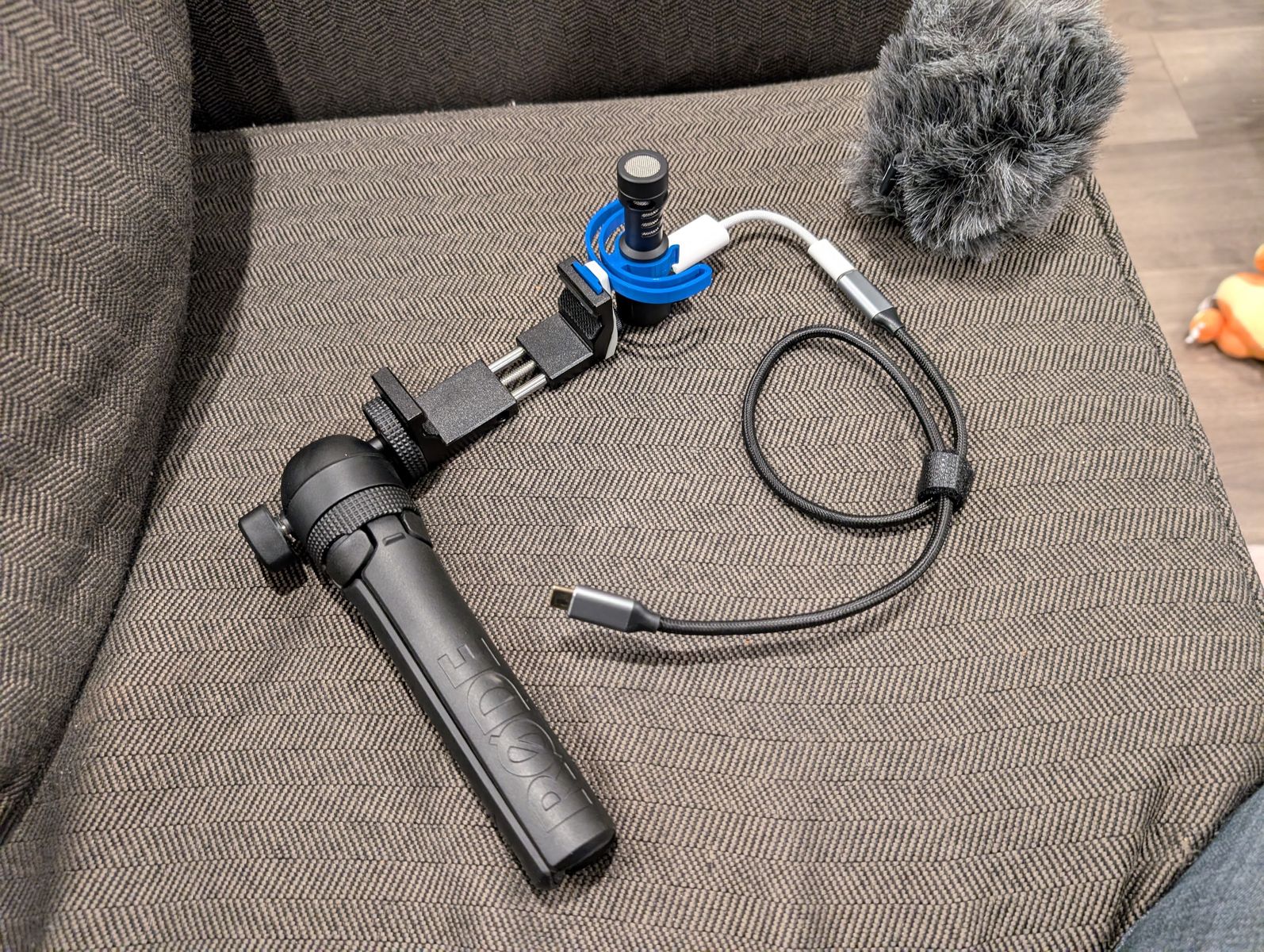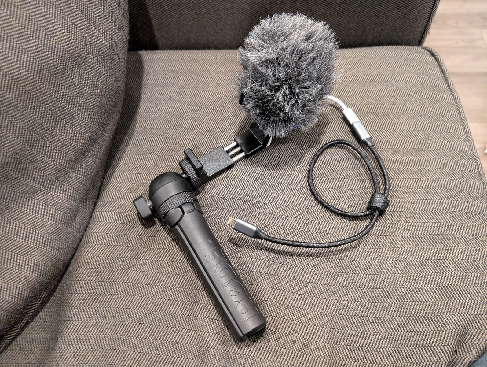 GooglePayThis is an awesome setup for recording videos with your phone and getting great audio quality! The tripod is super heavy duty and well made plus the phone clip works even with phones with cases or wallets on the back! The microphone is originally for iphones with lightning cables but I've added an adapter that allows it to work with USB-C phones as well. Works as a tripod or collapses into a handle for taking videos on the go. Flip the microphone backwards or forwards based on which direction you want to shoot. Lots of these available!