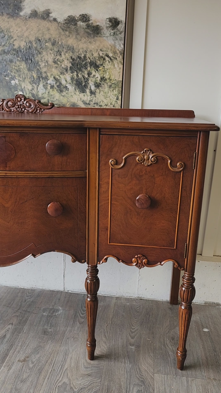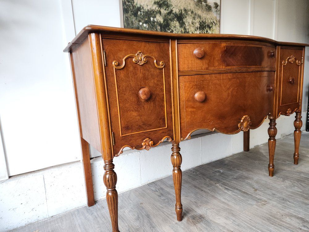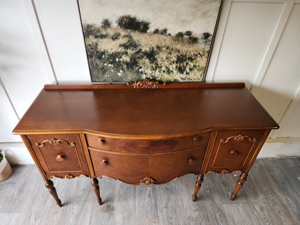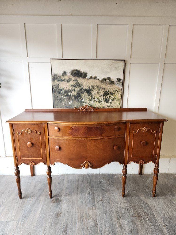 VenmoBeautiful antique Jacobean style buffet sideboard featuring elegant curves, carved details, and classic turned legs. The piece offers a great combination of storage with side cabinets and spacious drawers that all slide with ease. The warm wood tone and traditional craftsmanship make it a timeless statement piece for a dining room, entryway, or living space.