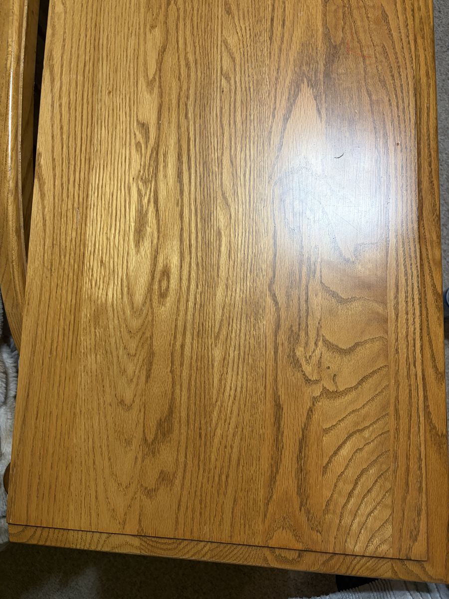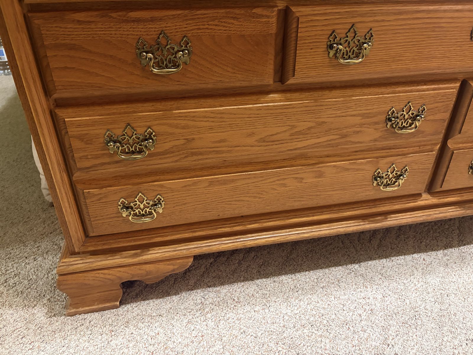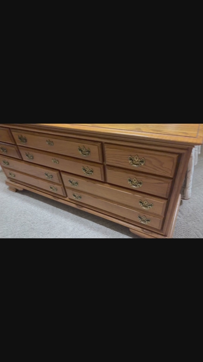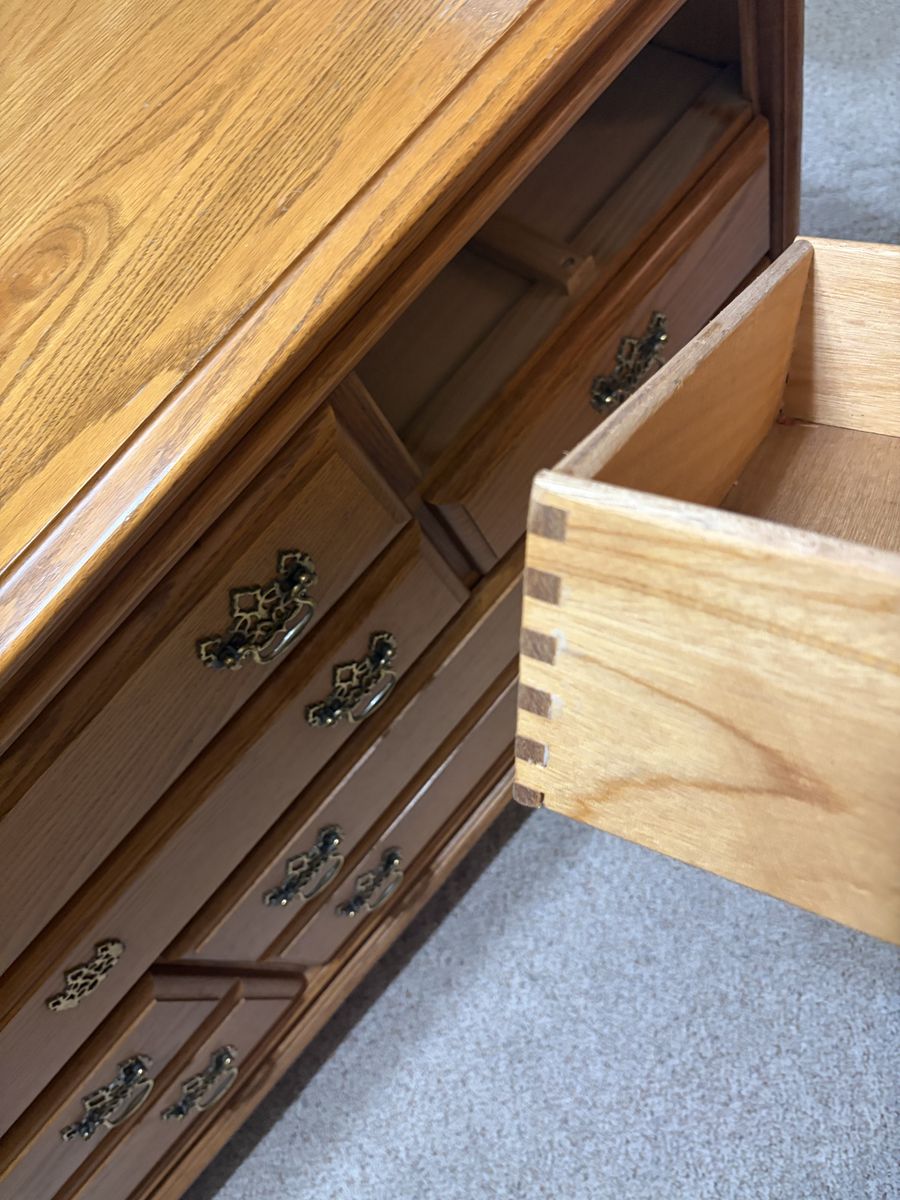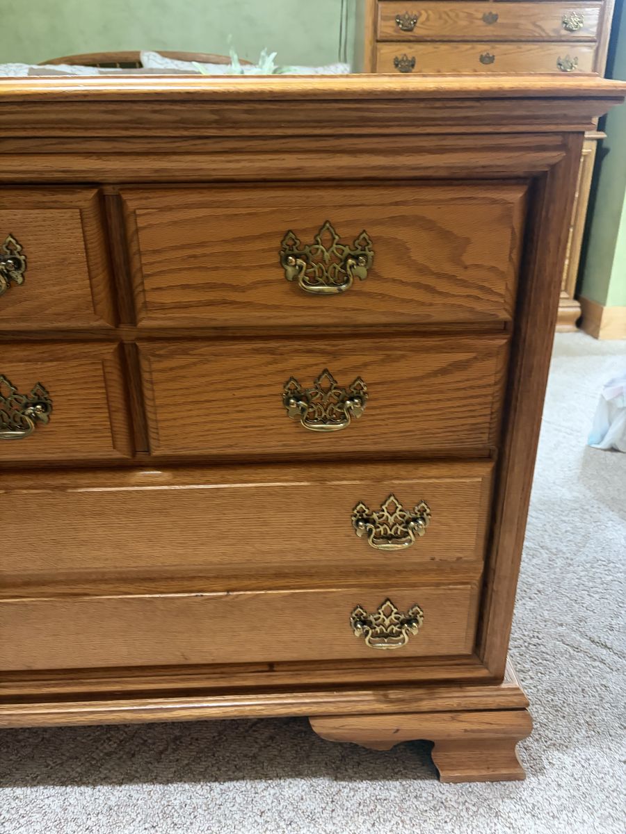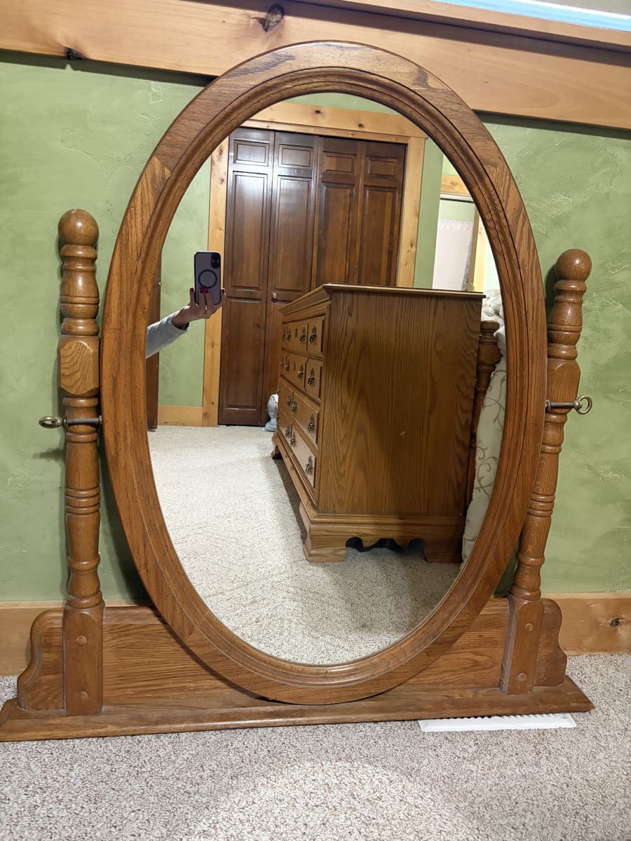 ApplePayClassic oak wood dresser and matching oval cheval mirror. Dresser has six drawers, all with decorative brass handles. Drawers have dovetail joinery, super sturdy. Mirror is a nice size, tilts easily. Great set for a bedroom.