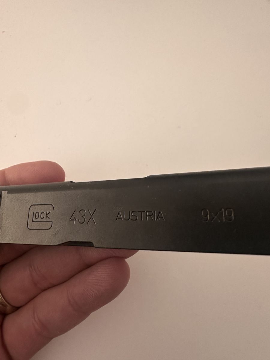 Stripped Glock 43x slide for sale. Great condition - no scratches or nicks on the outside. Normal wear on the inside. Does not include barrel or recoil spring.