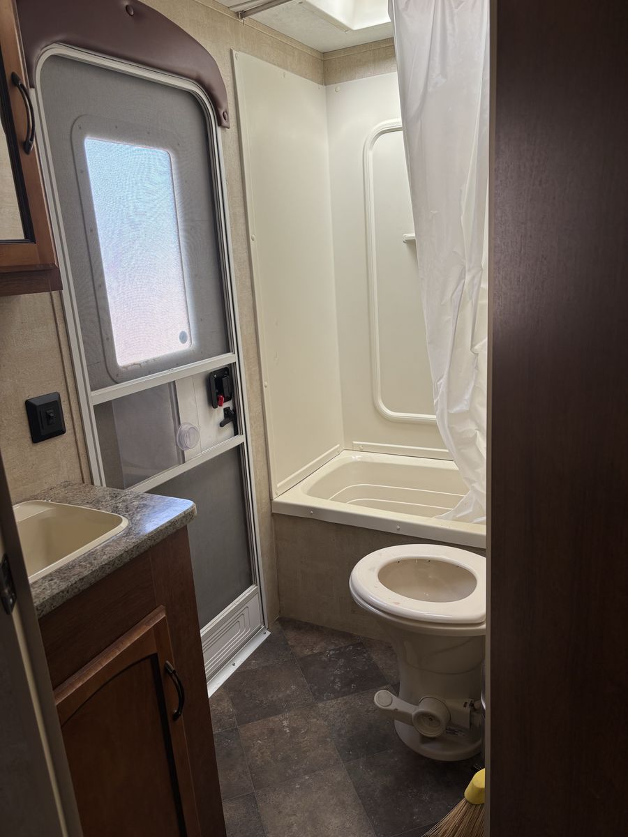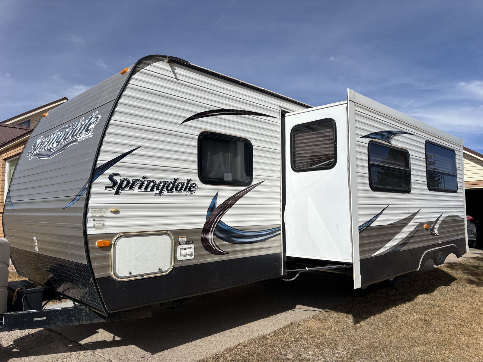 2014 SG282 Keystone Springdale Bunkhouse 32 Foot Bumper pull duel axle Comes with 3500 champion quiet generator Comes with a cover Private front queen bedroom with overhead cabinets, side storage, and under bed storage Double bunks in the rear with large storage under accessable from outside Dinette converts for additional sleeping space Large counter space Double sink Microwave & oven Full-size refrigerator Plenty of cabinet storage Bath with shower & toilet with outside access