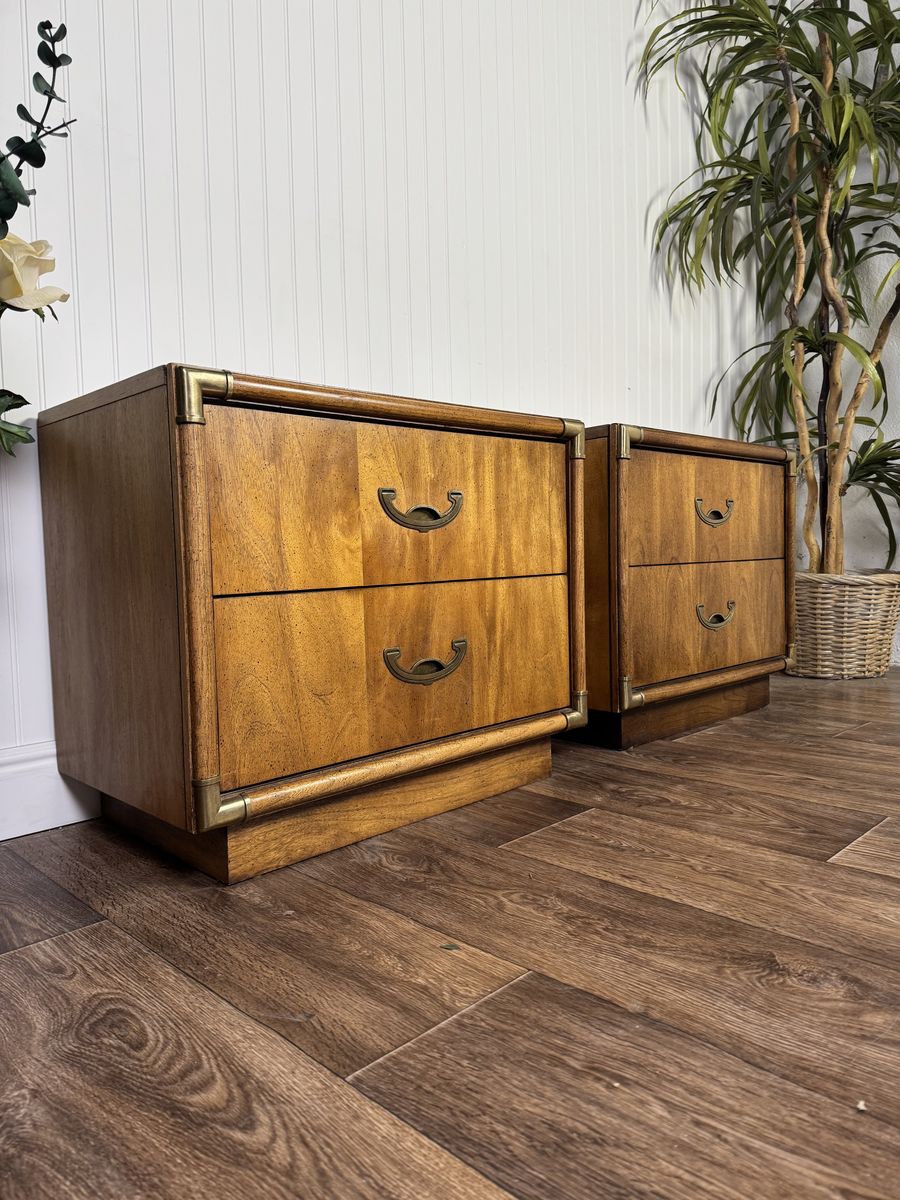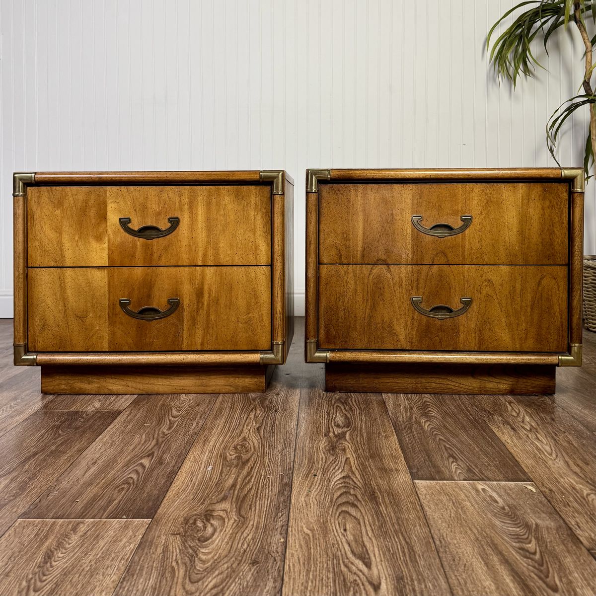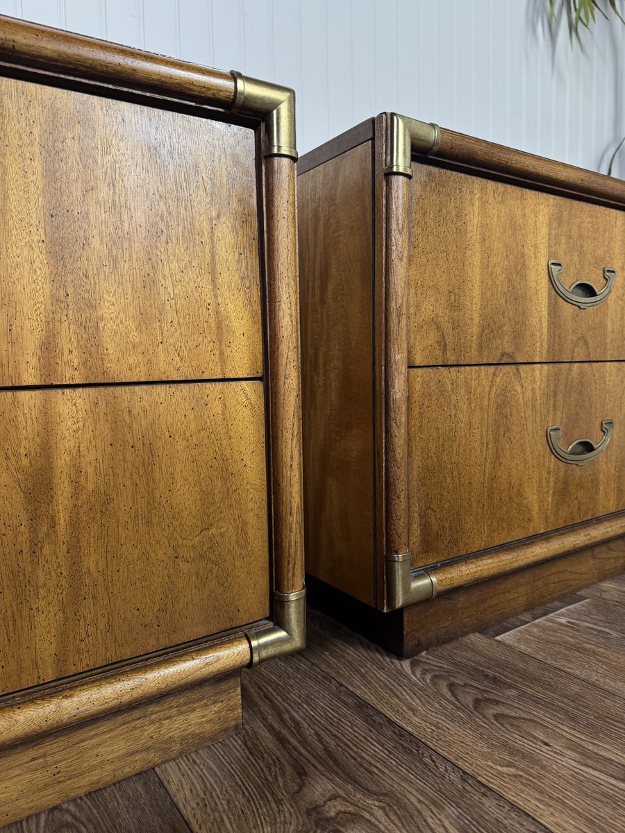VenmoVintage pair of mid-century modern nightstands featuring warm, honey-toned wood grain, plinth bases, two dovetailed drawers each, brass-toned corner guards, and recessed crescent bail pulls. Some minor signs of wear but overall good condition.