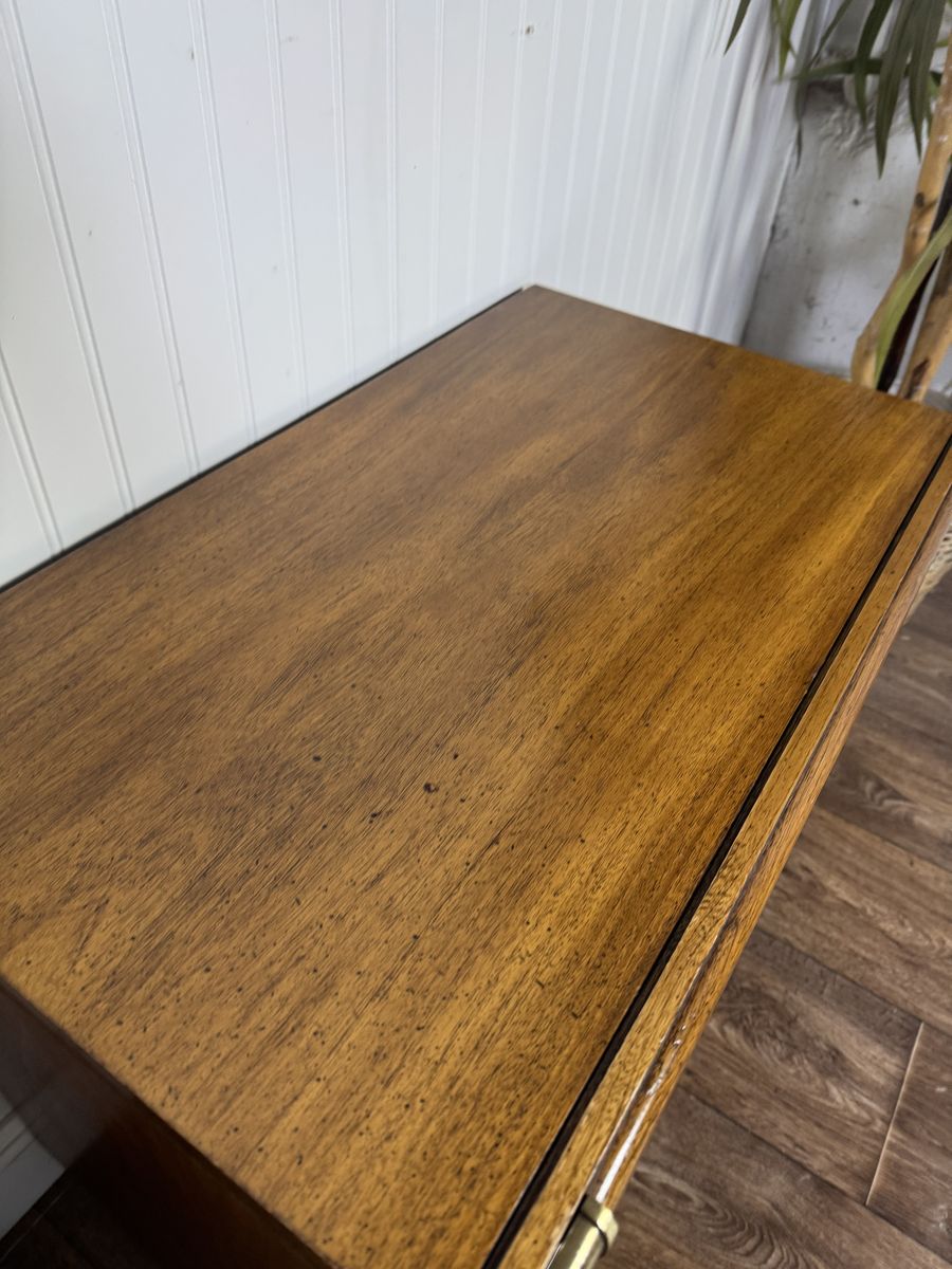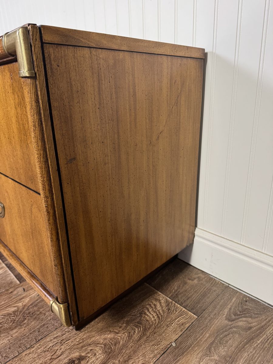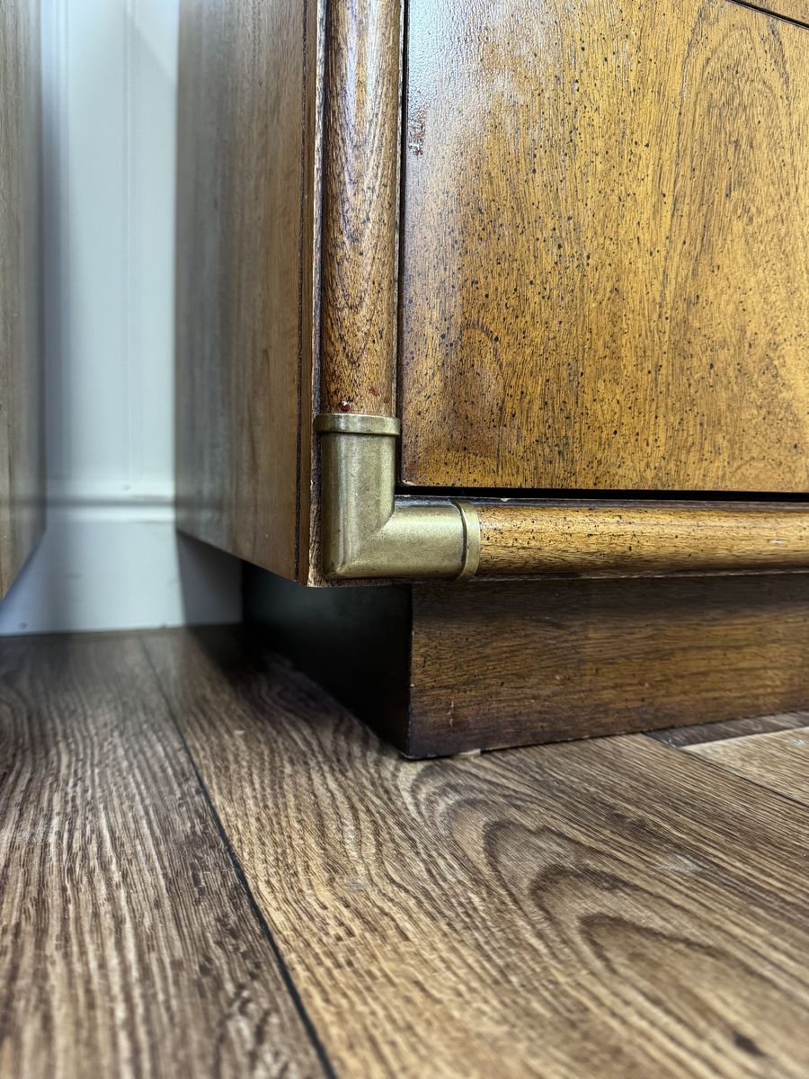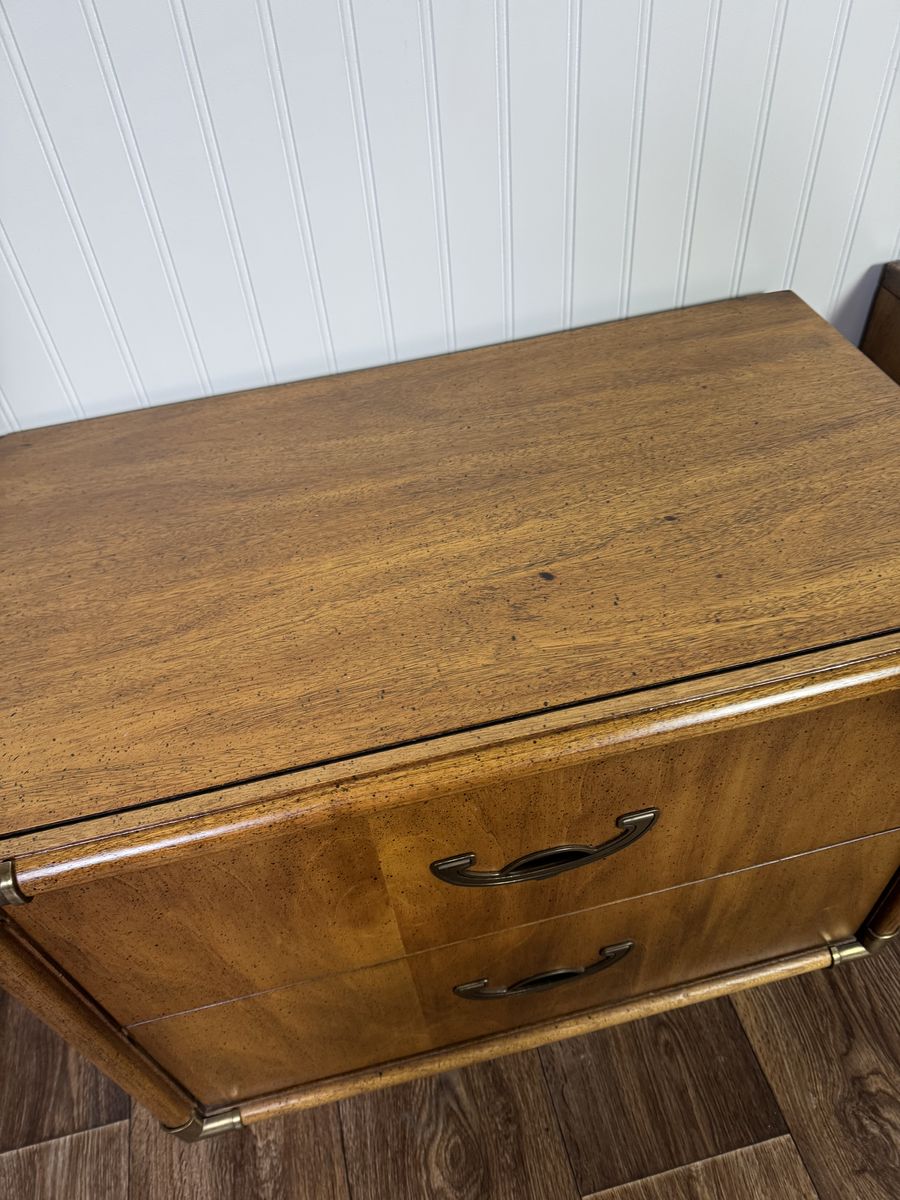 VenmoVintage pair of mid-century modern nightstands featuring warm, honey-toned wood grain, plinth bases, two dovetailed drawers each, brass-toned corner guards, and recessed crescent bail pulls. Some minor signs of wear but overall good condition.