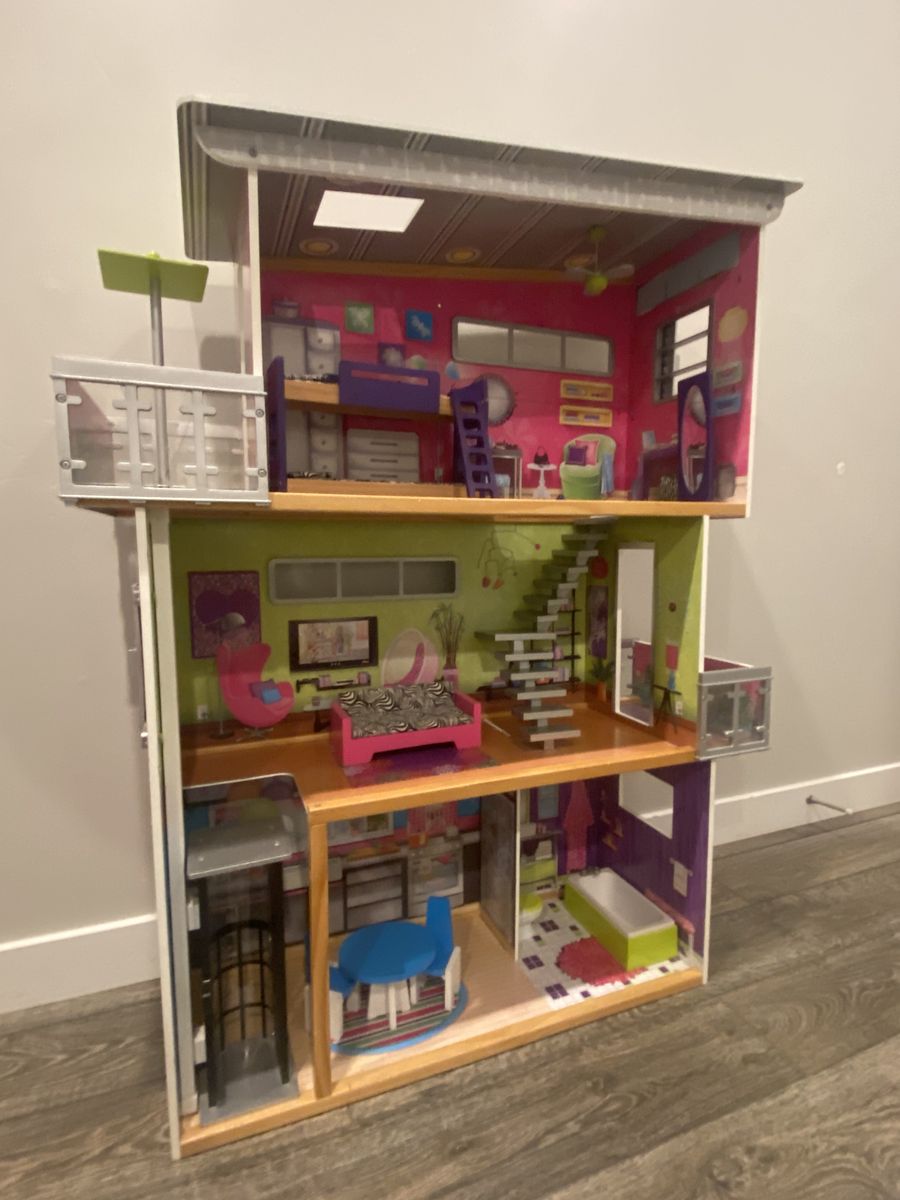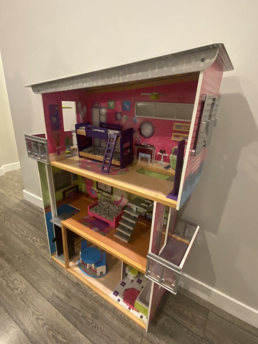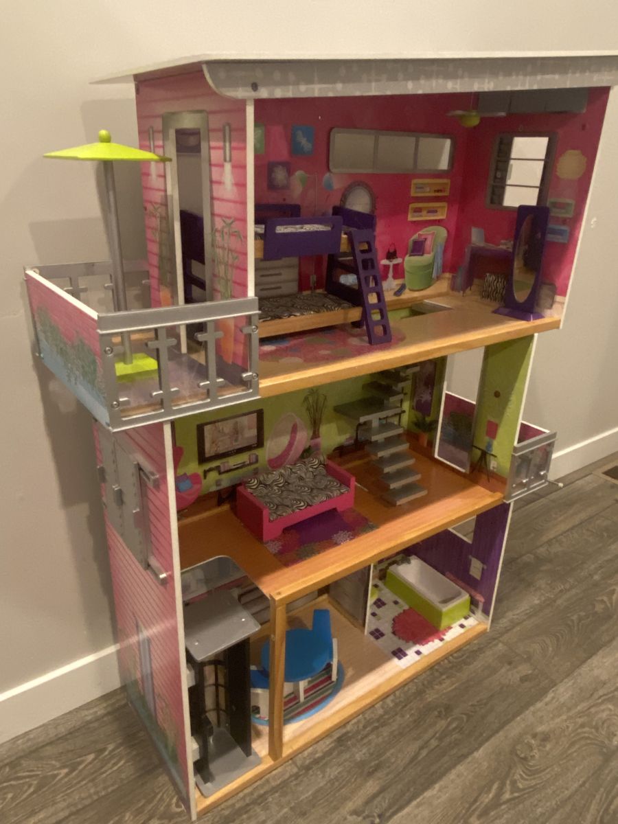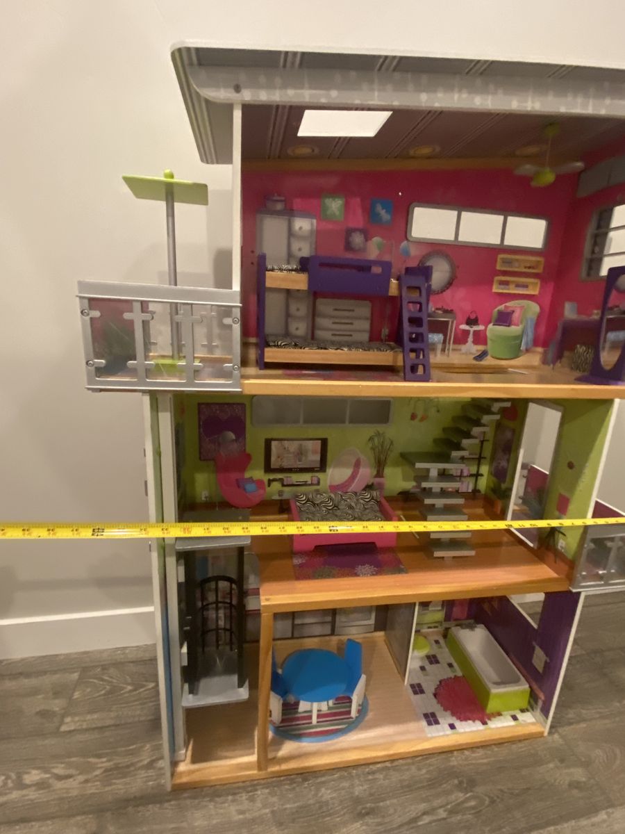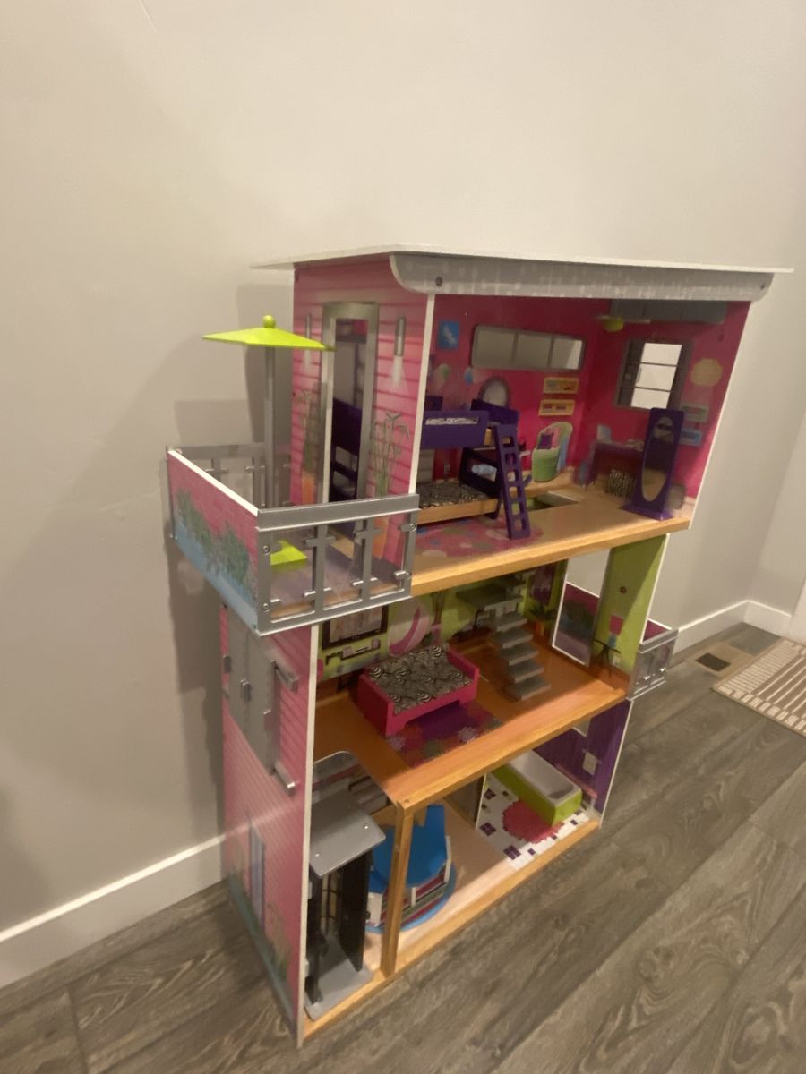 Awesome Kidcraft Dollhouse! Make all your Barbie’s dreams come true with this huge (+-48” tall approximately 38” wide) house making you the envy of the doll house neighborhood! House is fully loaded with: -Personal elevator to help carry all of Barbies new clothes to the second level of this towering 3 story wonderland -dining set for two for dinner dates with Ken -bath tub for relaxing waterless bubble baths -toilet for ya know -bunk bed for slumber parties with your kid sister skipper -full length mirror for fit checks -binge watch Barbie’s favorite shows on this extremely cool zebra coach\