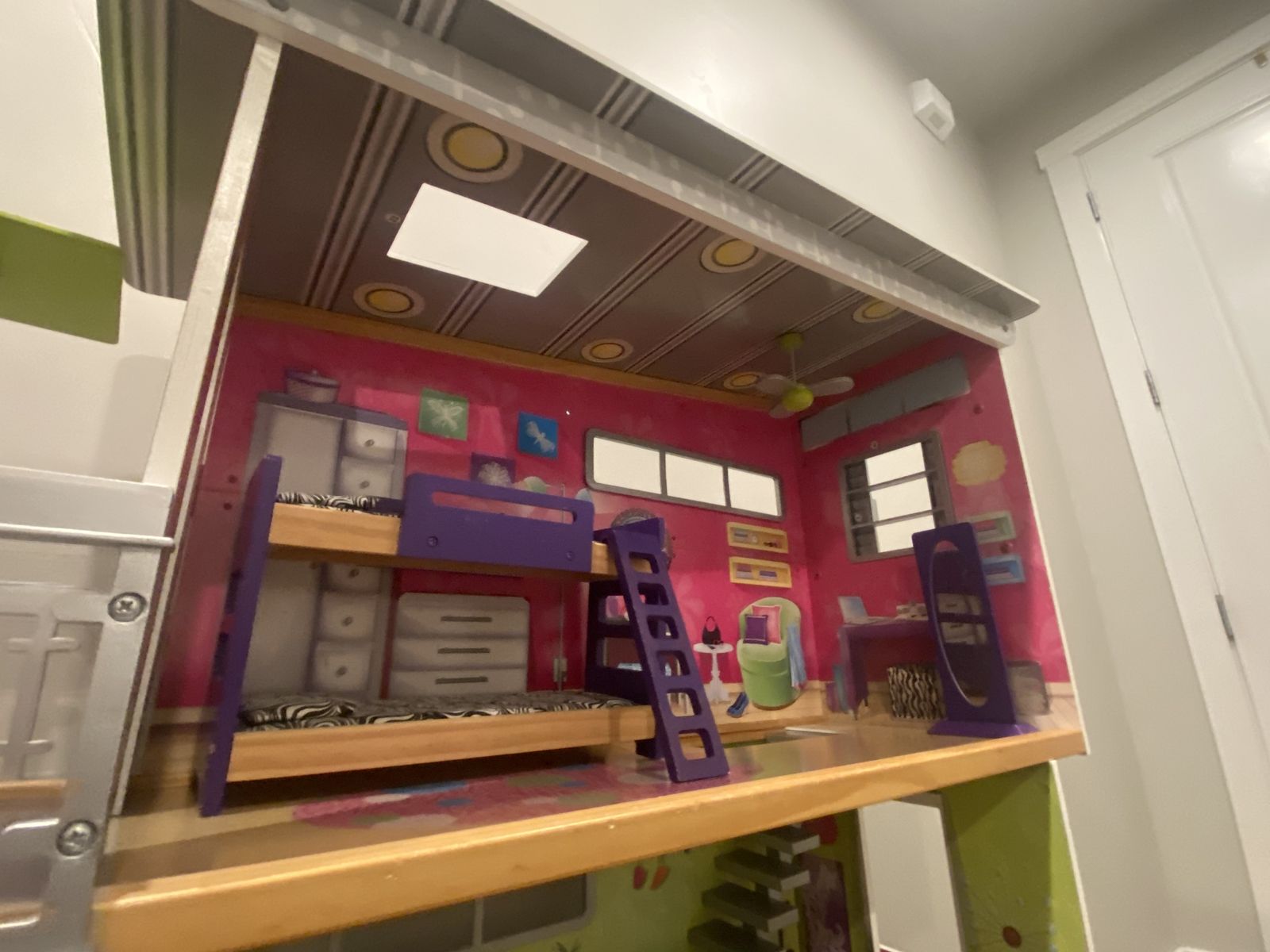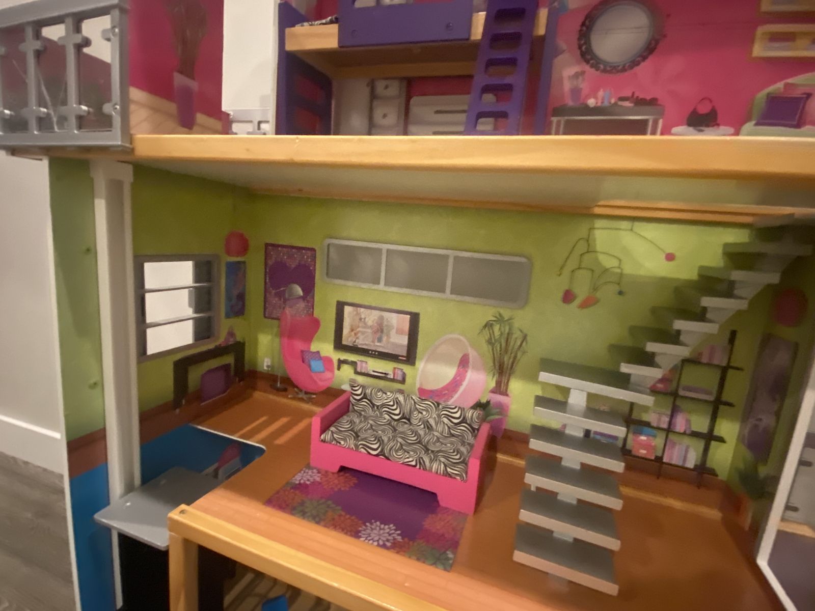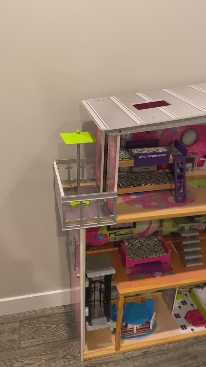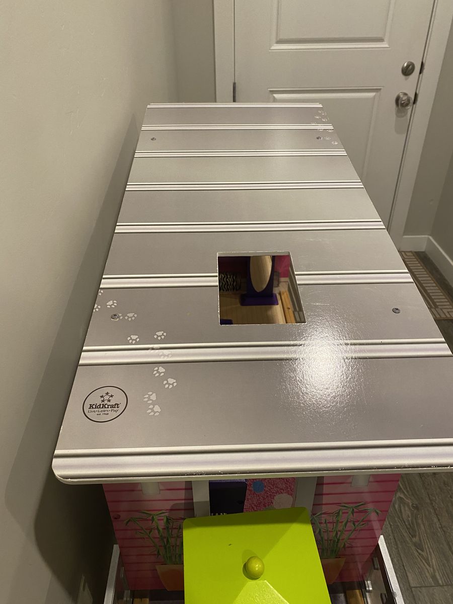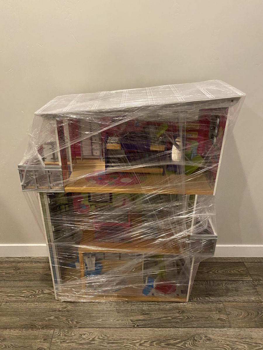 Awesome Kidcraft Dollhouse! Make all your Barbie’s dreams come true with this huge (+-48” tall approximately 38” wide) house making you the envy of the doll house neighborhood! House is fully loaded with: -Personal elevator to help carry all of Barbies new clothes to the second level of this towering 3 story wonderland -dining set for two for dinner dates with Ken -bath tub for relaxing waterless bubble baths -toilet for ya know -bunk bed for slumber parties with your kid sister skipper -full length mirror for fit checks -binge watch Barbie’s favorite shows on this extremely cool zebra coach\