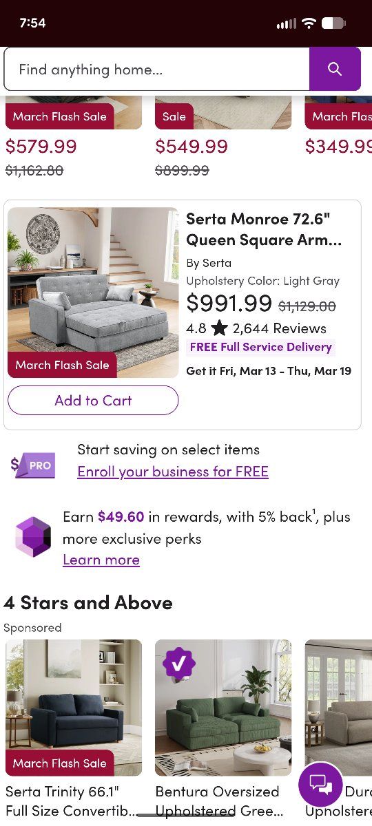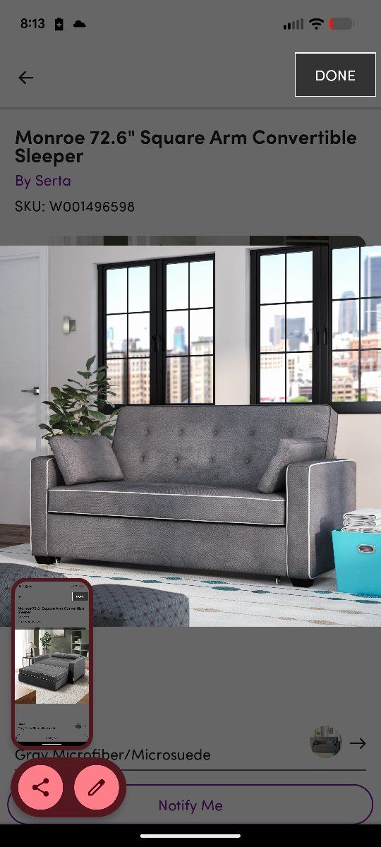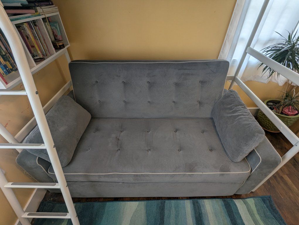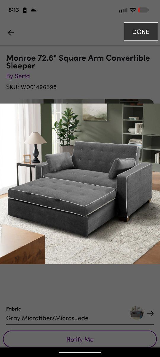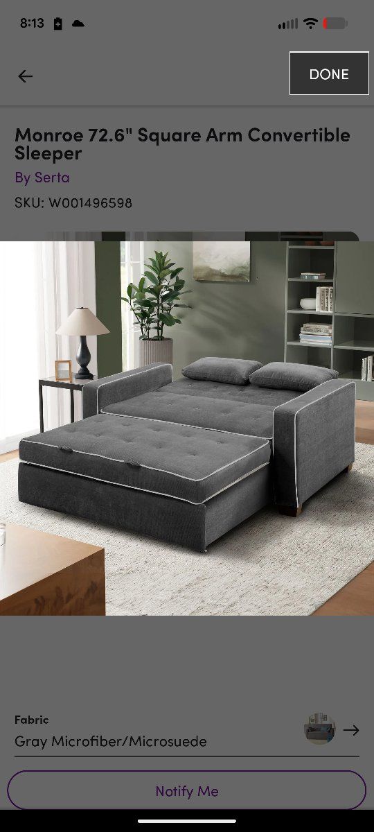 Venmoconvertible couch to queen bed, perfect for guestroom or small spaces! It is in great condition and made from microsuede/microfiber which is easy to clean. I originally bought this from Wayfair, here is the link to the item with full description - https://www.wayfair.com/furniture/pdp/serta-monroe-726-queen-square-arm-tufted-back-convertible-sleeper-sofa-with-cushions-zpcd2147.html?piid=93175223 - it is highly rated.