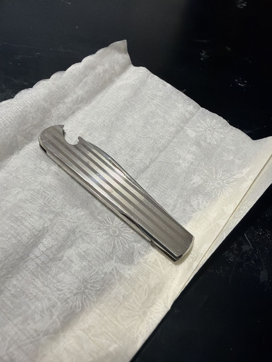 Classic stainless steel handle with ribbed design and a built-in bottle opener. Compact and well made with a smooth opening blade.