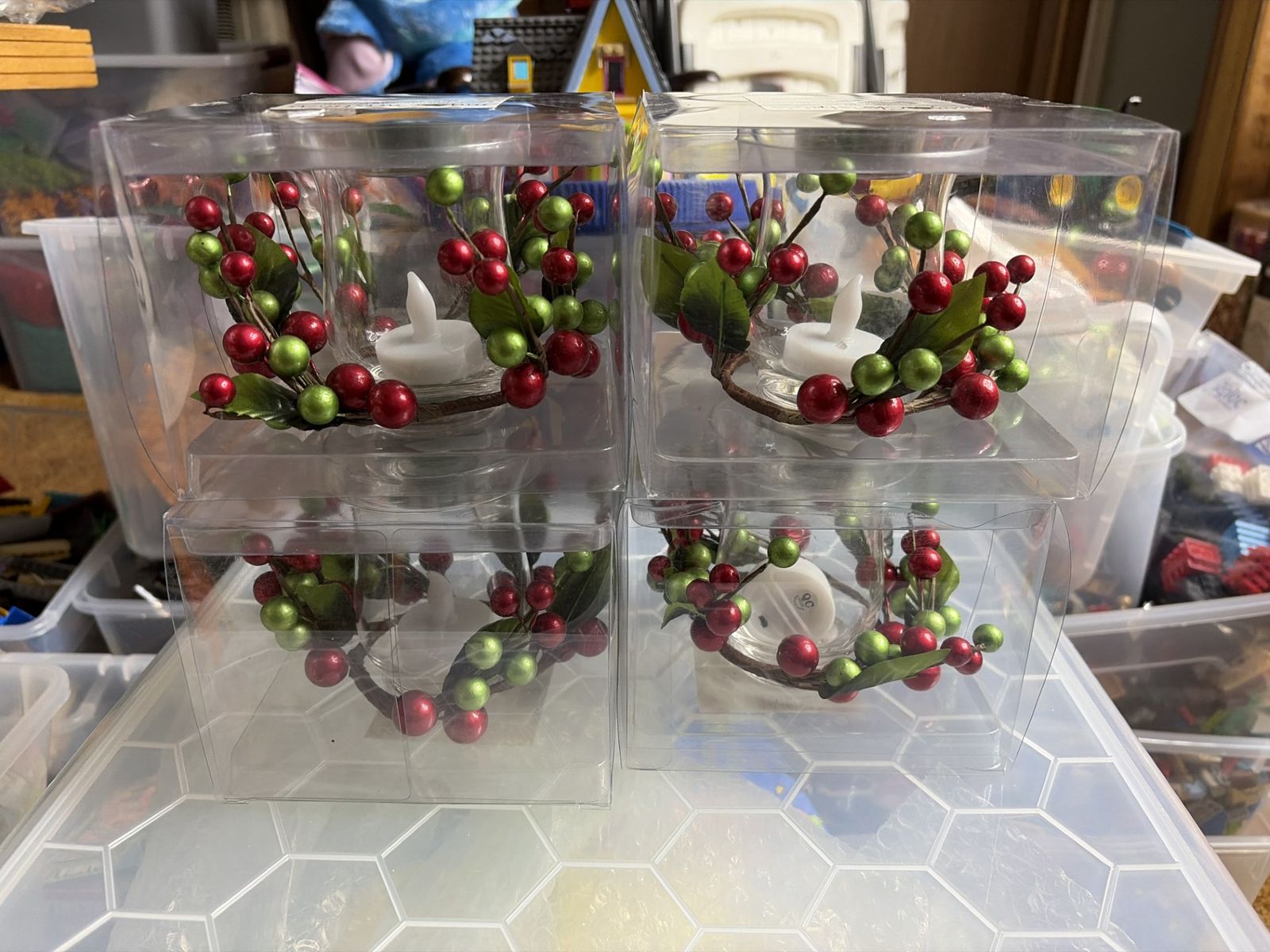 Festive Christmas hurricane candle holders with decorative red and green berry wreath accents. Each includes a glass hurricane holder and tea light candle.
