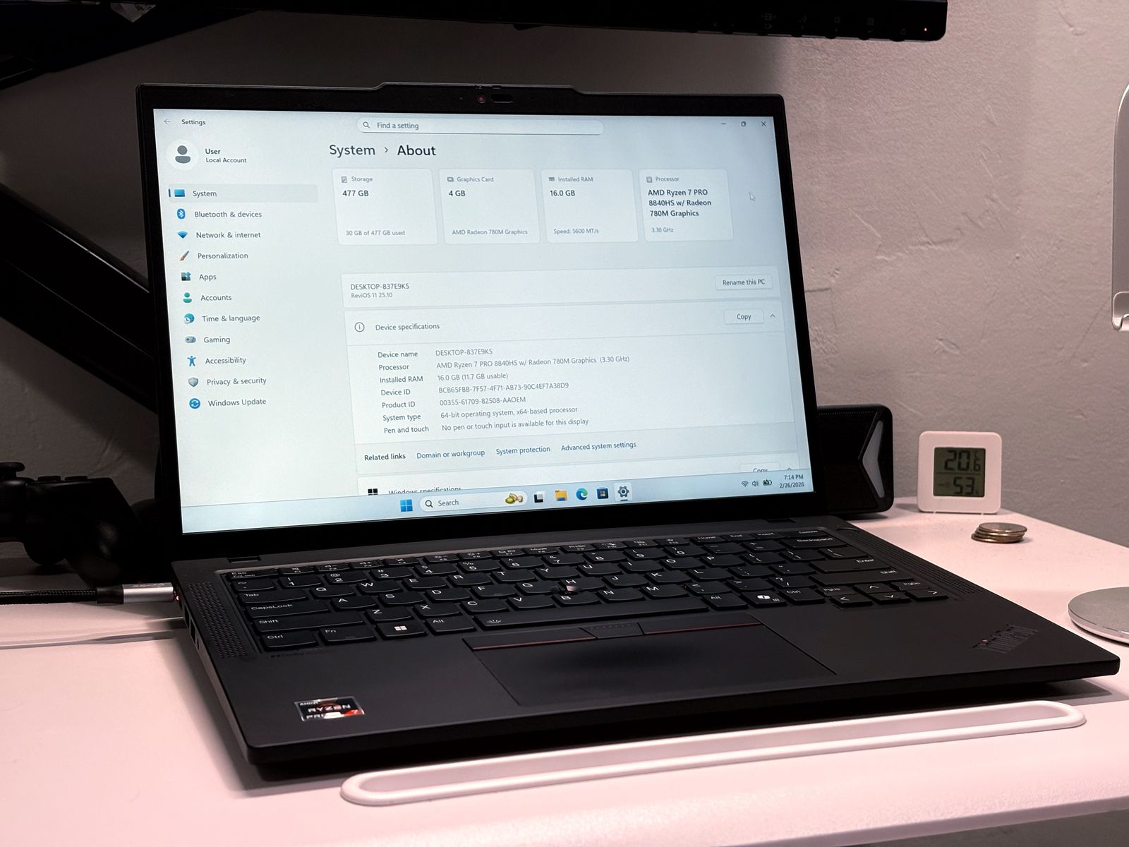 ApplePay-AMD Ryzen 7 Pro 8840HS (8 Cores, 16 Threads) -AMD Radeon 780M Graphics (4GB) -NPU Compute Unit for AI Tasks -16GB Dual-Channel DDR5 RAM -14 Inch 1920x1200 Matte Display -500GB M.2 NVMe PCIe SSD -WiFi 6E + Bluetooth 5.4 -2 USB-C, 1 HDMI, 2 USB, 1 Ethernet -No Damage, 97% Battery Health -Original USB-C Charger Included