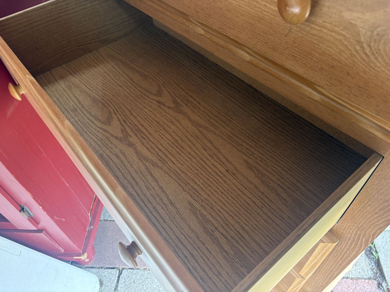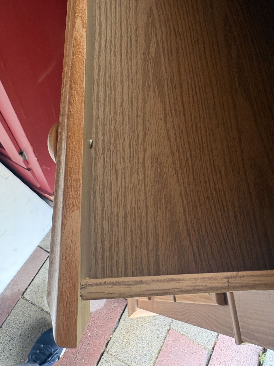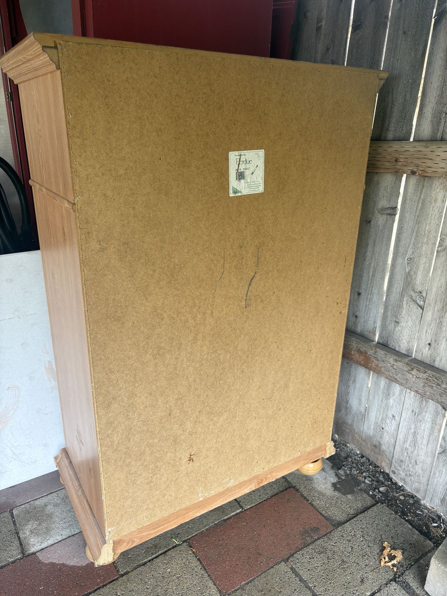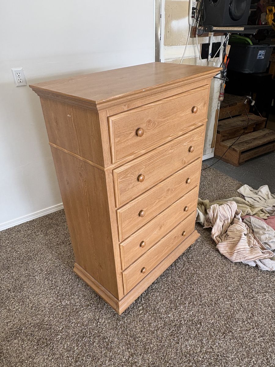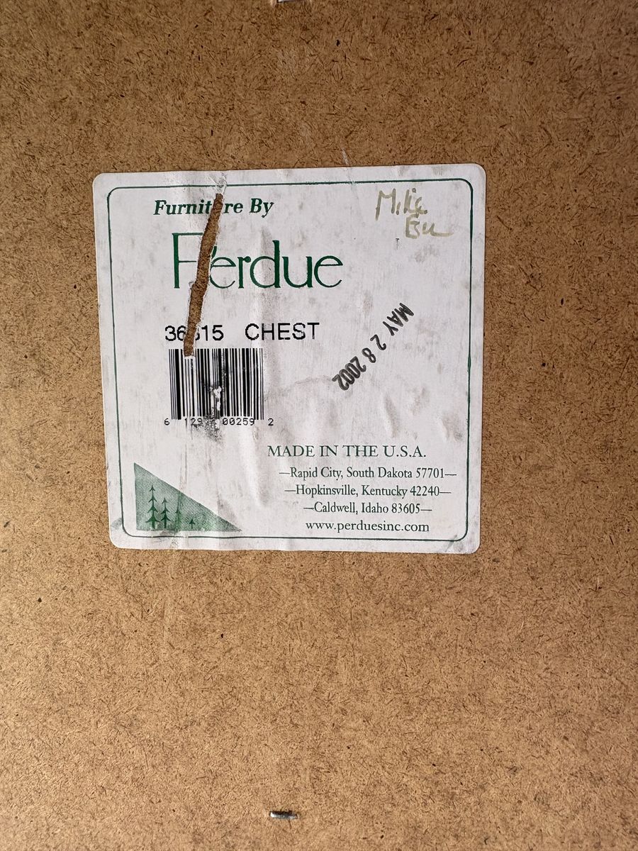 ZelleFREE DELIVERY Vintage 2002 Perdue Furniture 5-drawer tall chest in natural light oak Solid USA-made (Rapid City, SD) Sturdy with light wear only No major damage. Clean, Smoke-free home. • Age: Manufactured May 2002 (~24 years old) • Dimensions: 34” W x 18” D x 48” H • Original Retail (est. 2000s): $400–$600 • Suggested Price: $175 (oak value—similar used pieces $150–$300) Features:soi • Oak with warm natural grain and light finish • 5 spacious drawers on smooth roller guides • Classic sturdy design, wooden knobs, fully assembled • Made in USA, moisture-resistant • Ideal bedroom storage NOTE: Water damamge in one of the drawers (see pics)