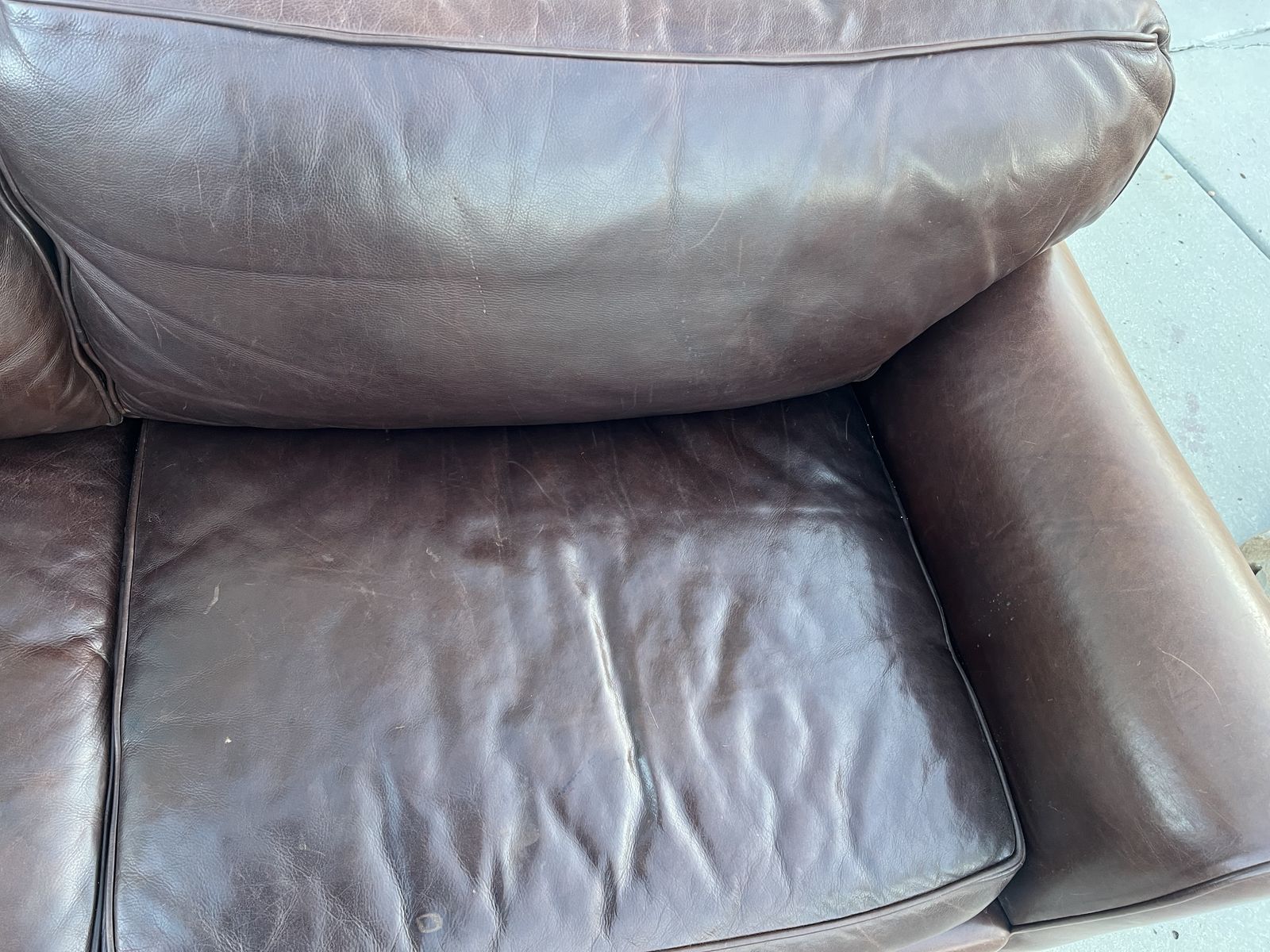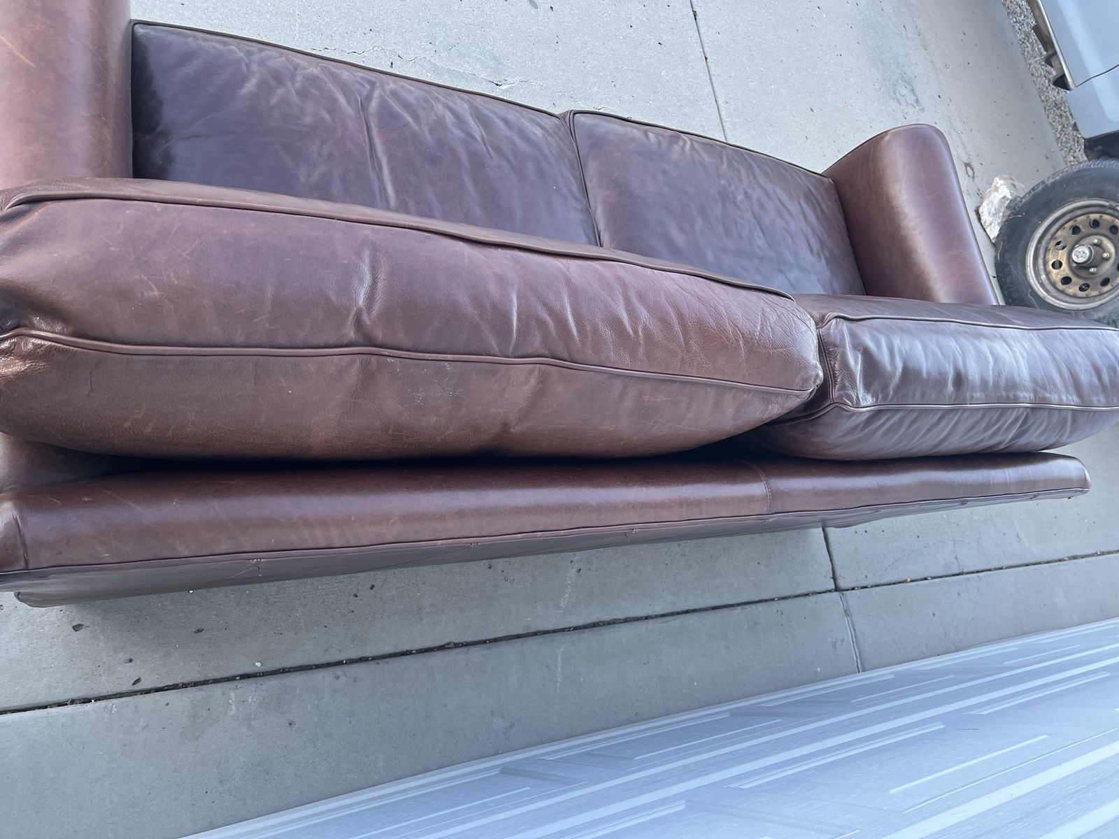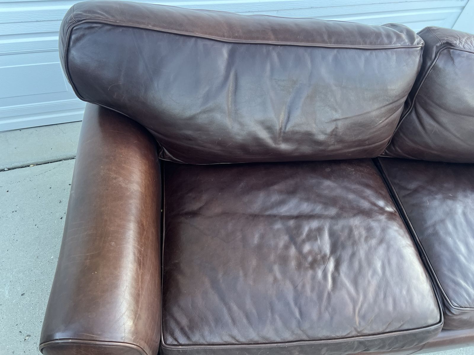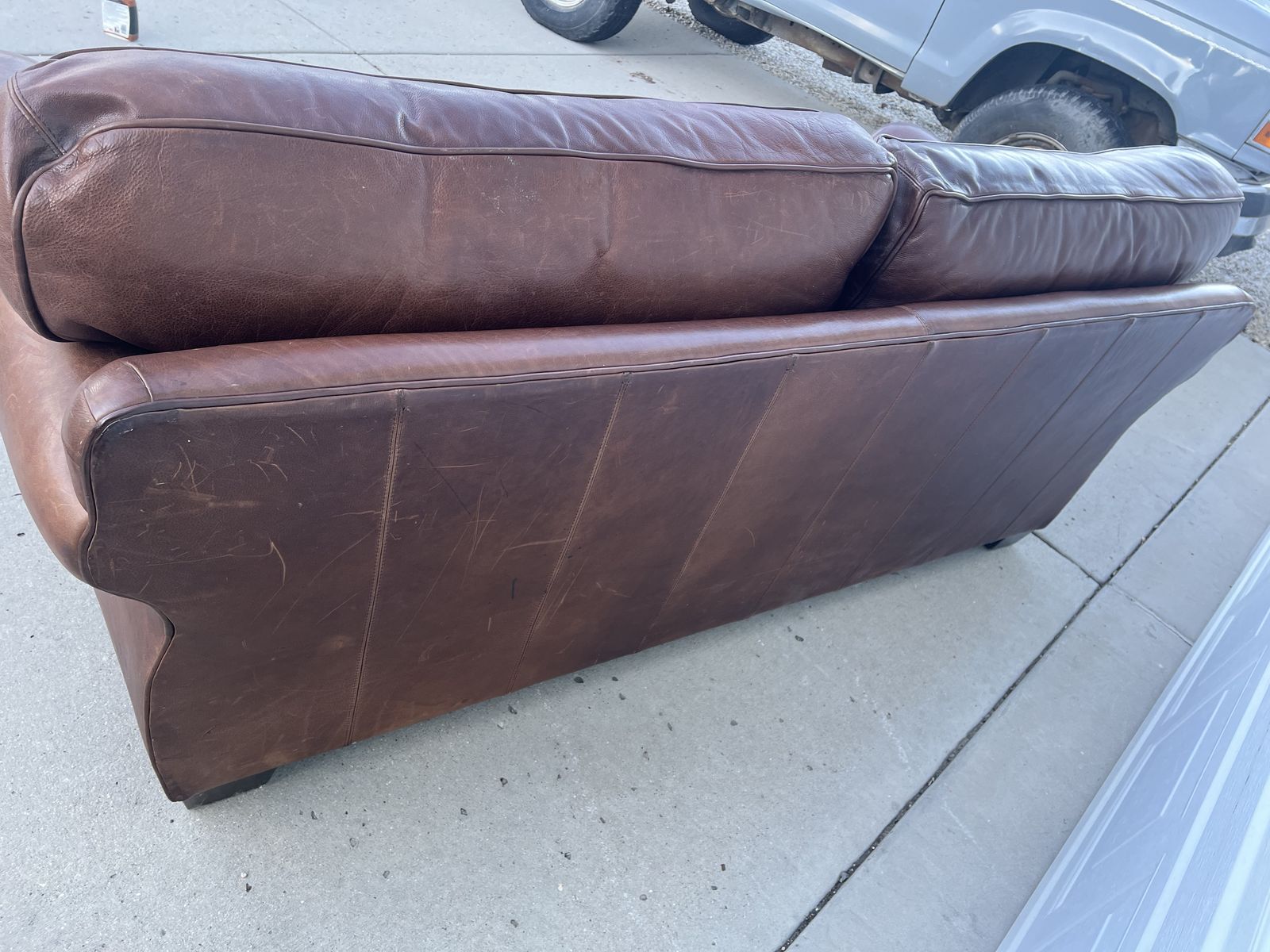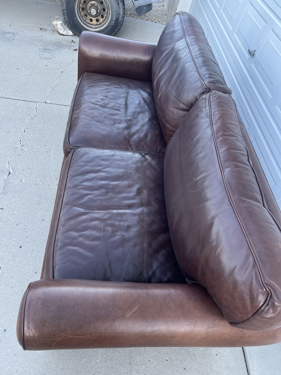 Brown leather couch. Great couch with lots of life left. Has some minor marks throughout. Cushions are still in great shape and don’t have any lumps or dips. Can deliver in the Salt Lake Valley for $50 extra. Potentially Utah county depending on location. Measurements are 82”L x 37.5” W x 29” H ****stored inside