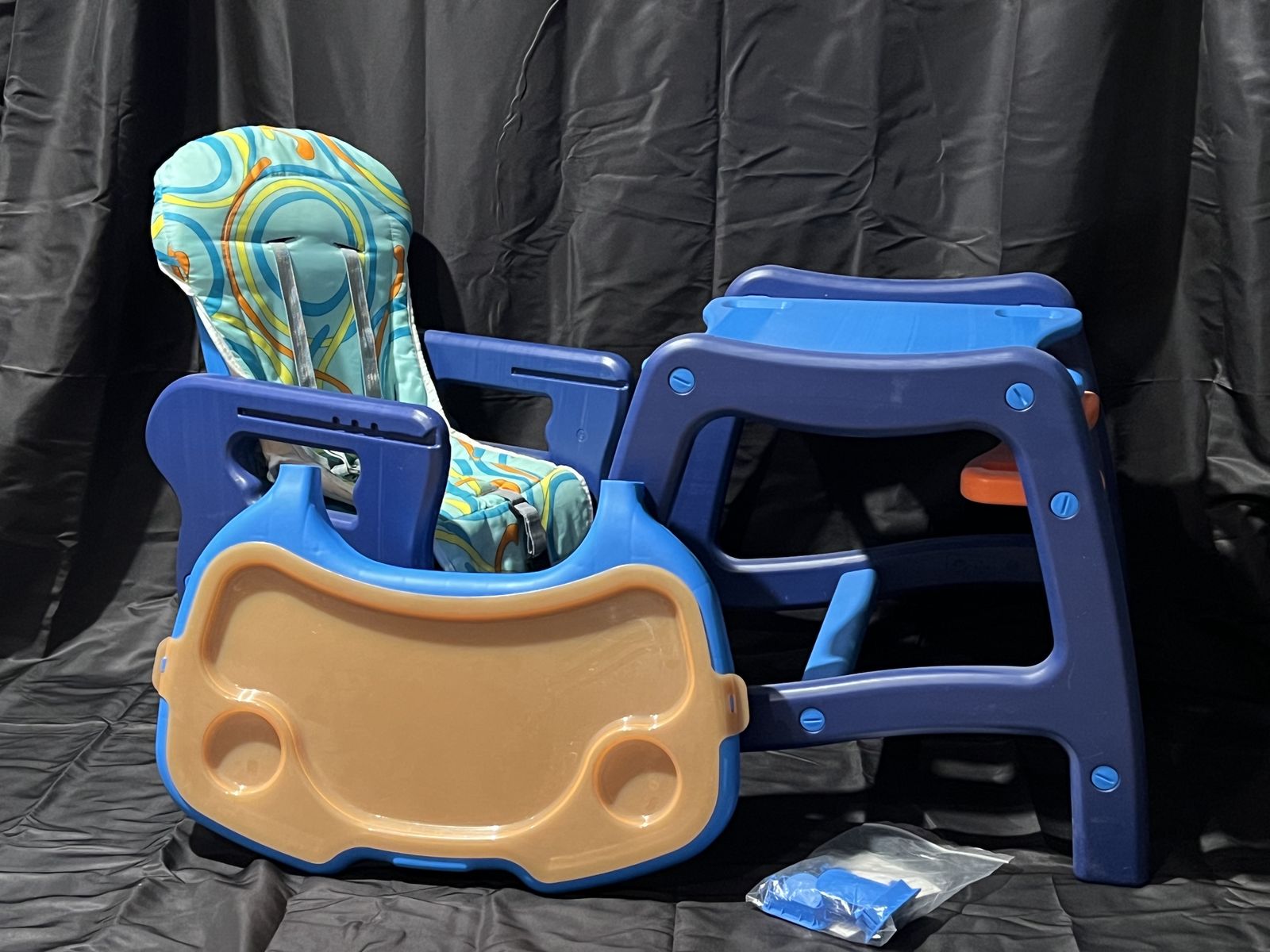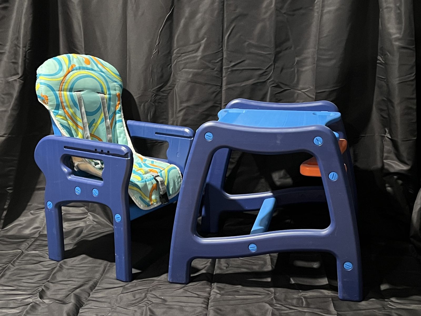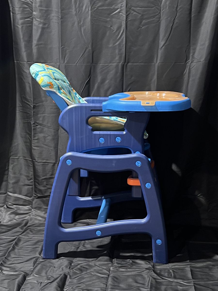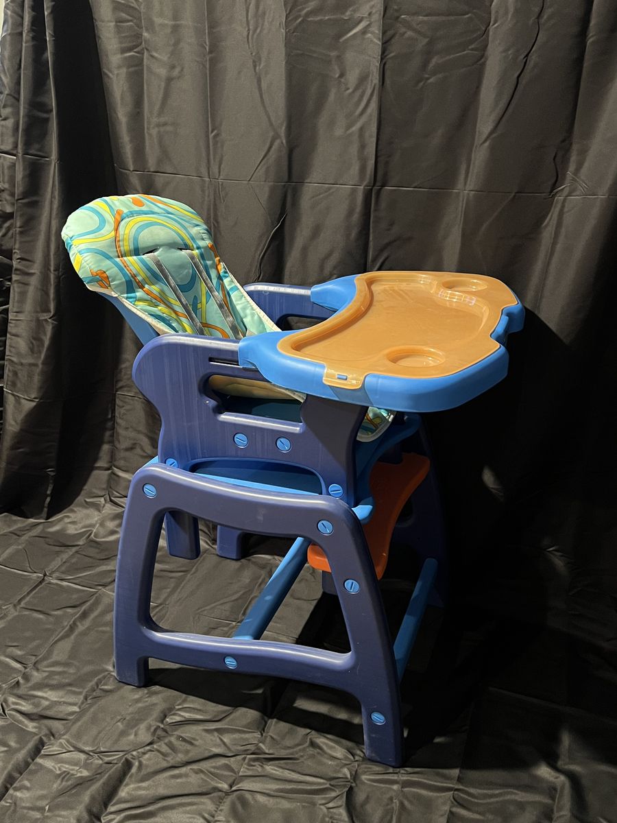 Sturdy Envee Baby High Chair (Model 00939) in bright orange and blue colors. Perfect for feeding babies and toddlers. The chair includes a removable tray, padded seat, and safety harness to keep your child comfortable and secure during meals.
