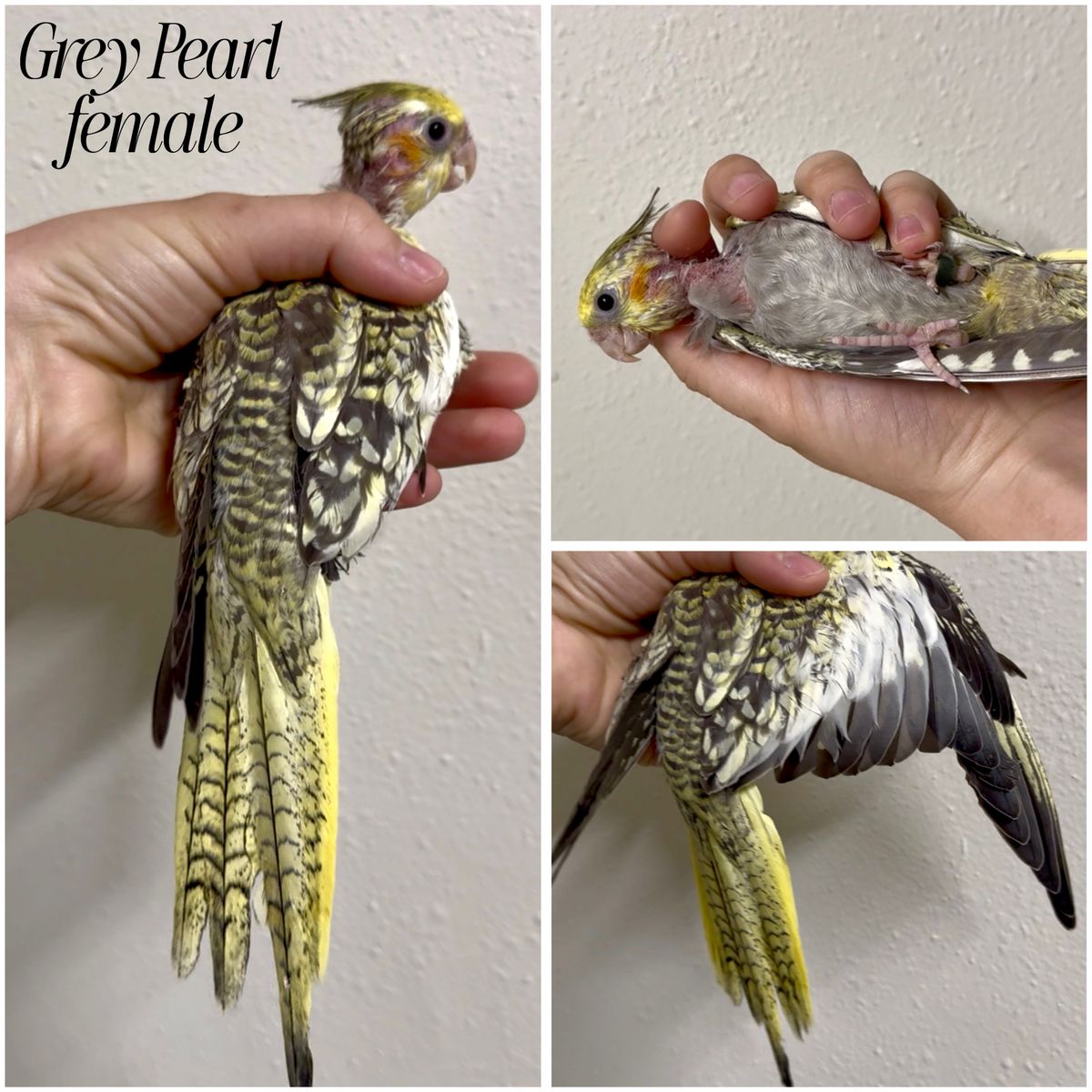 Roughly 4 and 5 weeks old, 2 cockatiel babies still handfeeding but available to place a deposit on to hold until weaned! we have 1 grey and 1 grey (split pied)