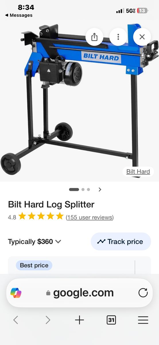 6.5-Ton Electric Log Splitter with Stand | Homeowners & Seniors bilthardusa.com · Manufacturer Equipment Type Log Splitter Application Type Wood processing Log Splitter Type Hydraulic Function Type Splitting Applications Residential Power Source Electric Power Type Corded Electric Power Output 1-3/4 HP Voltage 120V Typical Users Seniors, Homeowners Splitting Tonnage 6.5 Ton Horsepower 1-3/4 HP Max Log Length 20.5 Operating Position Horizontal Speed 3,400 RPM (no-load speed) Splitting Capacity 6.5 Ton Log Capacity 20.5 Length x 9.8 Diameter Engine Power 1-3/4 HP Engine Type Electric Weight 105.2 pounds Height 33 in Length 34.25 in Width 28.5 in Control Type Electric Safety Features Two-hand operation