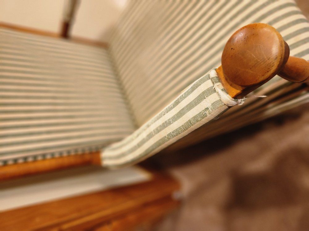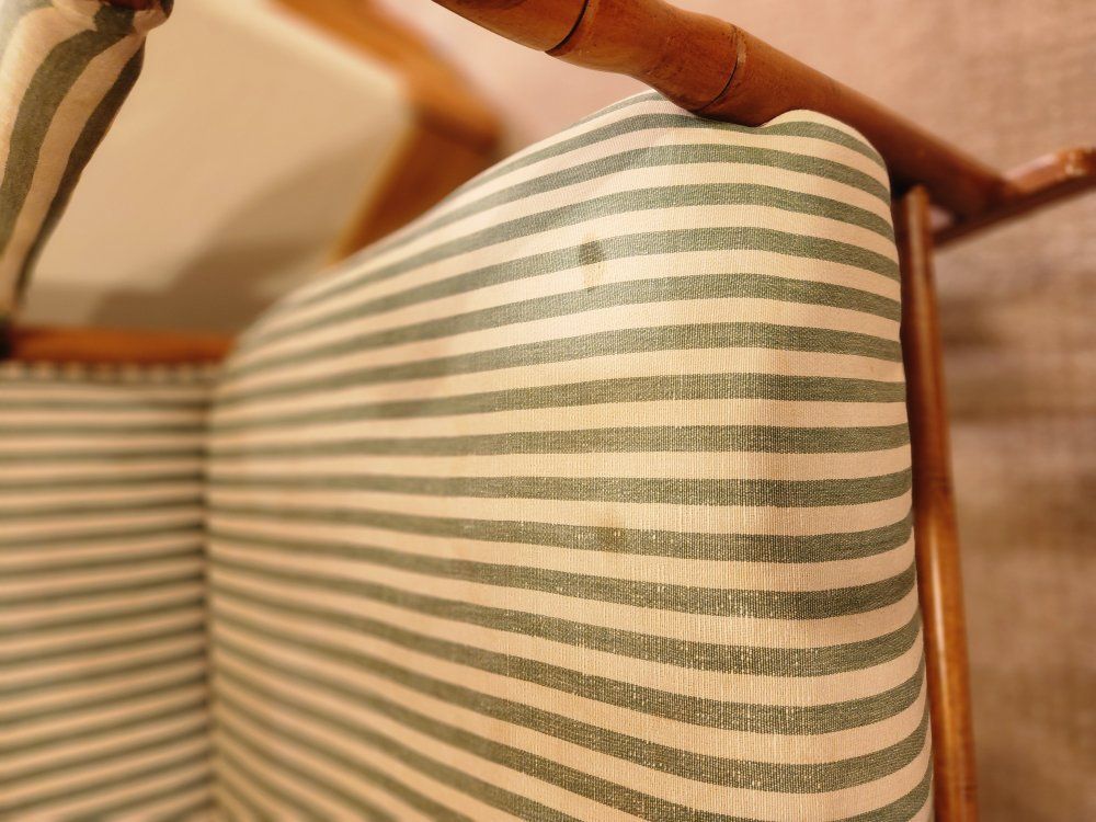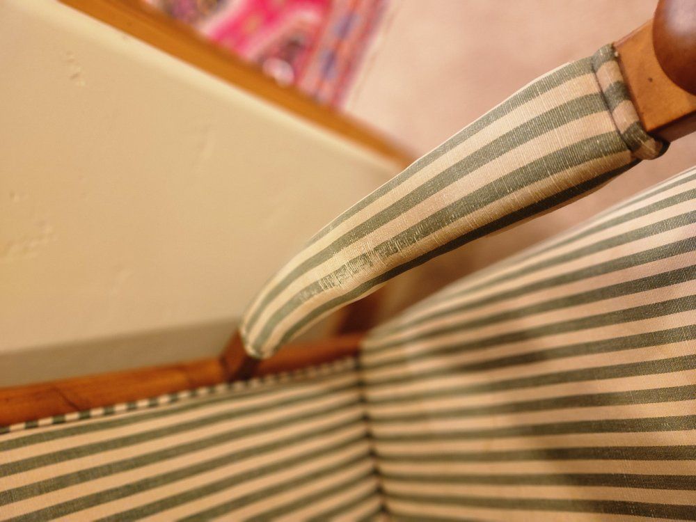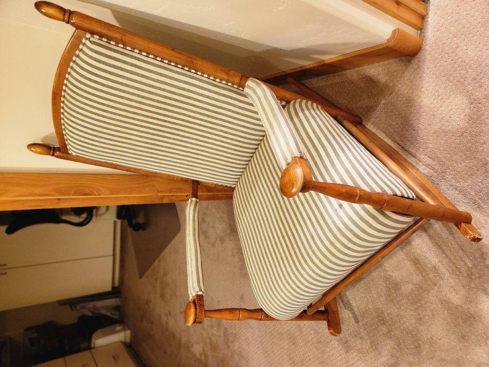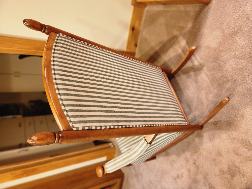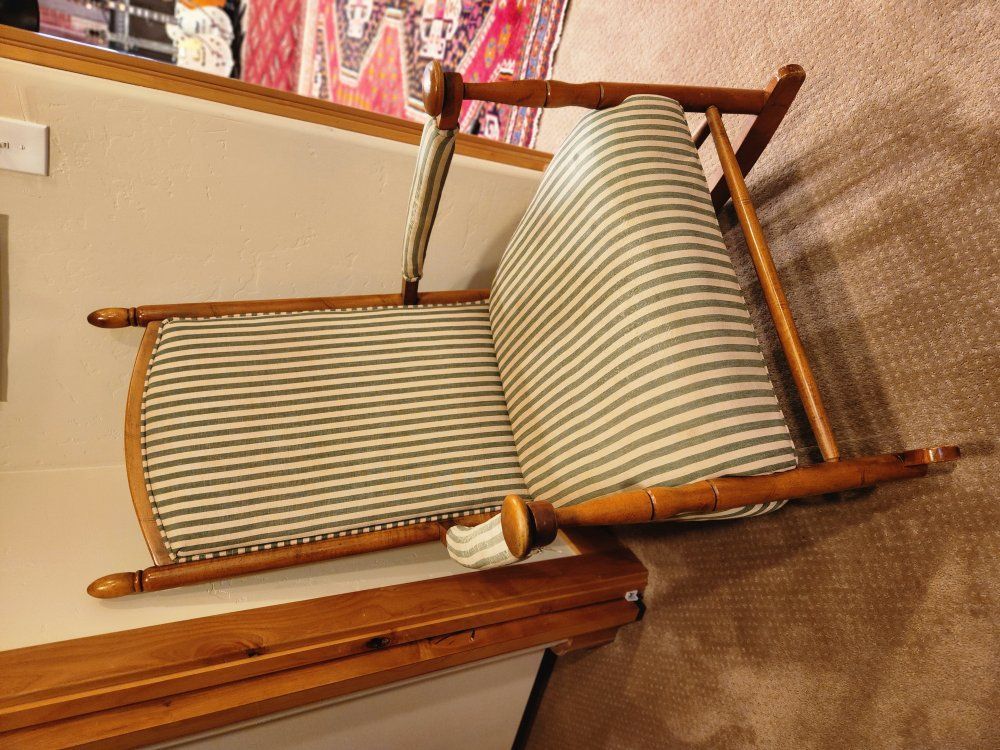 PayPalUp for grabs is a very comfortable and classy cushioned upholstered rocking chair in green stripes. American made in the early 00's, strong and sturdy, some wear and a few small upholstery spots showing. First $100 takes.