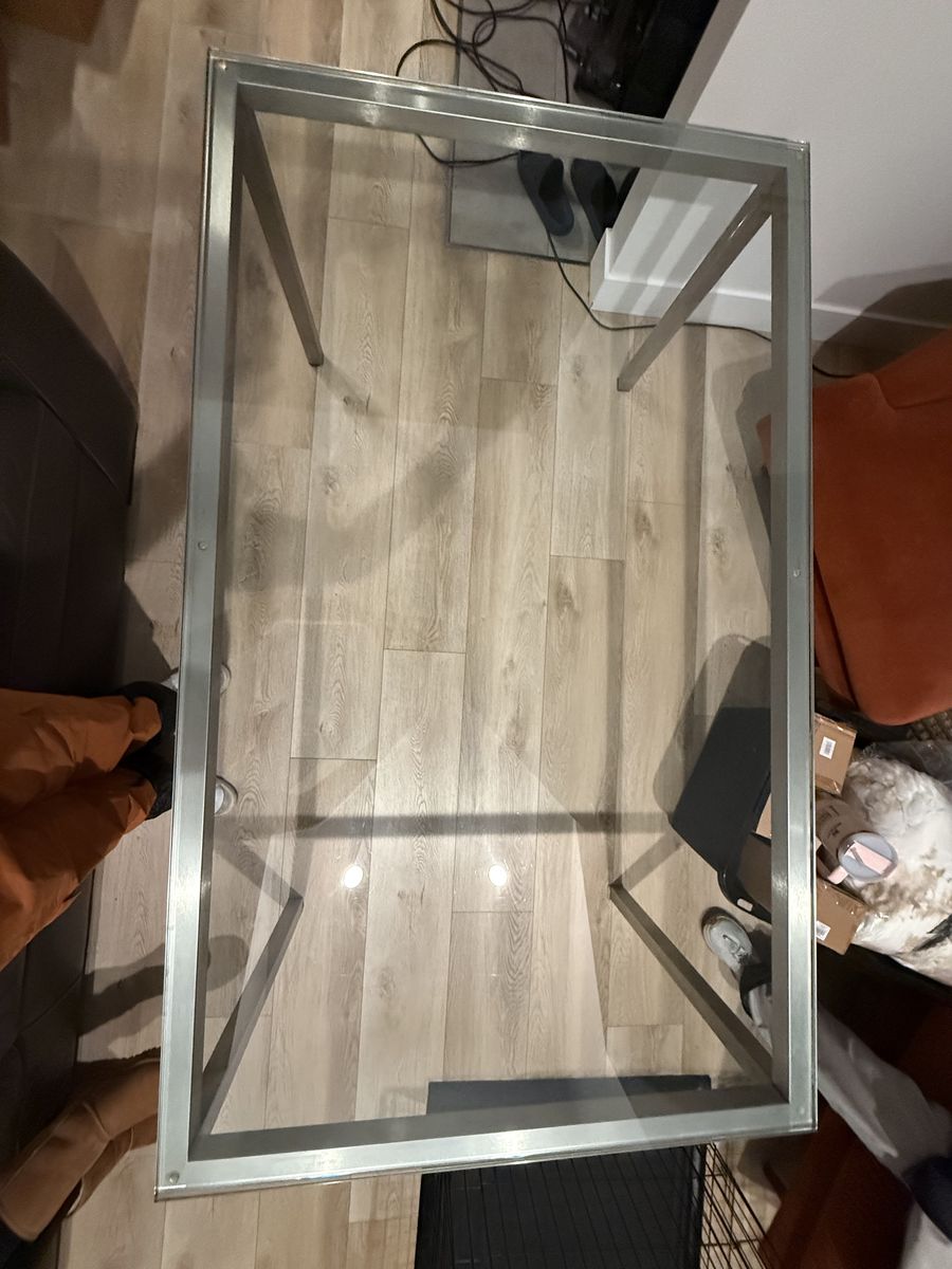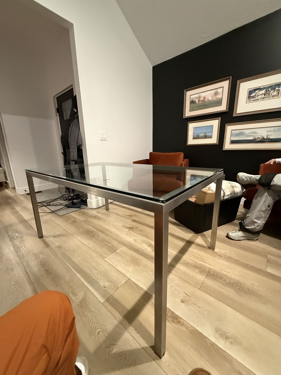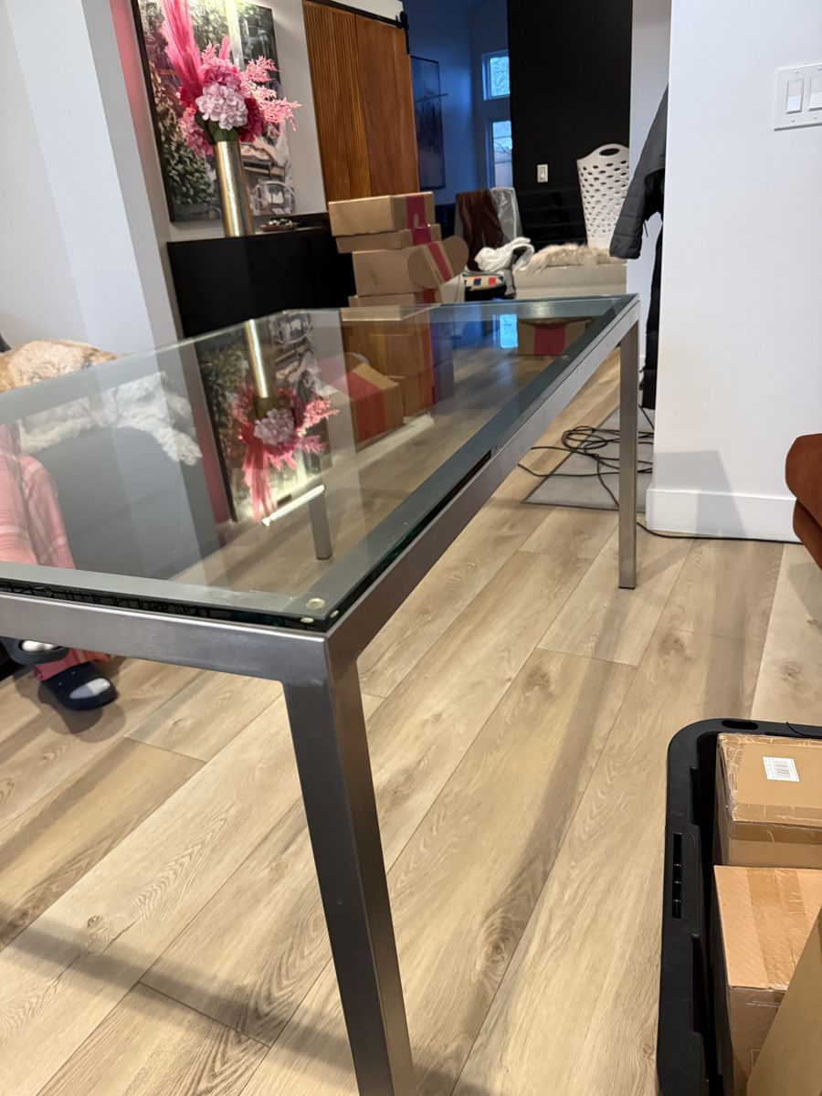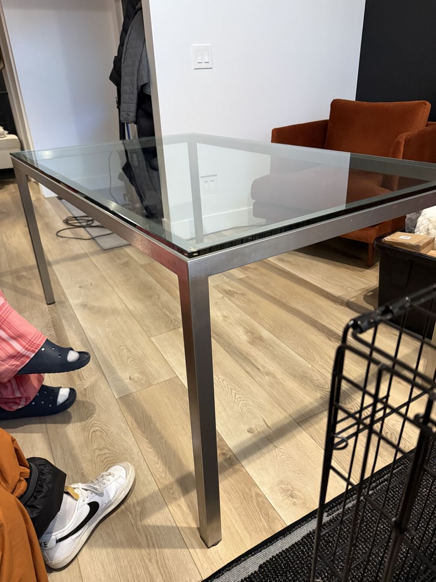 VenmoModern metal and glass table. Glass is 1/2 thick with a solid metal frame in good condition. This table is a very solid nice custom made table/desk. Makes a great dining room table or would be great for an office. It's 60" x 36" and 28-1/2 high.