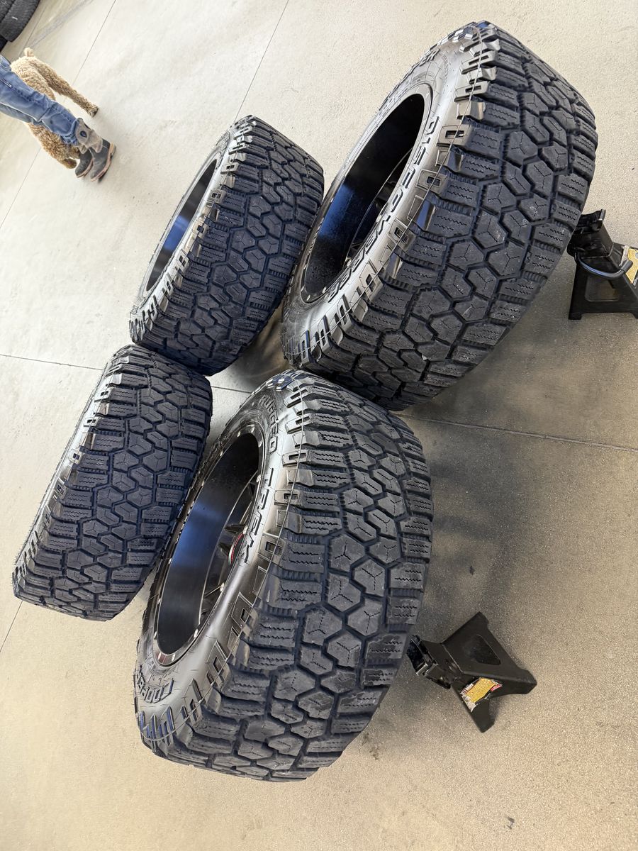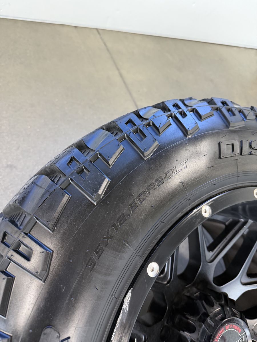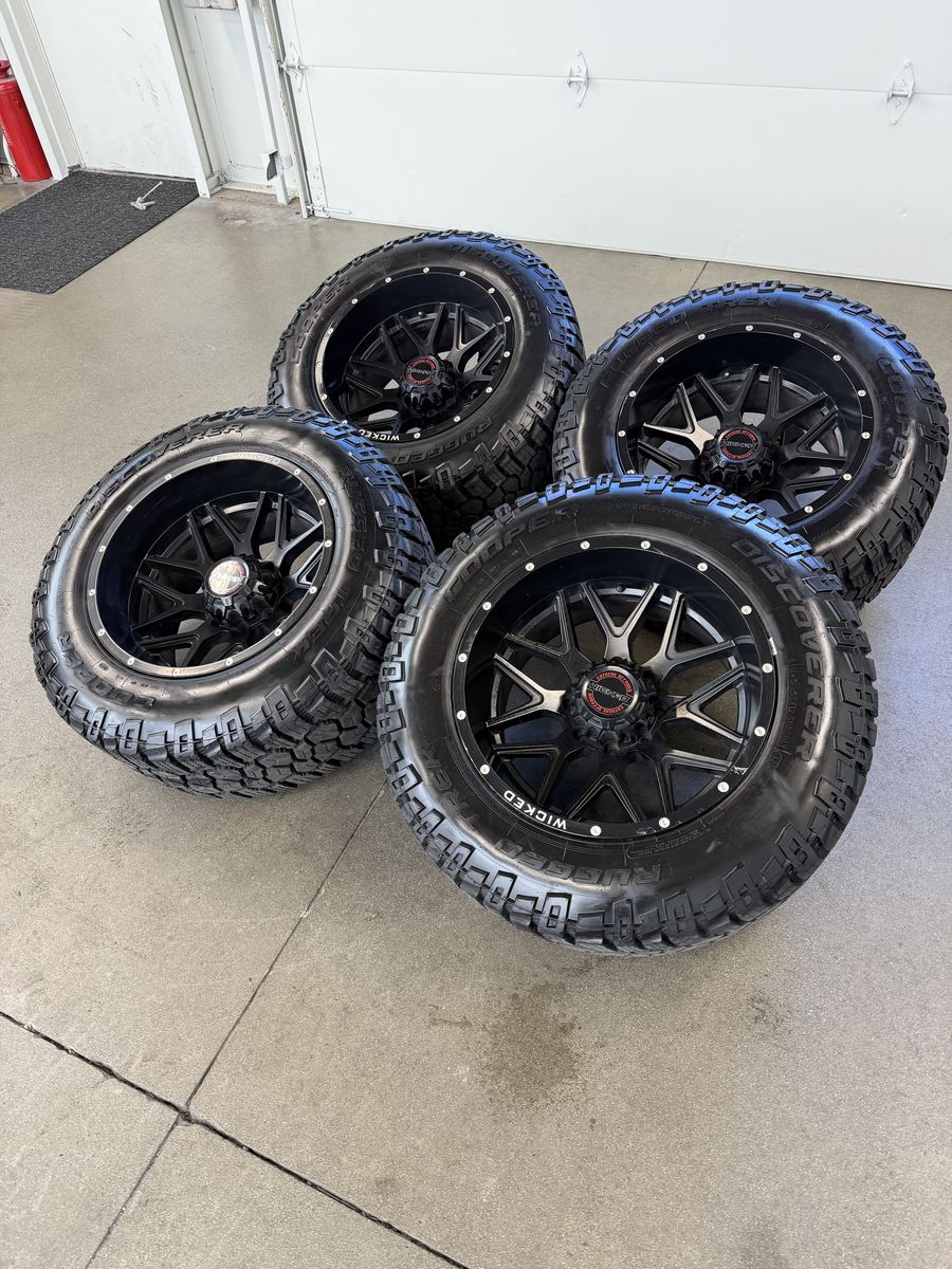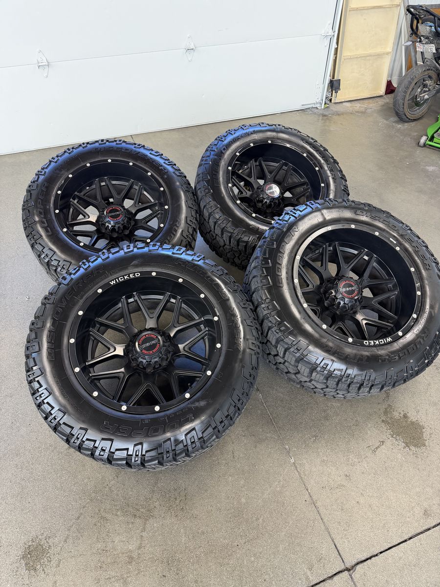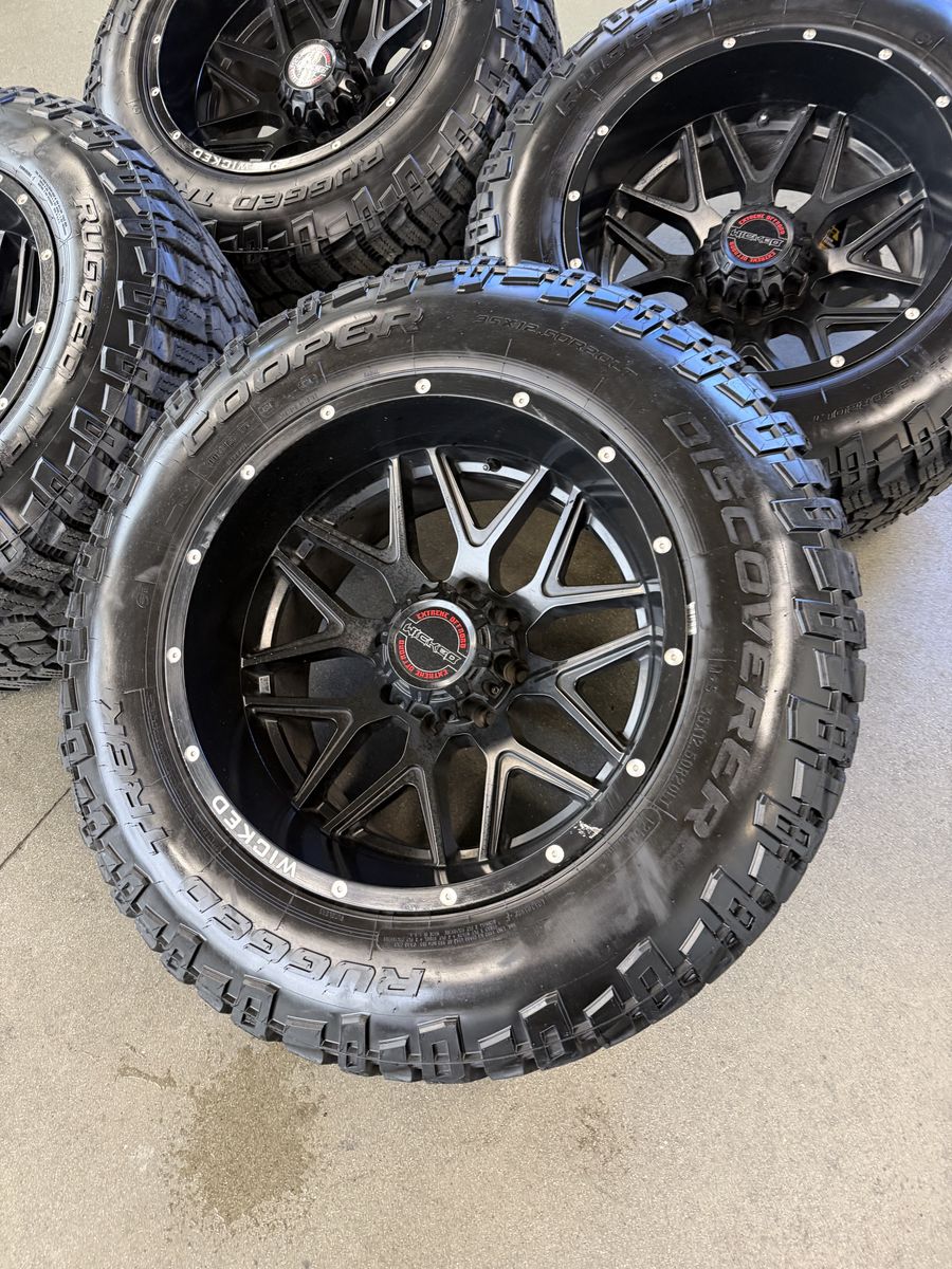 Wheels are 20x12, -44 offset, wicked custom wheels. No major damage on them, wheels are in great shape, super good looking set of custom wheels. All of the center caps are also included and in perfect shape as well. Wheels alone new are over $2000. Tires are 35x12.50r20 cooper rugged trek, load range E, 10ply, top of the line tires, no patches or plugs, some rig mark, tires are in like new shape with 80% tread or more.