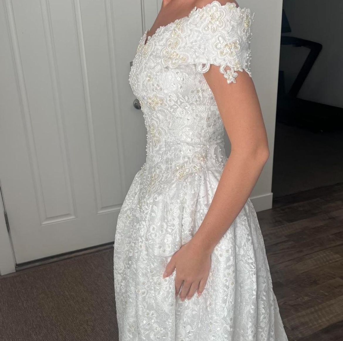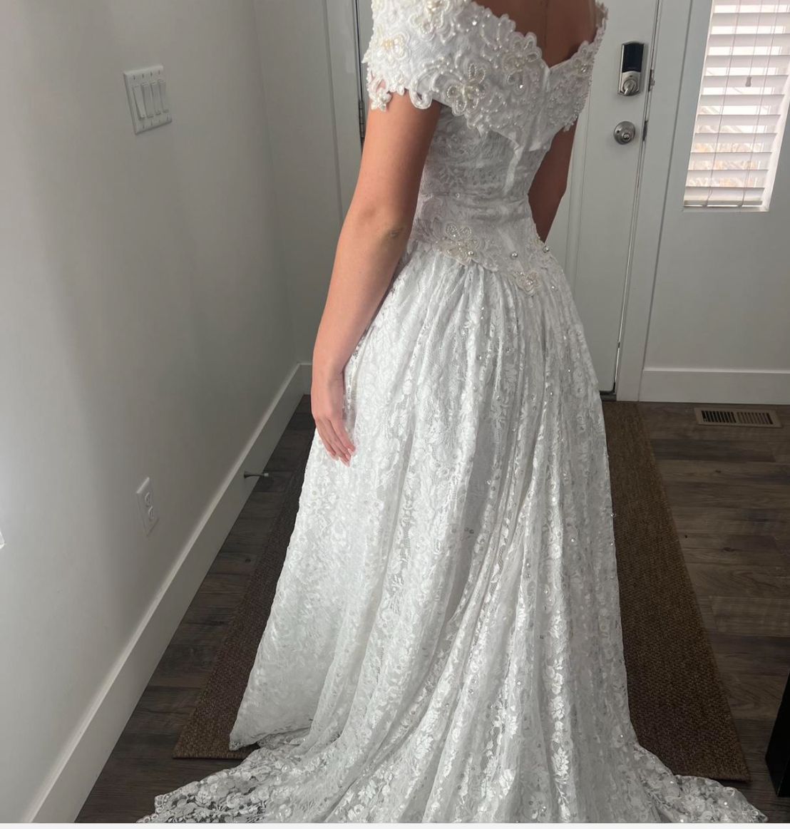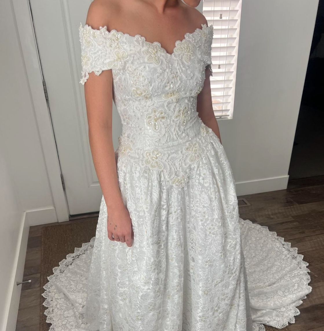 Features: • Flattering Basque Waist: Creates that iconic V shape at the hips. • Intricate Beadwork: Heavily detailed with pearls, sequins, and 3D floral lace appliqués. • Cathedral Train: A massive, stunning lace train that makes for incredible photos. • Romantic Neckline: Classic off-the-shoulder scalloped lace edge.