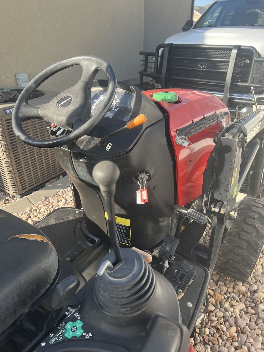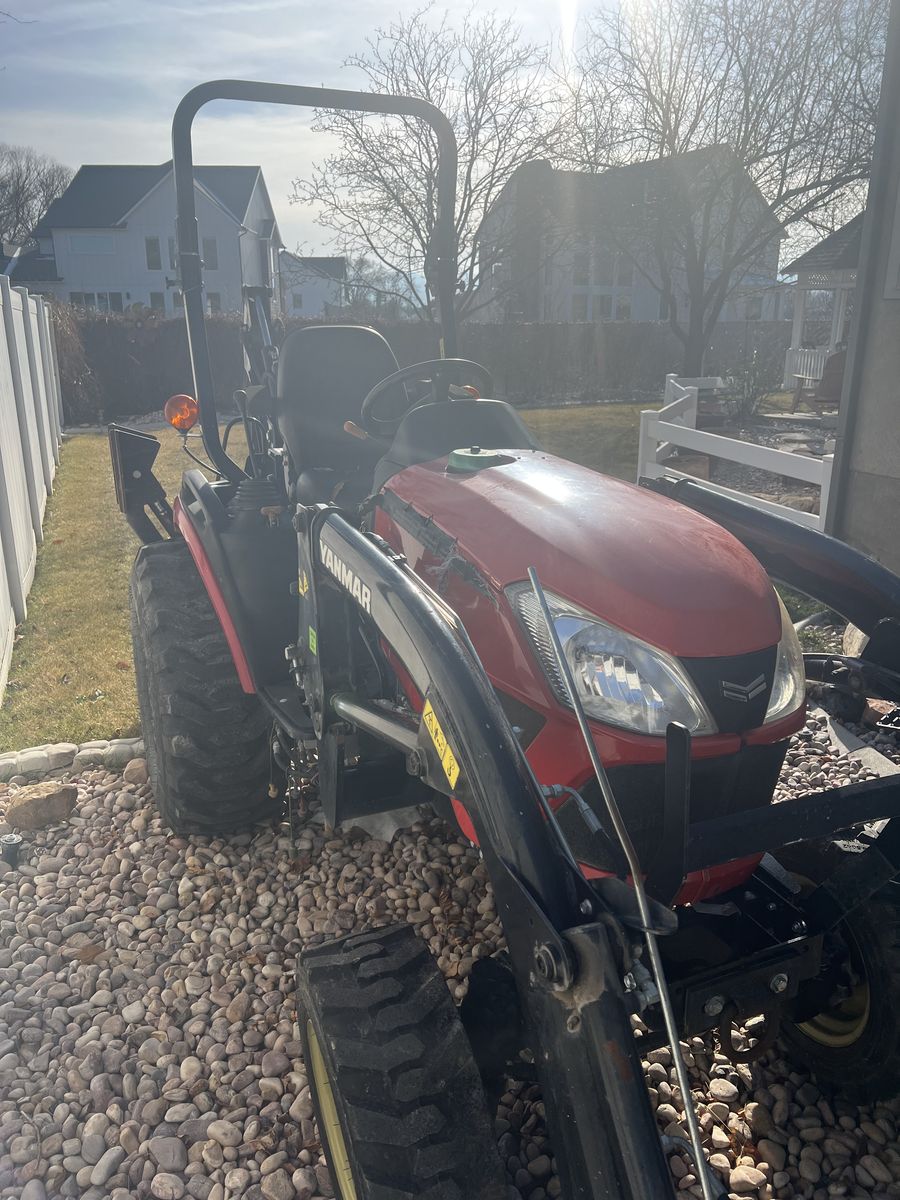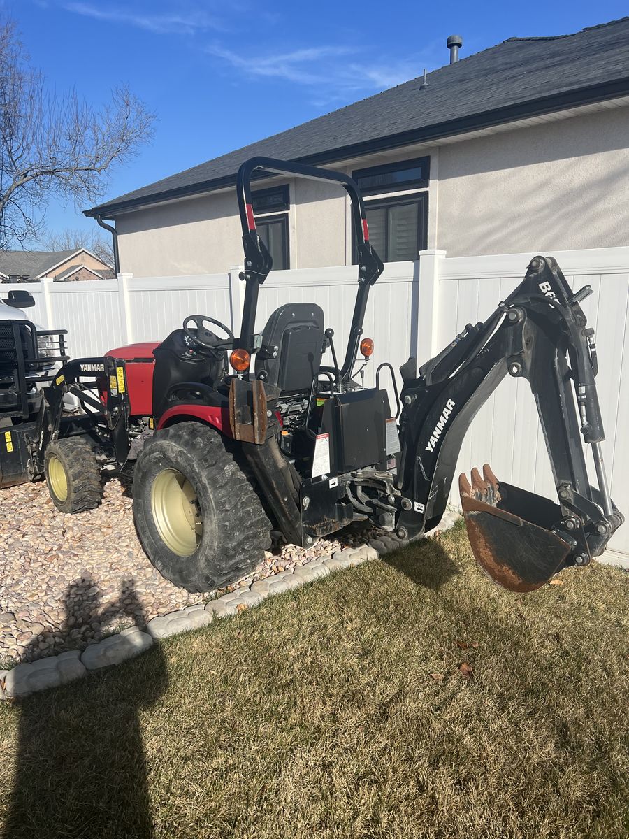 This is the 2021 Yanmar model SA424. It has 4WD. 458 hours. Hydrostatic transmission with high and low ranges. This tractor has the larger frame and tires. Backhoe is removable so you can add the 3 point hitch to the rear of the tractor and use all the different t tractor implements. Has forward and rear PTO. Runs great with no issues. Loader will lift 1200 lbs to full height. $14,900