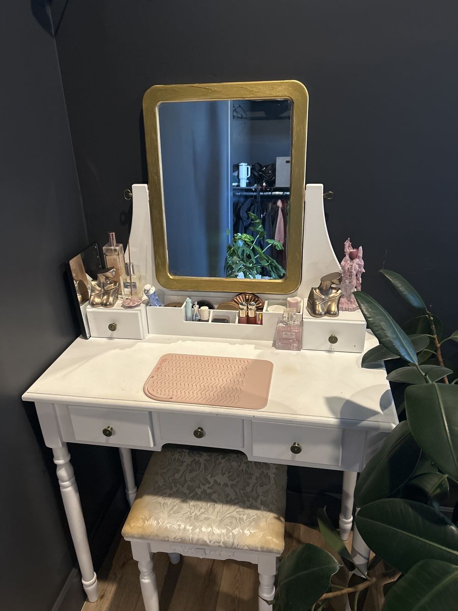 Vintage White vanity with attached gold framed mirror and matching bench.
