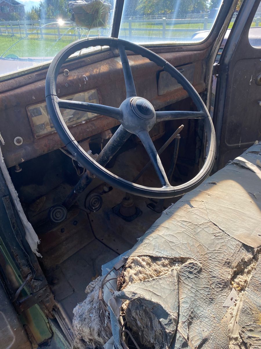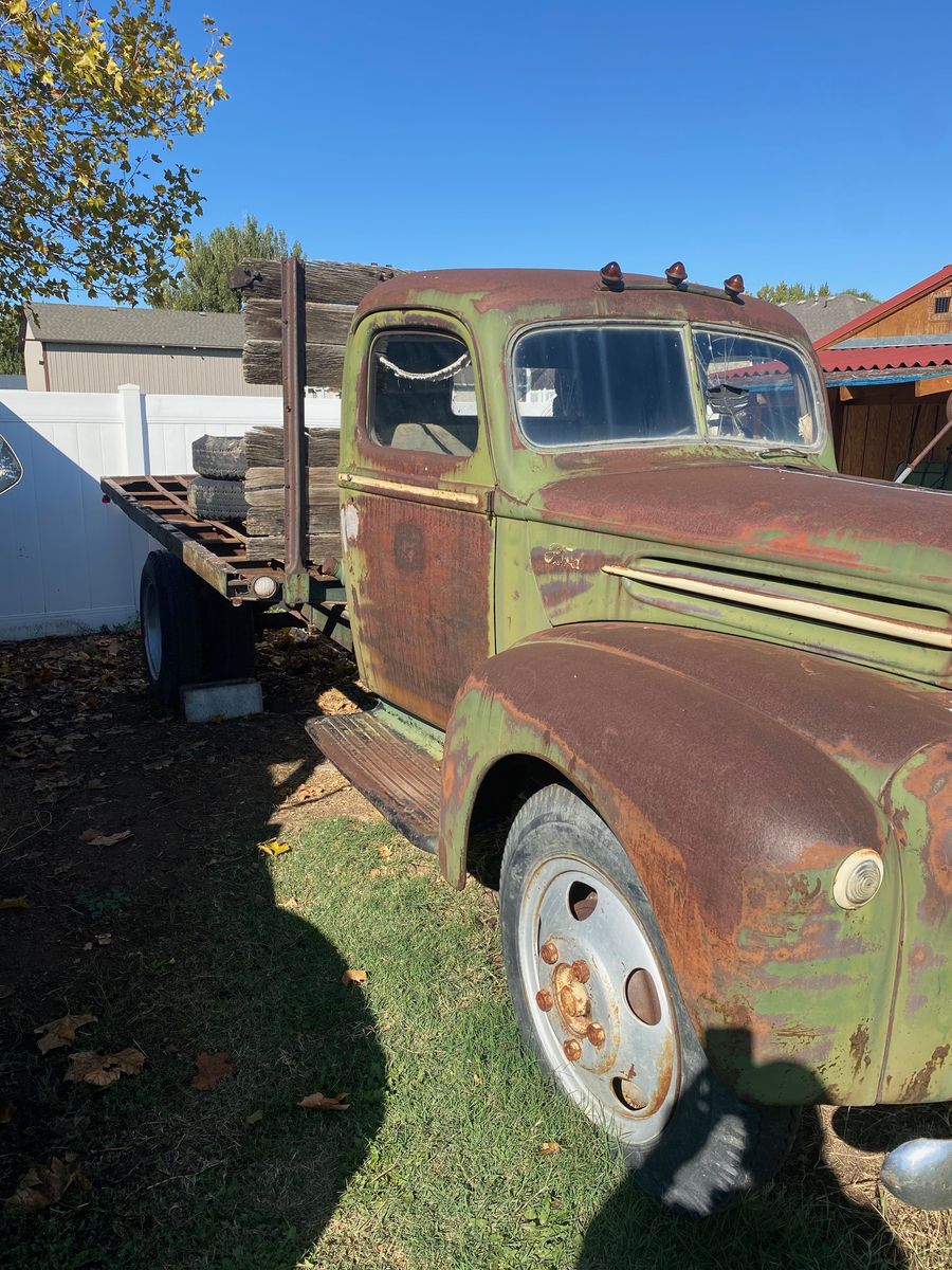 For sale is a 1947 Ford 1 ½ ton flatbed truck. This 158” wheelbase flatbed truck has a V8 flathead engine and a 4-speed transmission. The engine is stuck. Engine has a Ford “motor reconditioned” tag on it. The transmission and rear end are free. It includes 6 original style “lock ring” wheels and 4 modern wheels with good rubber. Cab floor is in amazingly good shape. Body is also in good shape. Bill of sale only. Is a great candidate to drop in a modern engine and tranny. Message to make an appointment with Dale to see this truck. $2,000 OBO. Cash only. No scams. No codes. No holds. Cash only.