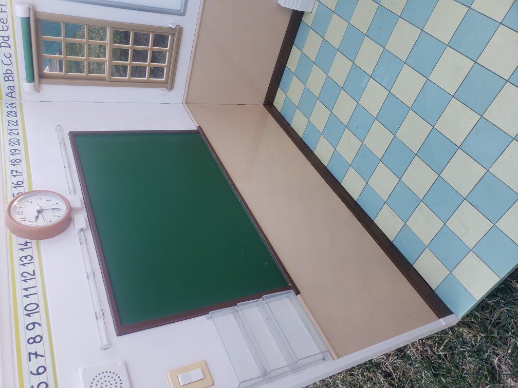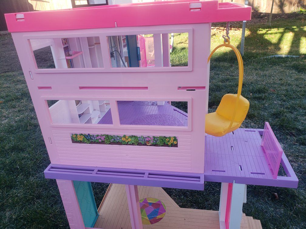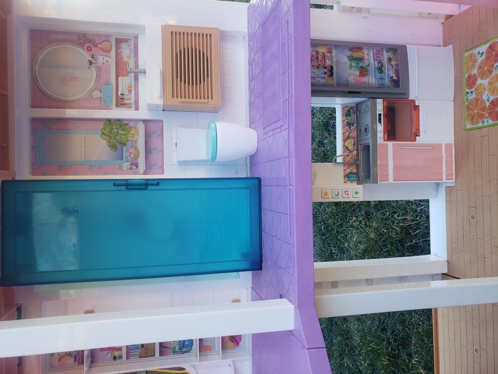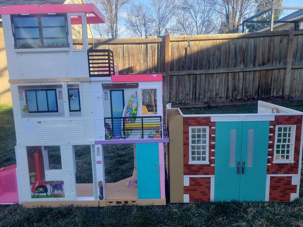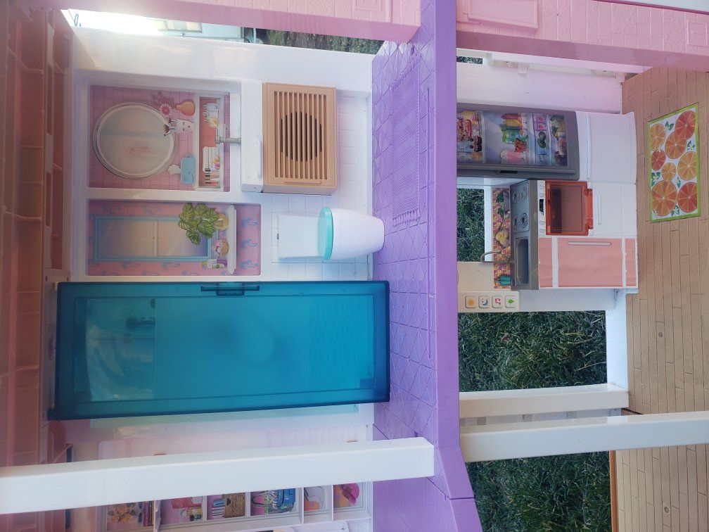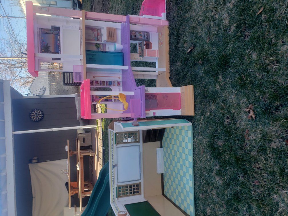 this Purchase includes a Used Barbie Dreamhouse that comes with a kitchen, living room, an elevator, a bedroom a dance room, and a Bathroom. The Schoolhouse included comes with a locker area outside the classroom, the inside includes a clock a white board, a chalk board, a vent and a Checkered patterned floor.