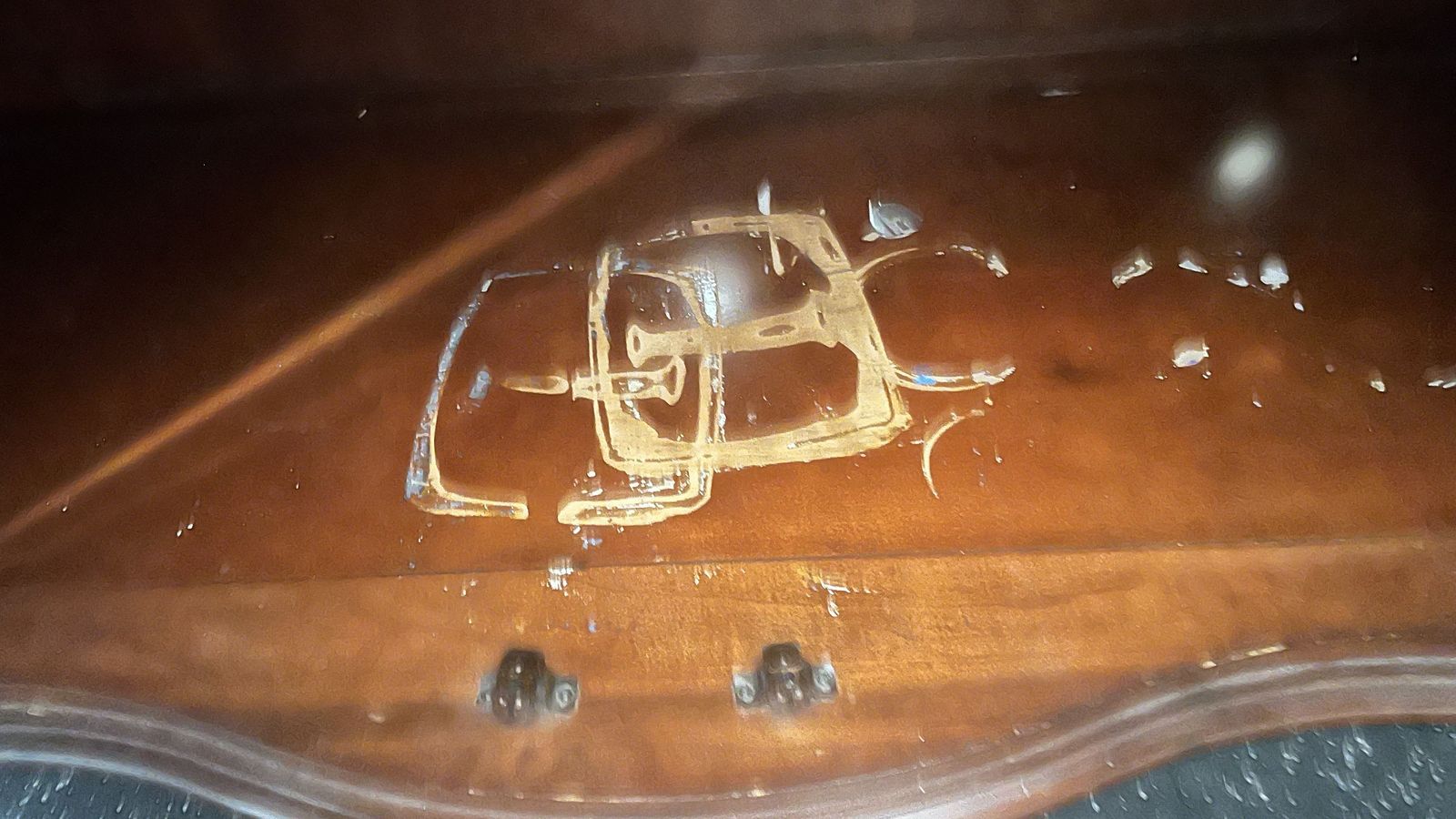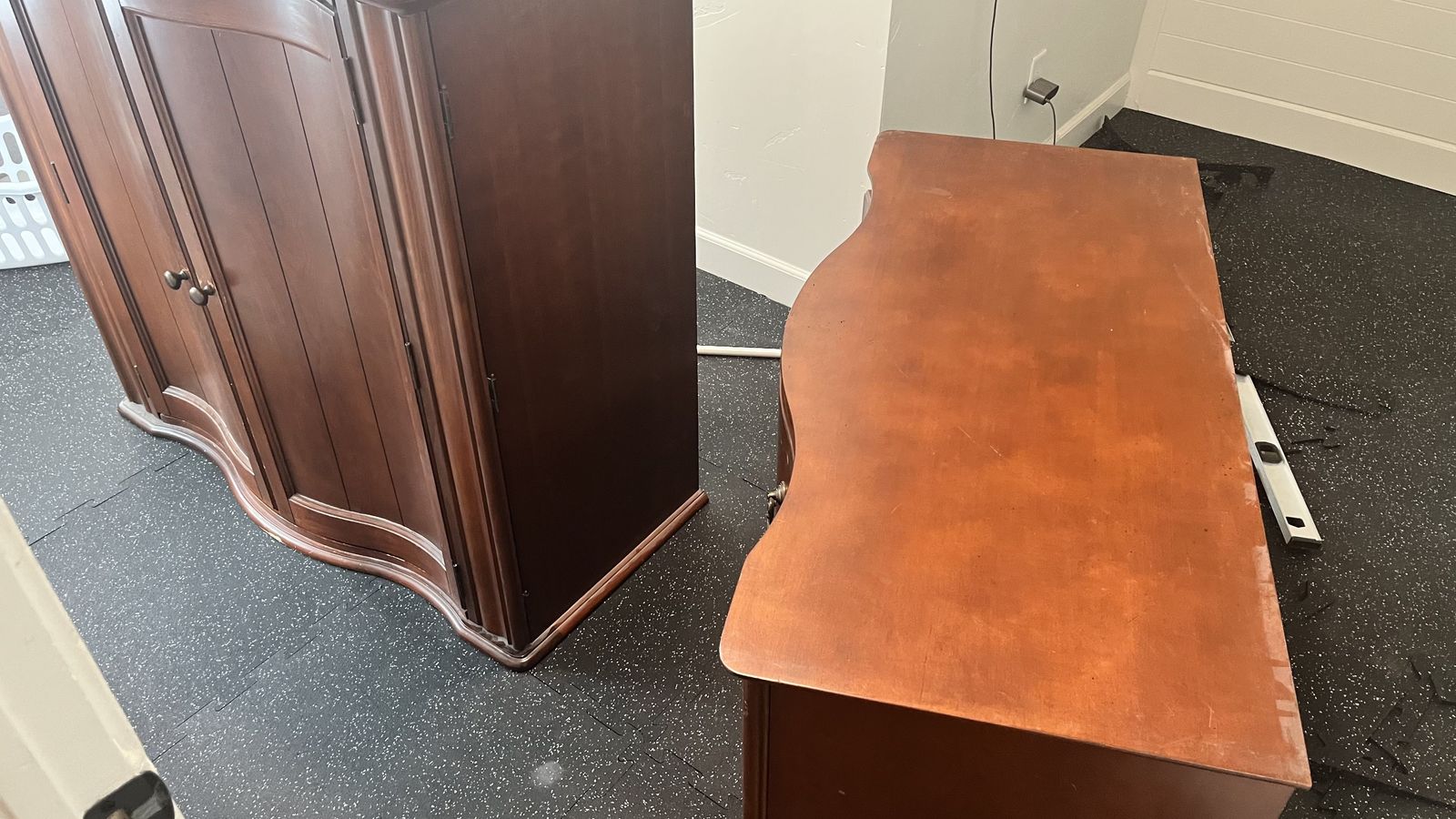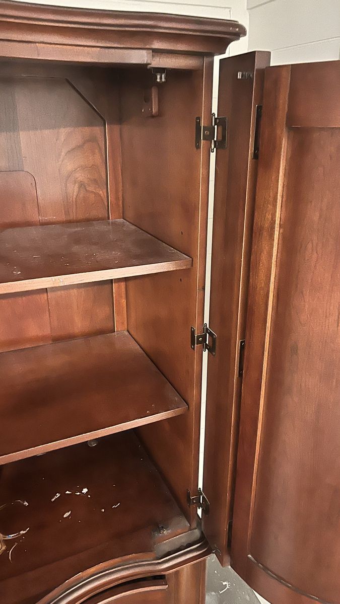 VenmoBeautiful 2-piece stacking armoire in cherry finish. Solid wood construction, extremely well-built and sturdy. Upper cabinet features two panel doors with interior shelving; lower base has two serpentine-front drawers with antique brass hardware. Interior bottom has large flaw where the finish was removed. Some nicks on the door edges, but overall in good shape.