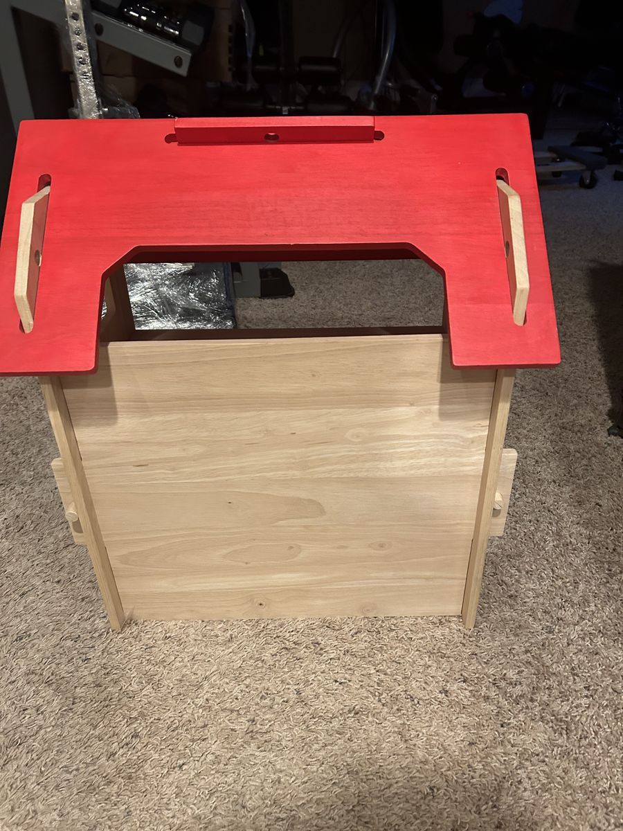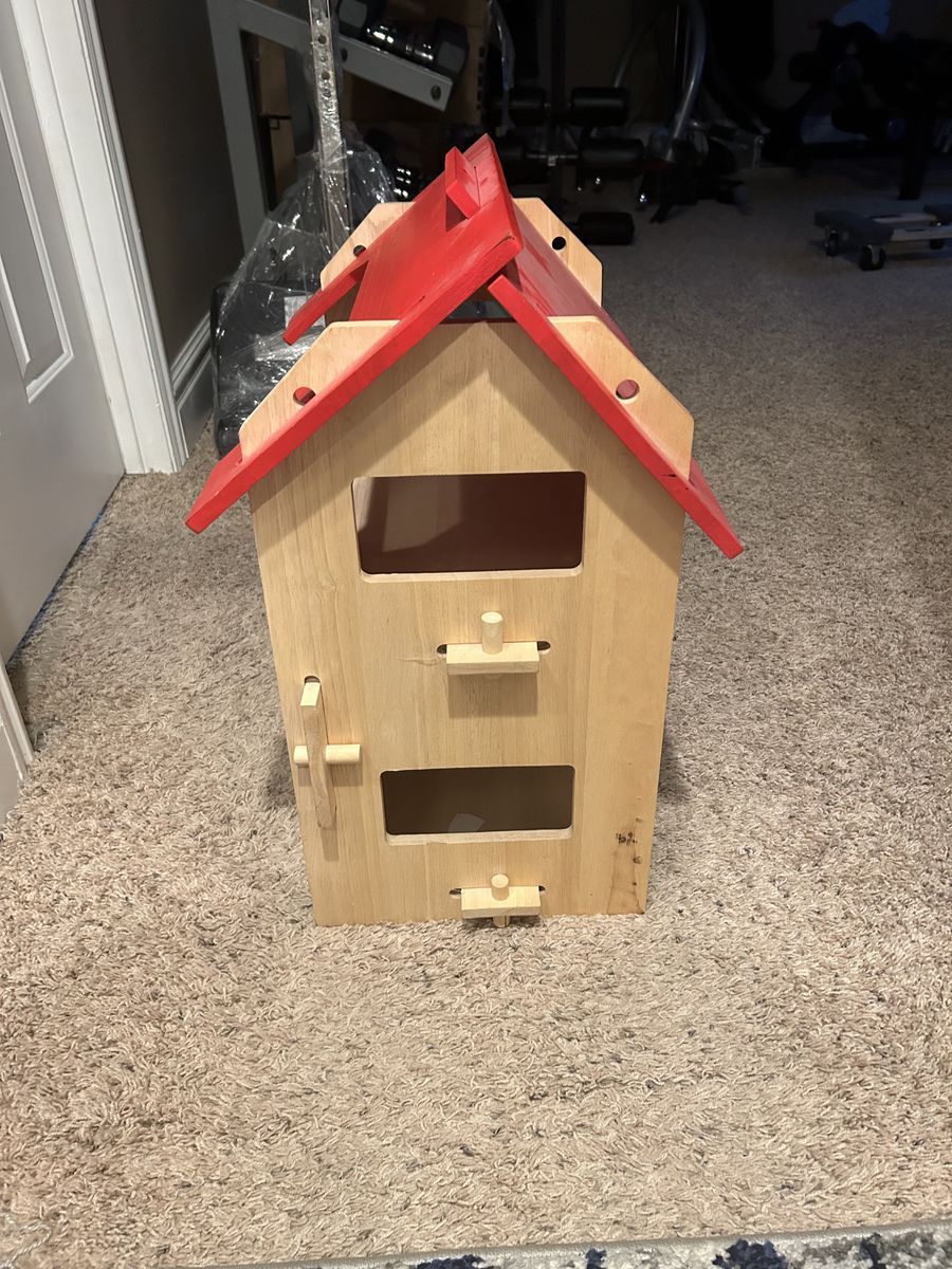 VenmoFun wooden dollhouse/playhouse in good condition with a bright red roof and natural wood finish. Perfect for dolls, figurines, or imaginative play. The open back makes it easy for kids to play inside, and it has windows, a door, and interior shelf space.
