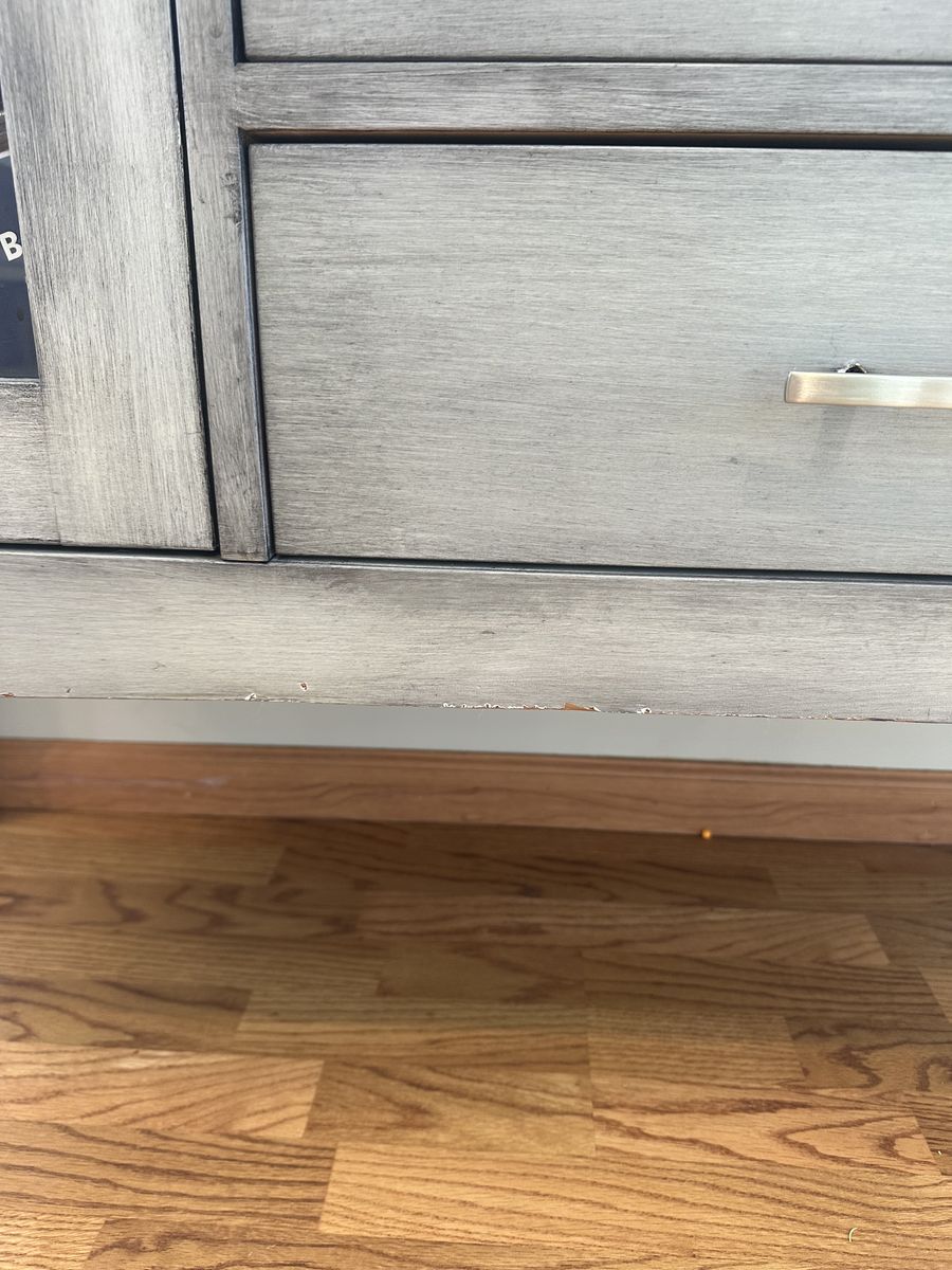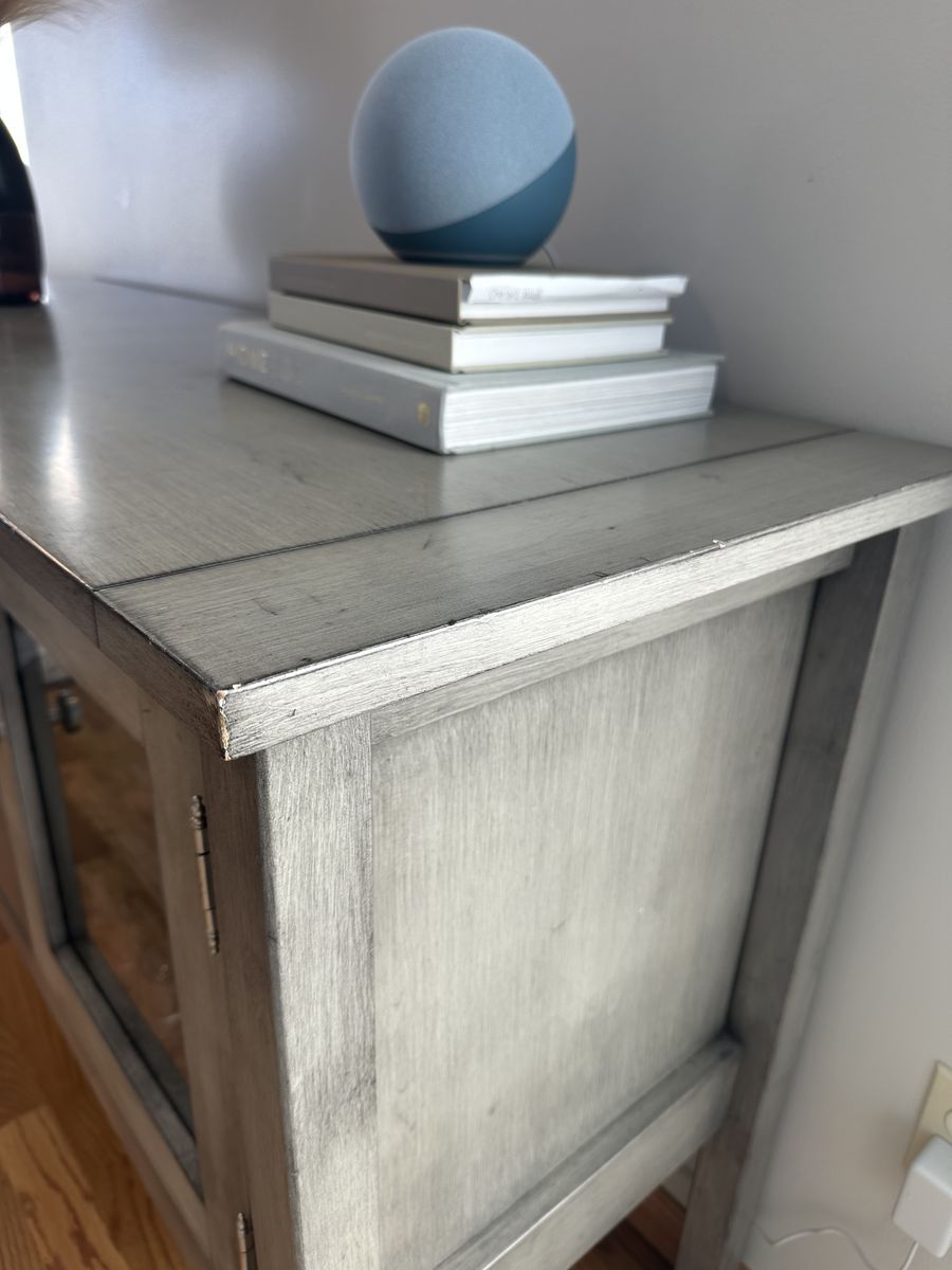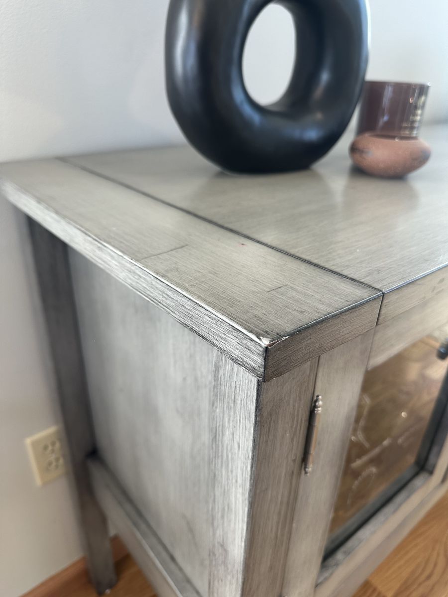 VenmoThis sideboard is solid wood and custom painted. 3 drawers and two glass cabinets with adjustable shelves. There are some scuffs as pictured. Dimensions: 60”W x 19”D x 34.5”H
