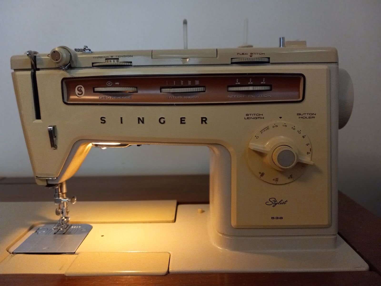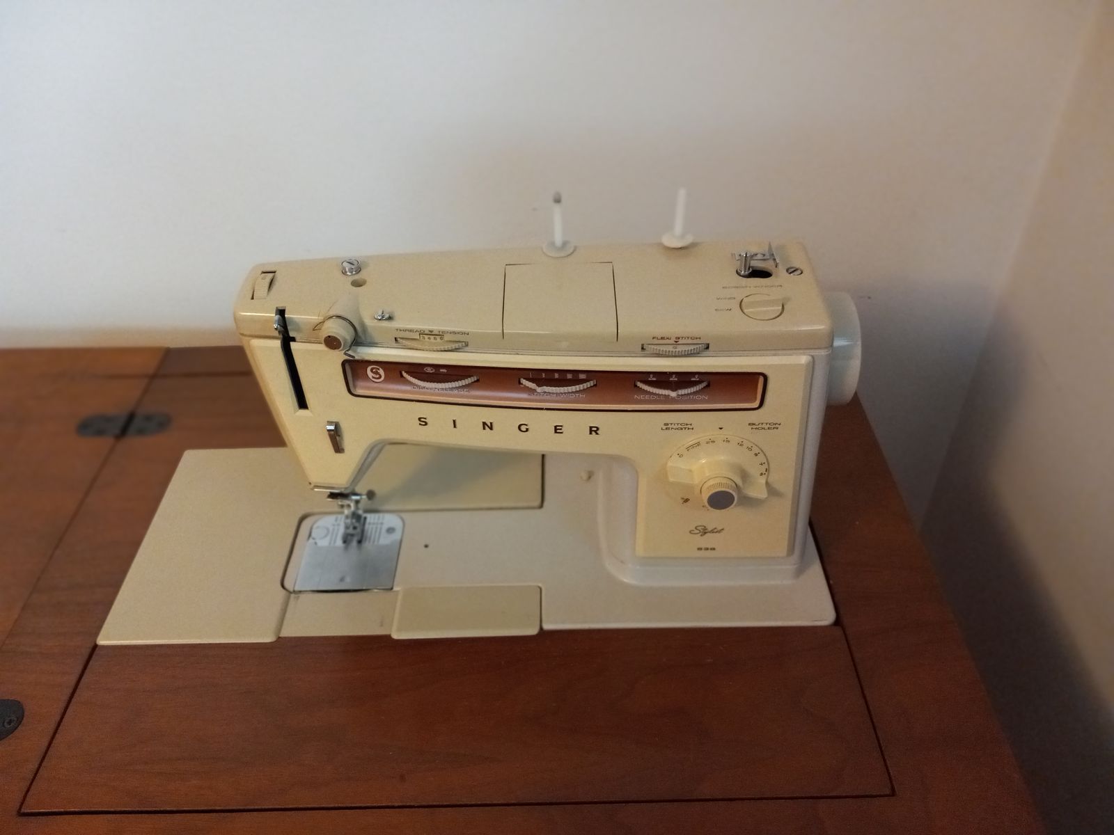 Singer Stylist 538 sewing machine with cabinet. Convertable free arm. Zig-Zag and Flexi-Stitch Discs for various stitch patterns. Twin-Needle Stitching, Buttonholes. Includes book. Machine runs and works, could use a cleaning and oiling. $140.00. cash only. Text only 801-668-7992.