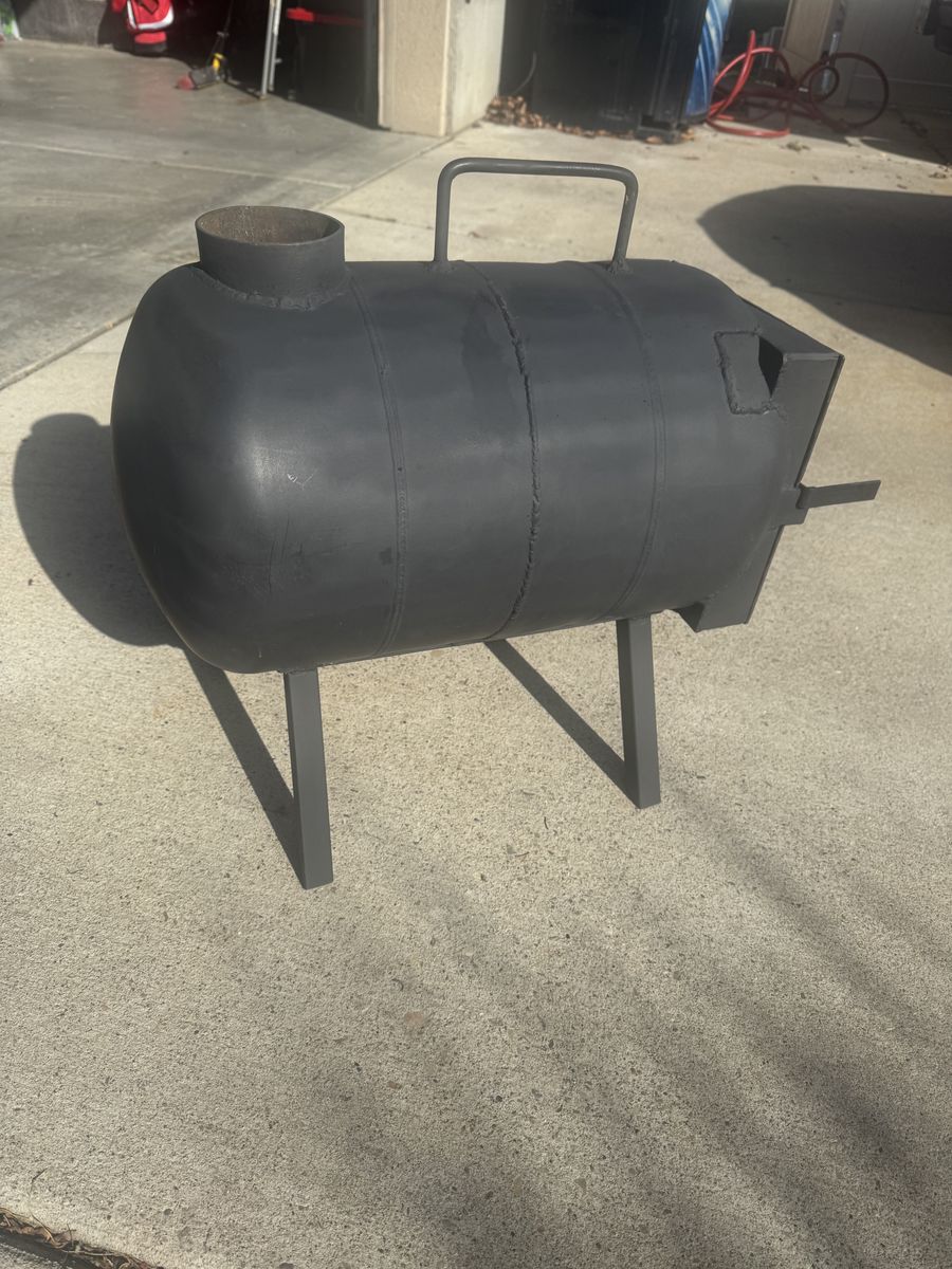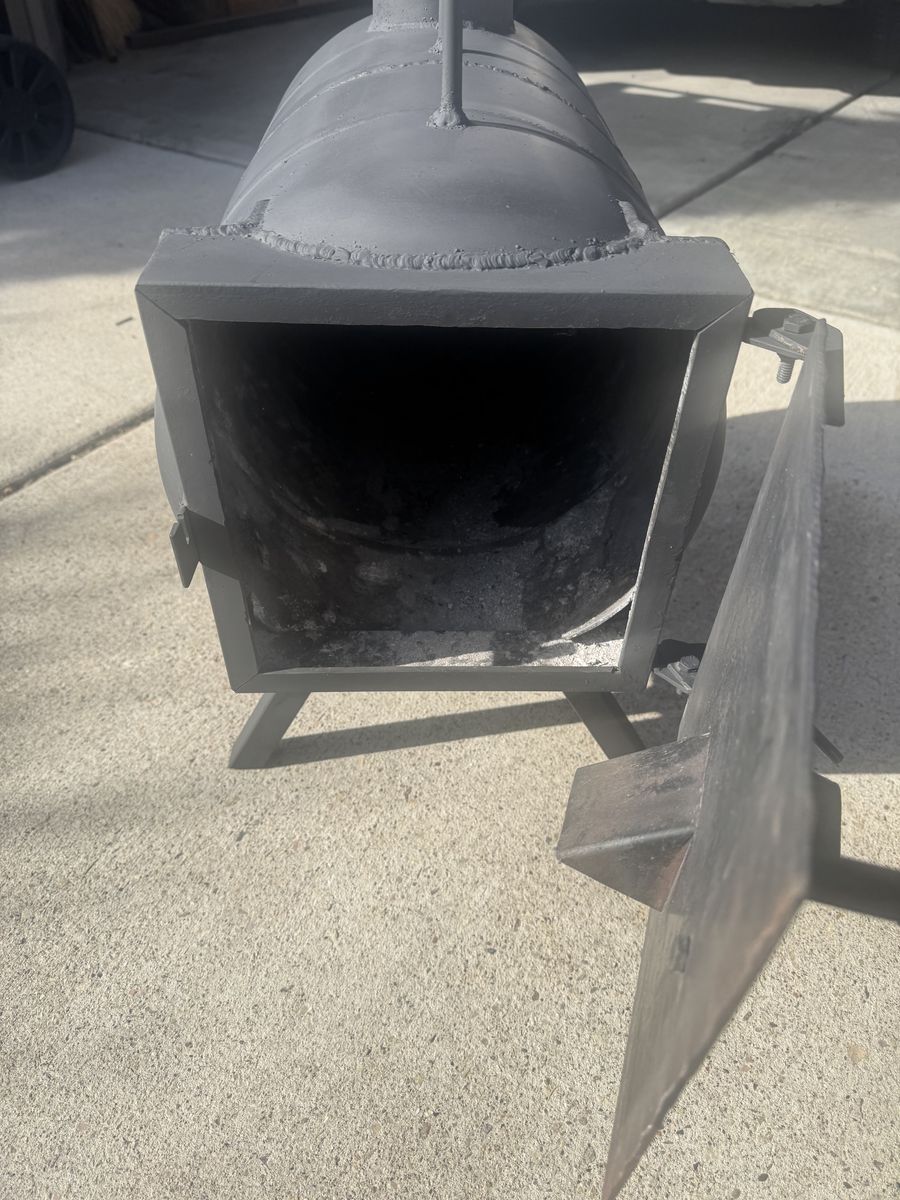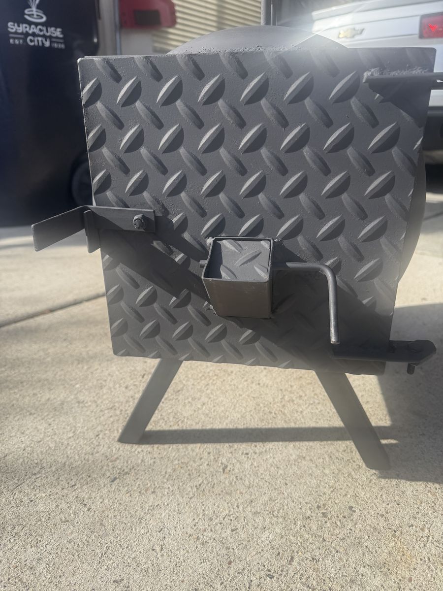 Heavy Duty tent stove for sale. Works great! Made out of two propane tanks. Thicker walls retain/radiate heat. Great for use in a wall tent or teepee tent. Has a carrying handle built into it. Damper on front door is designed to prevent embers from dancing out of stove. The door is larger to allow wood to be loaded with ease. Has been painted with high heat paint and seasoned for use in a tent. It accepts 4” stove pipe. Stove pipe not included. Text is best since I am not always able to answer calls where I am working.