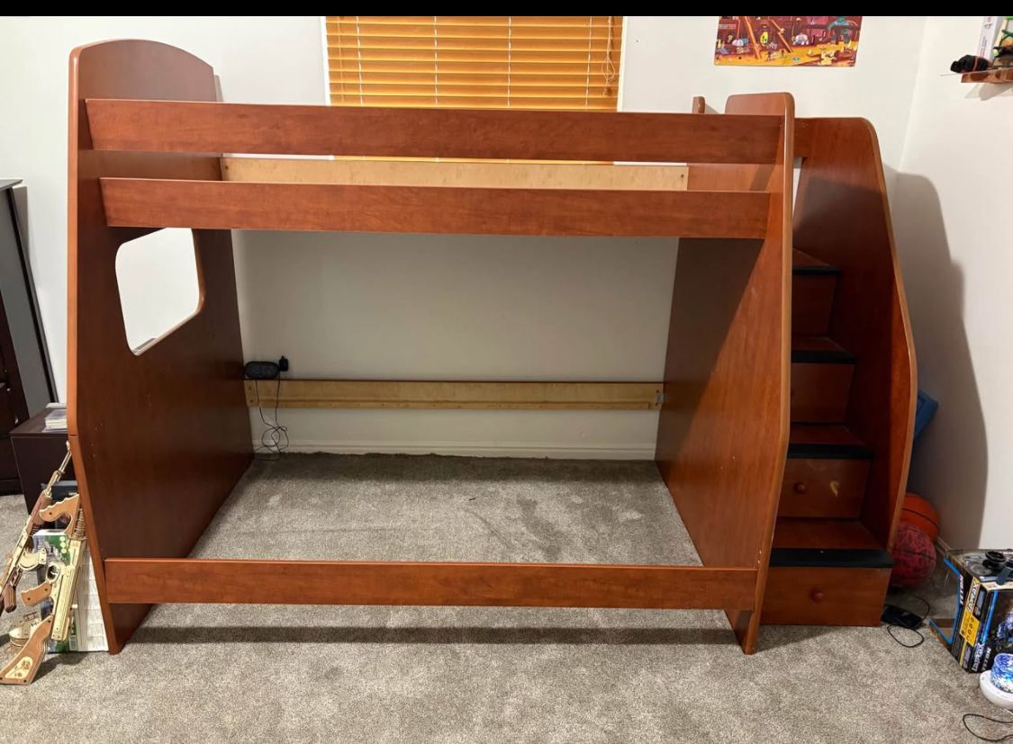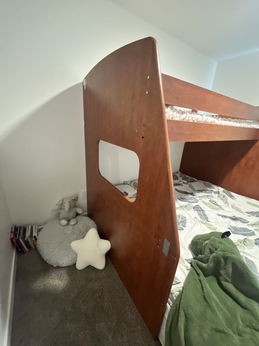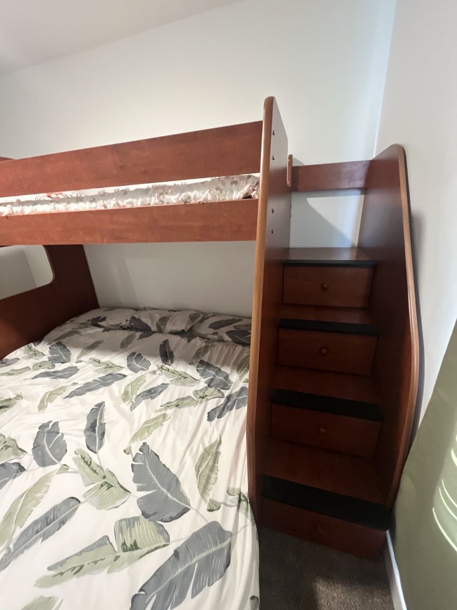 • Solid hardwood construction; additional hardware • Very sturdy and stable; steps with storage • Made by Berg Furniture (high quality brand) • Has normal cosmetic wear from use but functions great • Disassembled for pick up; Spanish Fork