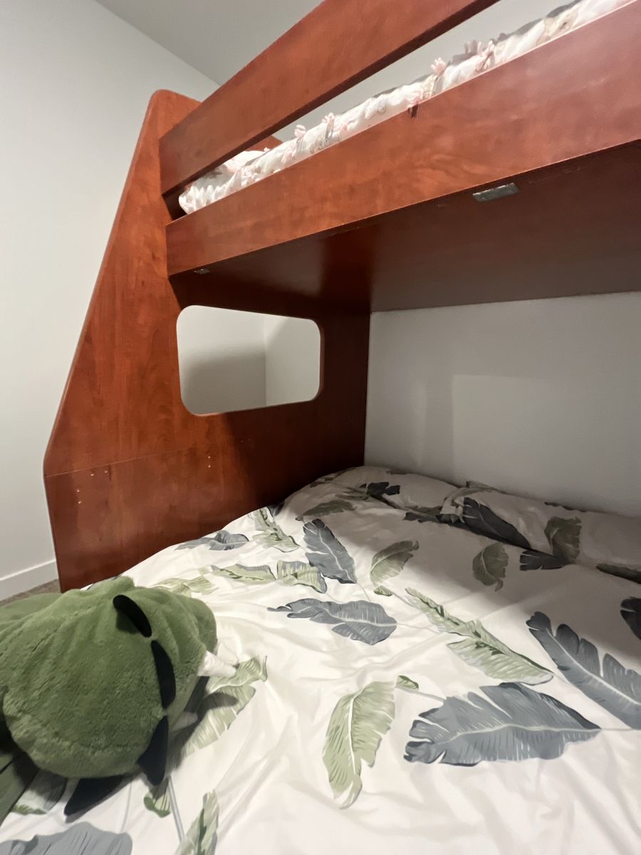 The loft bed fits a twin mattress on top, and the space underneath can fit a full or larger depending on orientation (currently used with a king mattress). Great for kids sharing a room or maximizing space.