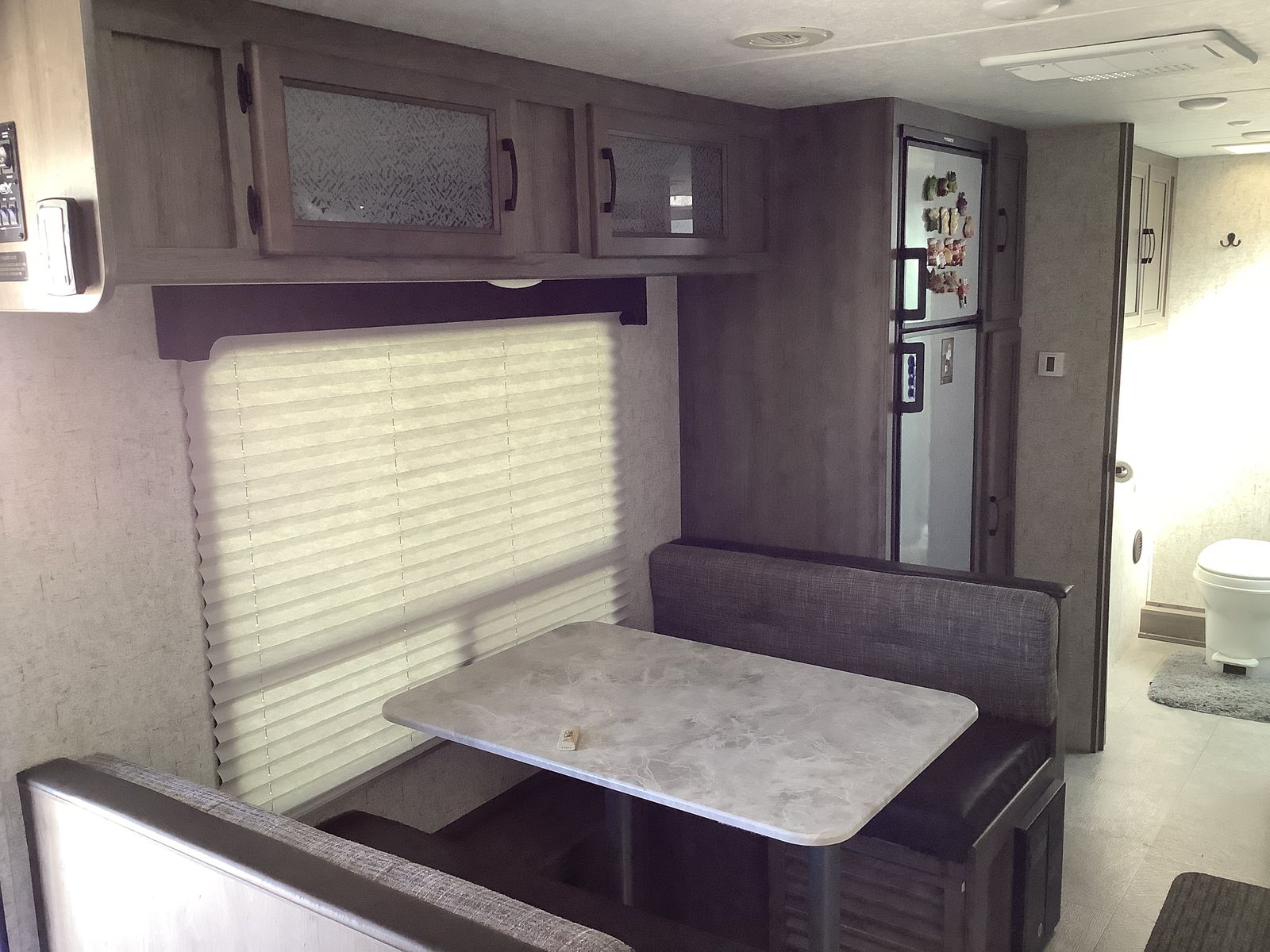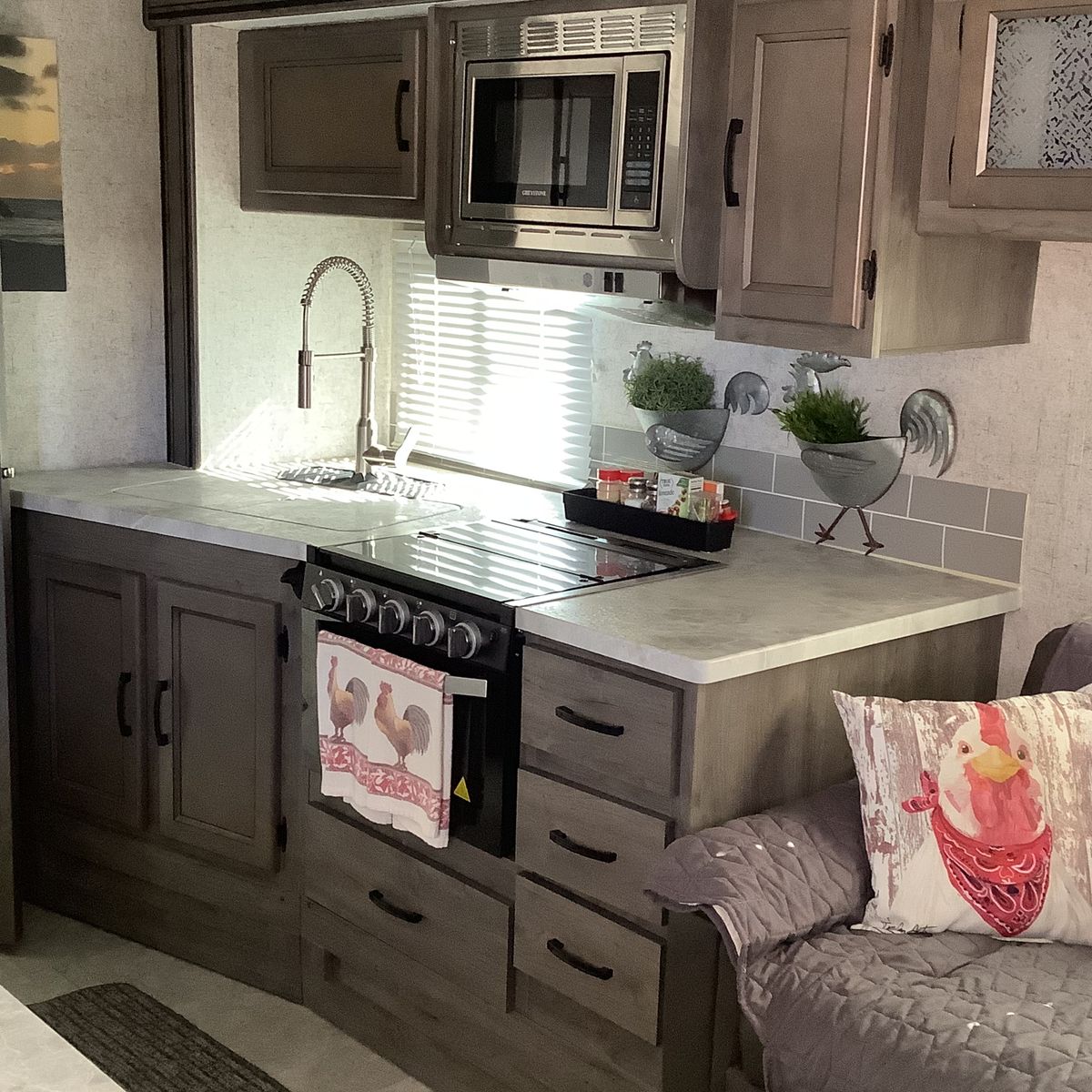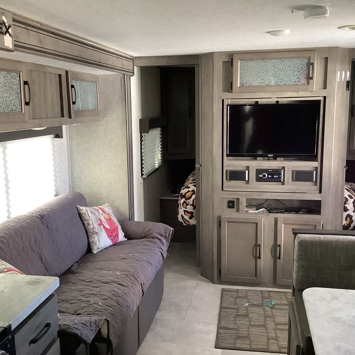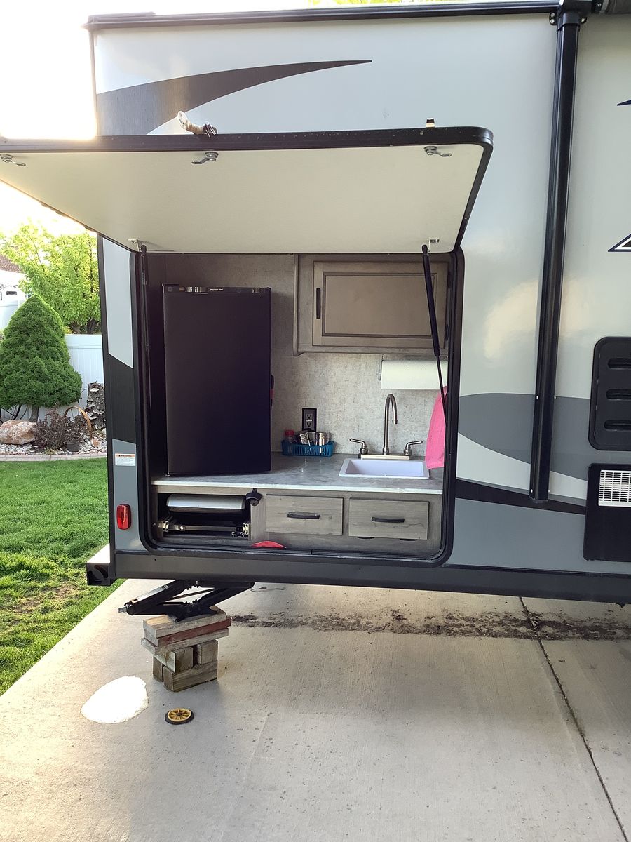 Like new with ample storage inside and outside. Very roomy rear bathroom with extra large cabinets for storage. Queen bed, fold down sofa, and dining table for sleeping. Convenient outside kitchen with fridge, grill, sink, cabinets and gas grill. This trailer is in excellent condition.