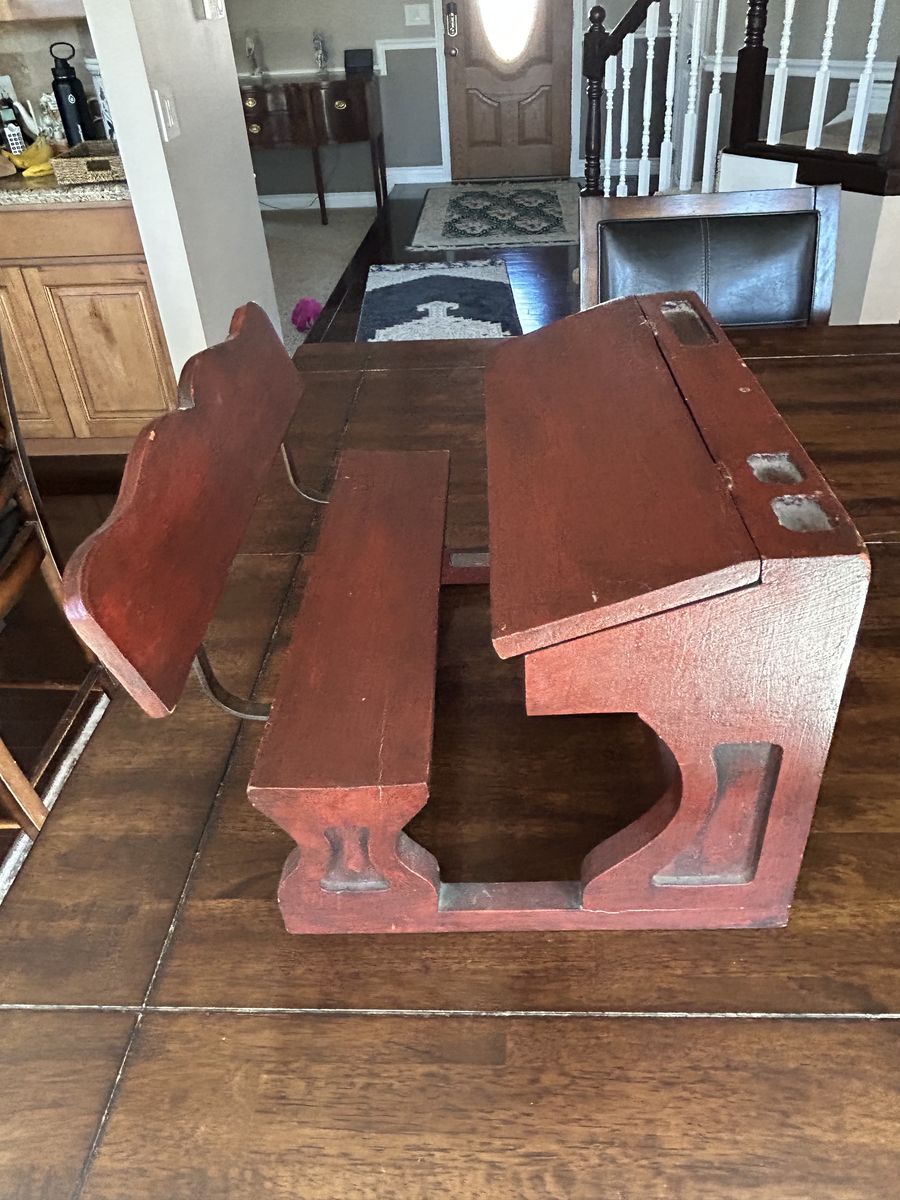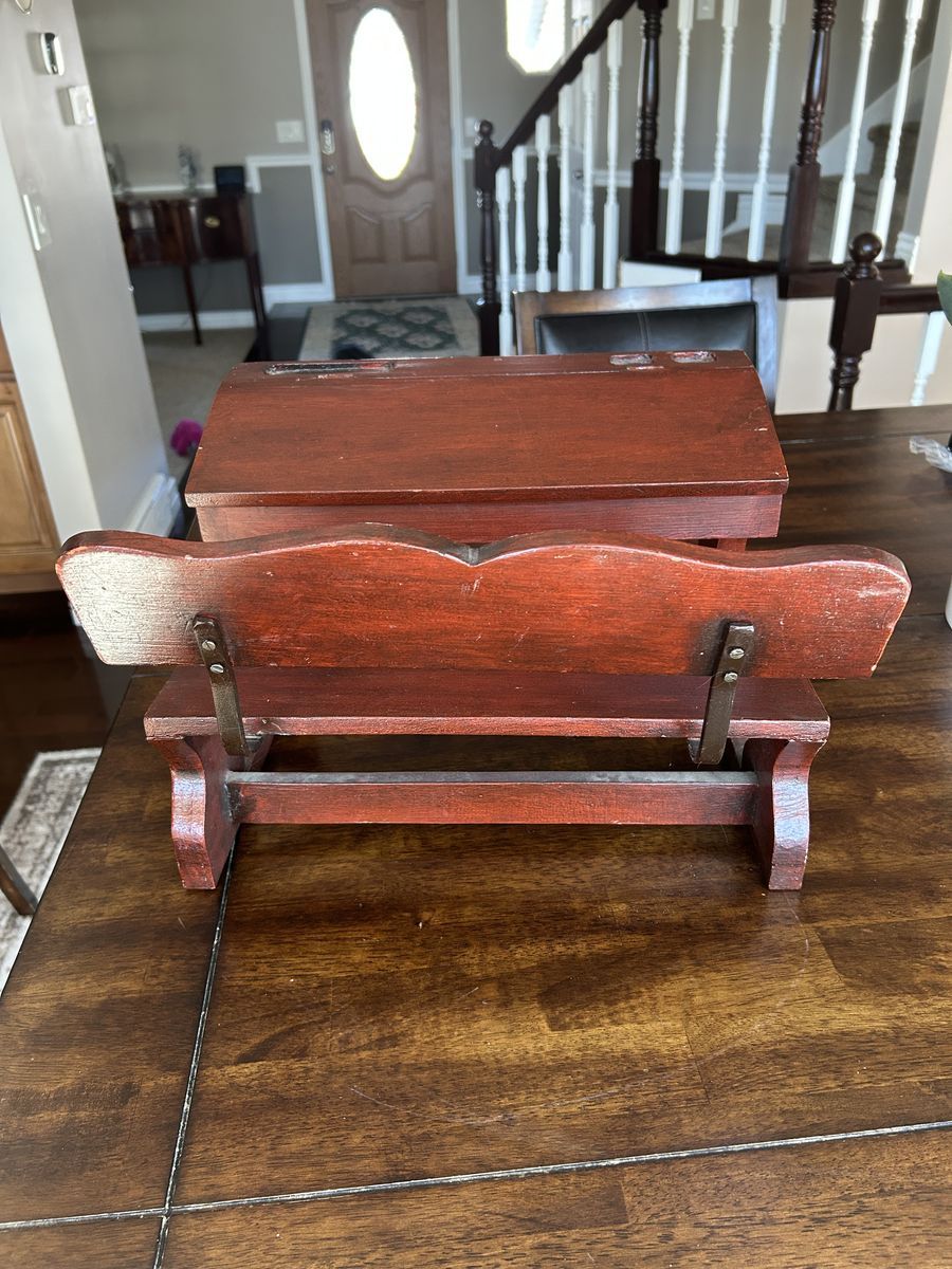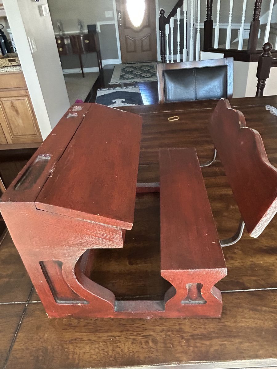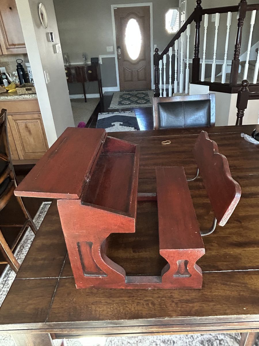 VenmoAdorable vintage-style wooden school desk with attached bench, scaled for dolls. Solid wood construction with a warm reddish finish and classic old-school design. The slanted top lifts open for storage, just like a real antique school desk!