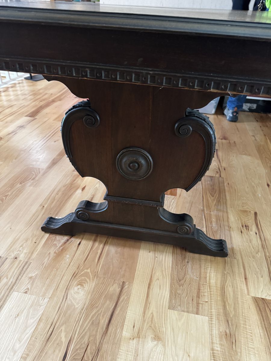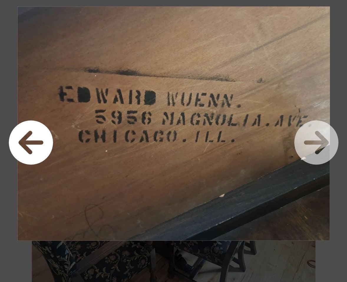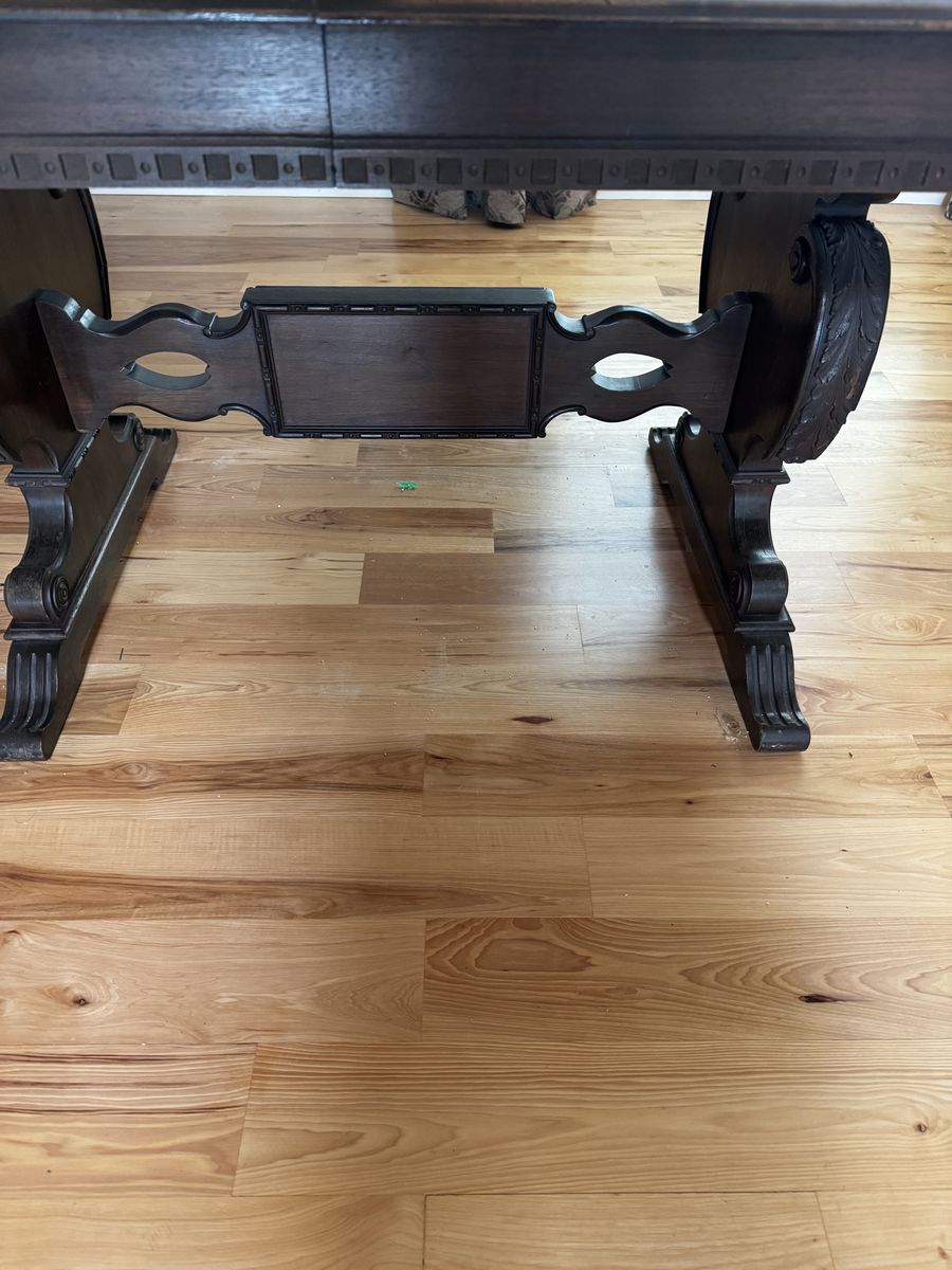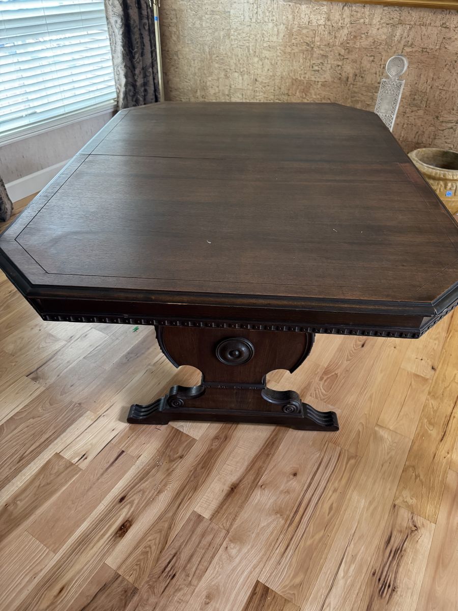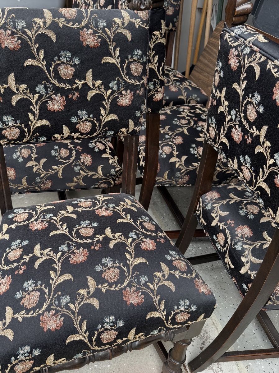 60”Lx40”Wx30”H Edward Wuenn Beautiful hard wood table and 6 chairs, one is a captains chair. Chairs have black Edwardian fabric that is clean. Make this your new family dining table. There are no extra leafs.