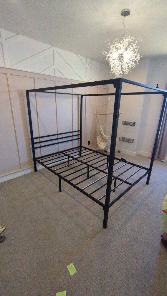 Venmowe are moving and are no longer in need of this bed frame. it's a queen size bed. It measures 6 ft high. nothing's bent or scratched it's in great shape.