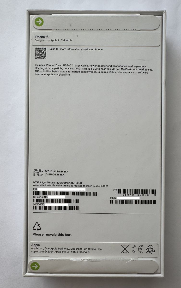 Apple iPhone 16 in original box with USB-C Cable