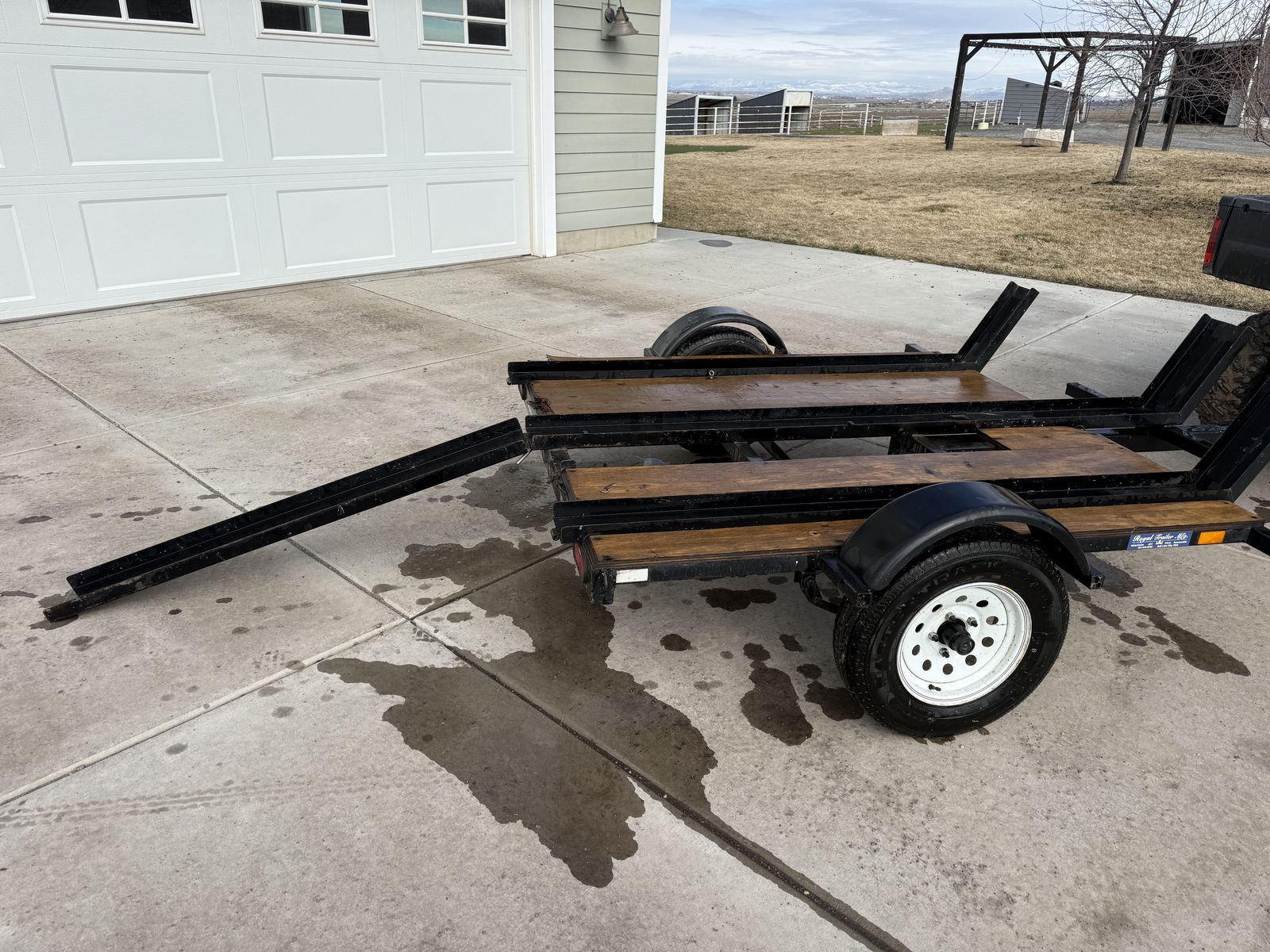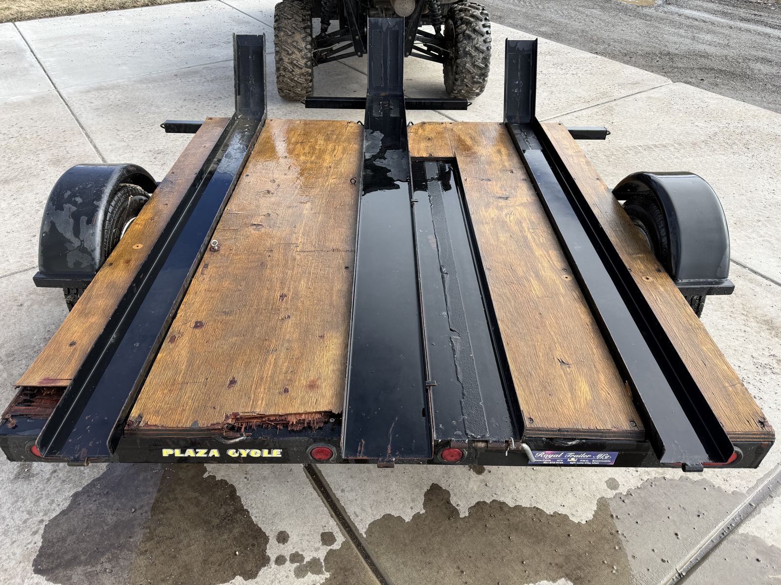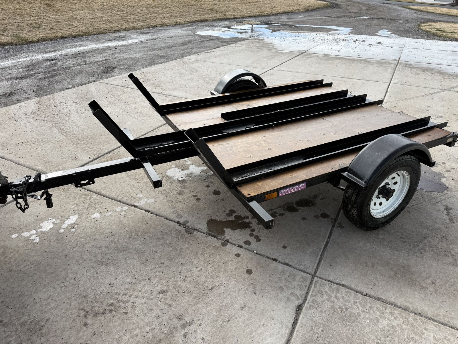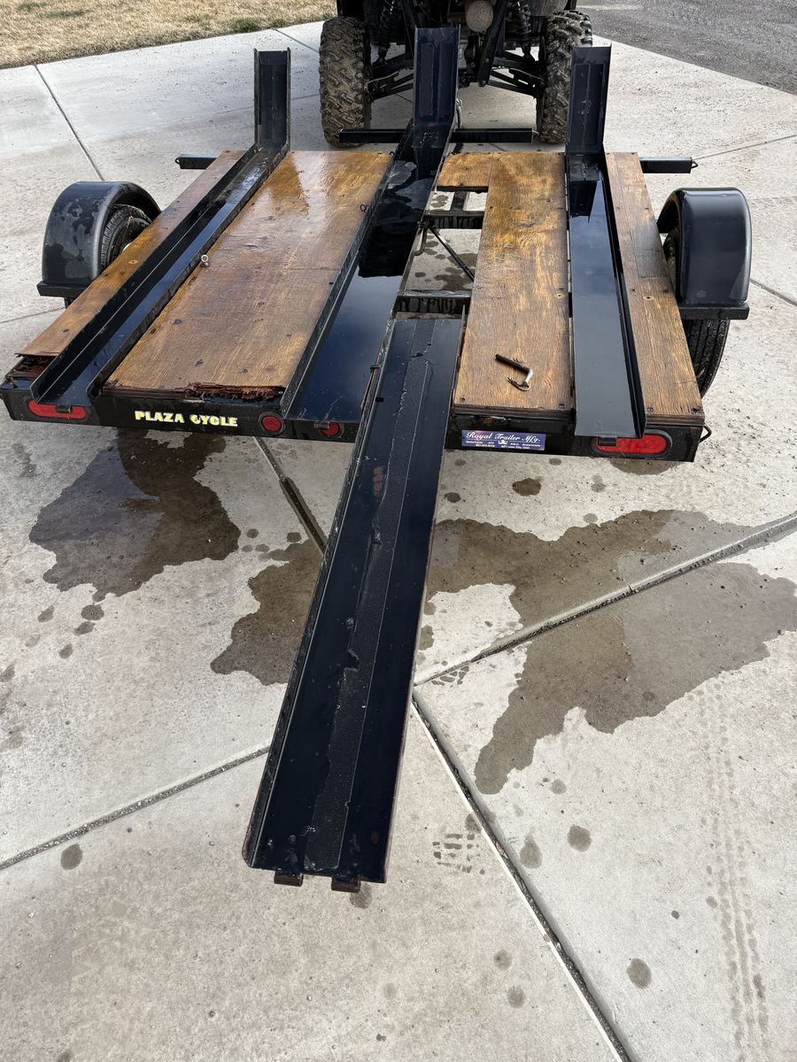 ApplePayVery nice 3 place trailer made by Royal Trailer mfg. Larger tires which is safer on the road especially for longer trips at higher speeds. Trailer is in great condition just not using it anymore. The ramp stores easily and has all the deck covered so it’s easy to stand on and load bikes. Plenty of places to hook bikes down. 2” ball. Call or text with questions.