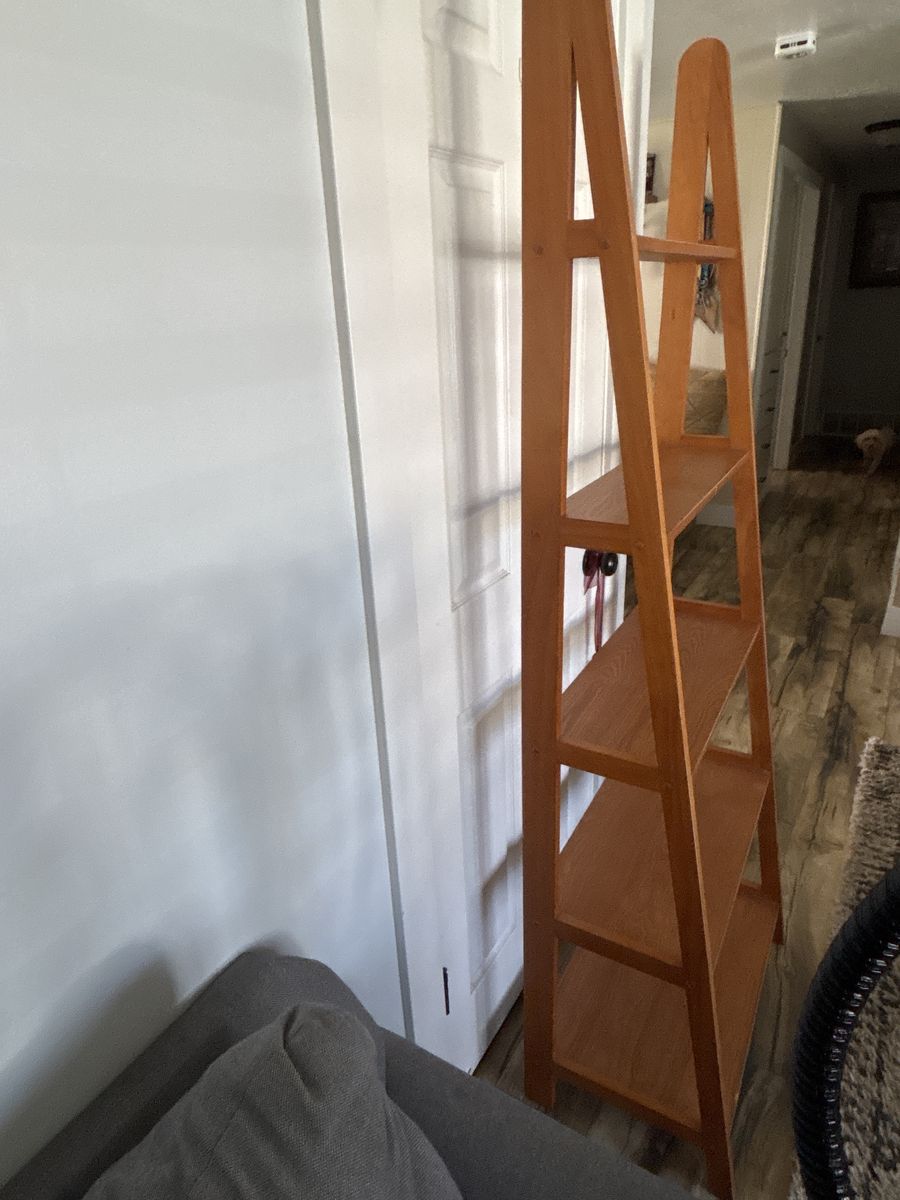 VenmoNice tapered shelf great for books or knickknacks. Small spot of putty that could be sanded down or maybe even Goo b gone. Applied to Wood remove it. Shelf is in great condition.