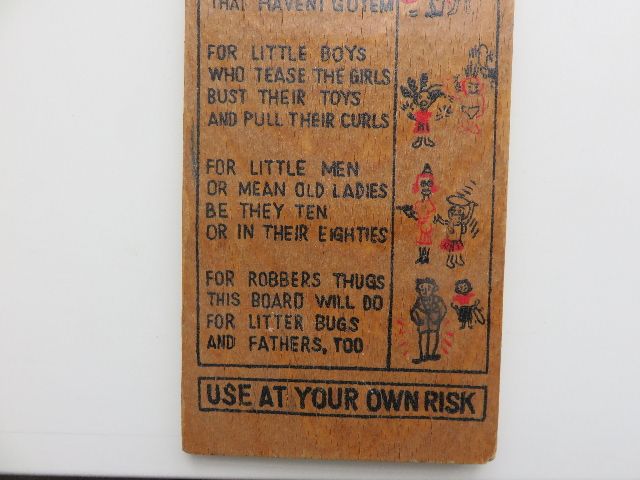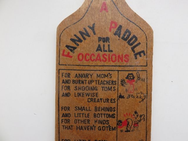 I am pretty sure this wooden "Fanny Paddle for All Occasions" is from the late 1940's from what my parents said. It was displayed in our kitchen for as long as I can remember, and that is a long time!