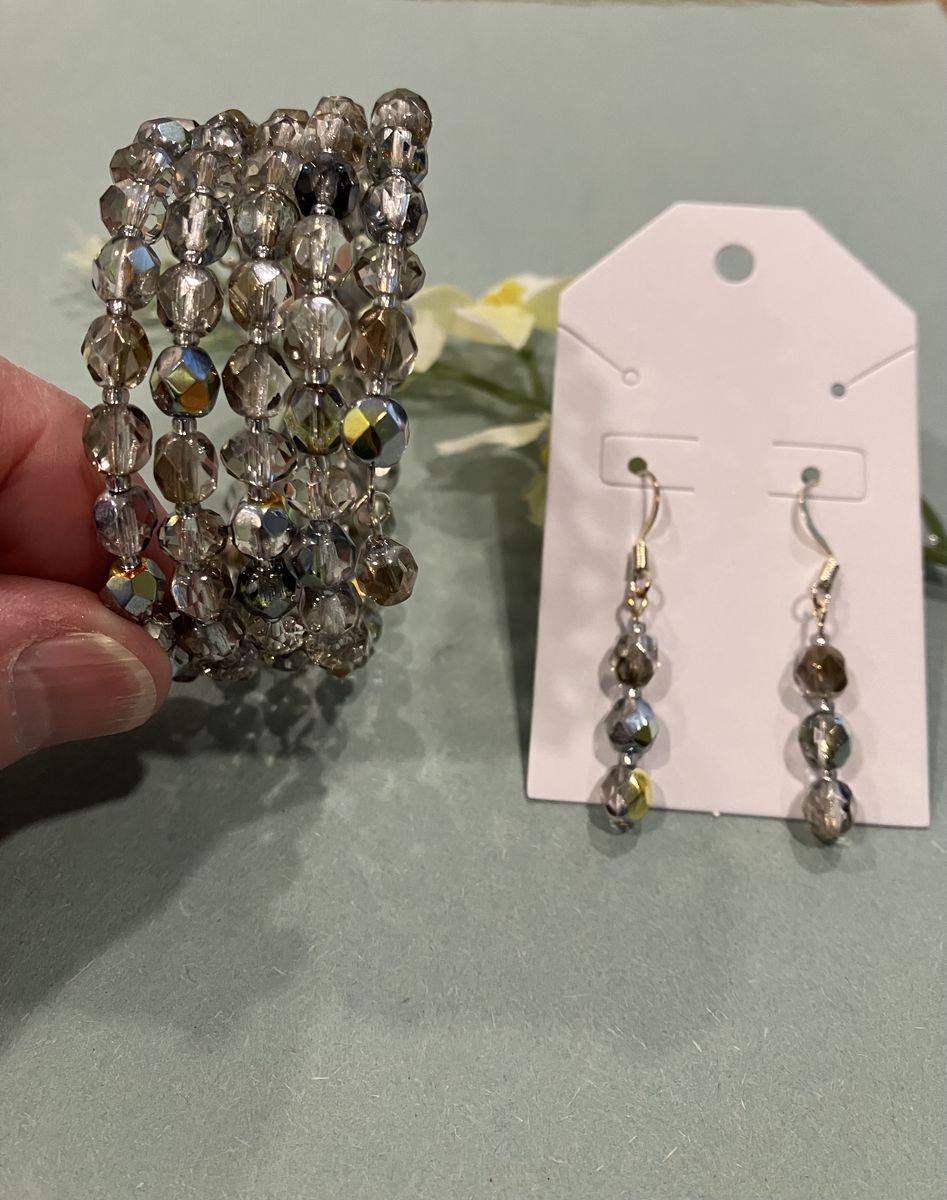 VenmoBeautiful, Czech Crystal, multiple coil bracelet and matching earrings, all in silver, gray, blue and gold colored tones. Bracelet comfortably fits up to a size 6 inch wrist. Ear wires are silver plated. Gift box included. Local meetup or can mail with ship fee.