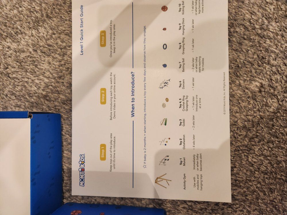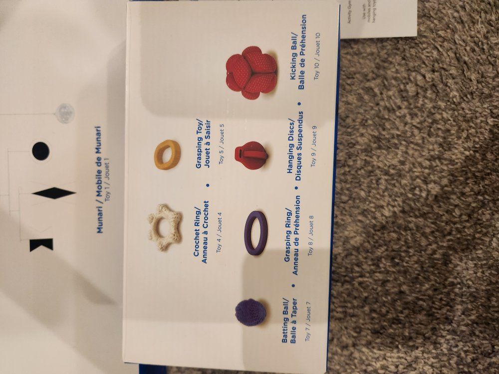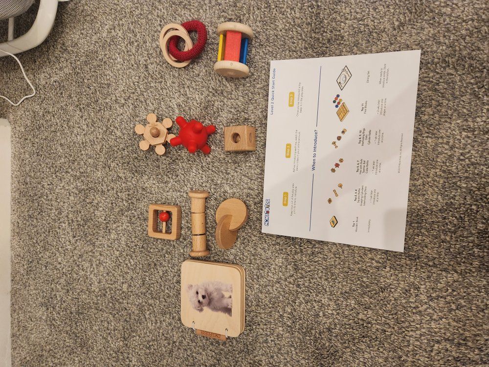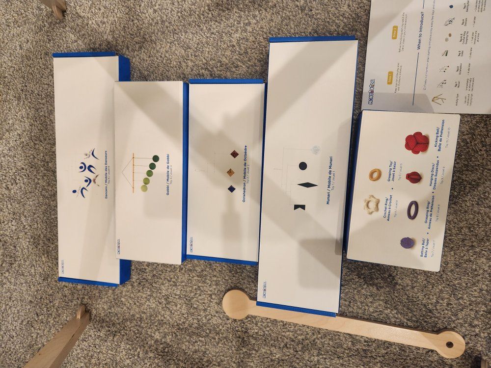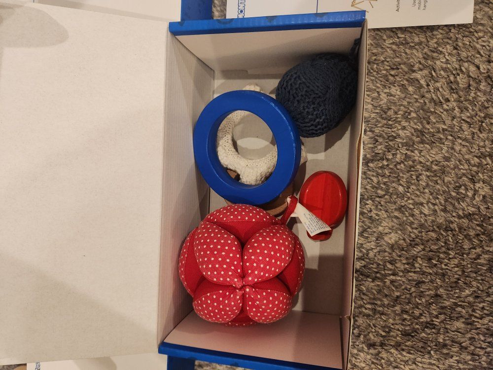 Great condition montessori toys from Monti Kids, most still look brand new. There is one blue ball where the loop broke and would need to be glued back (pictured), and one rattle is missing from the level 2 rattles.
